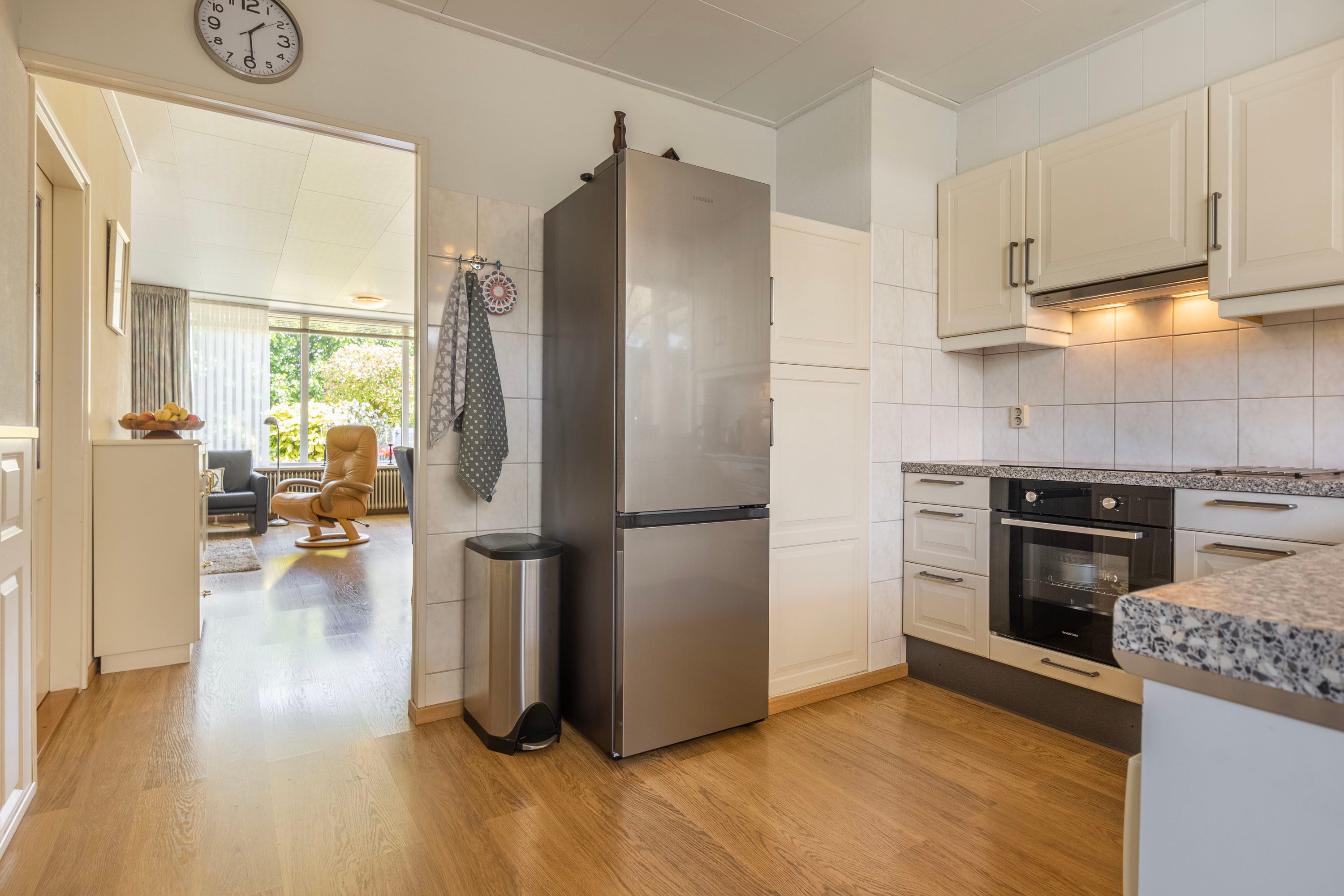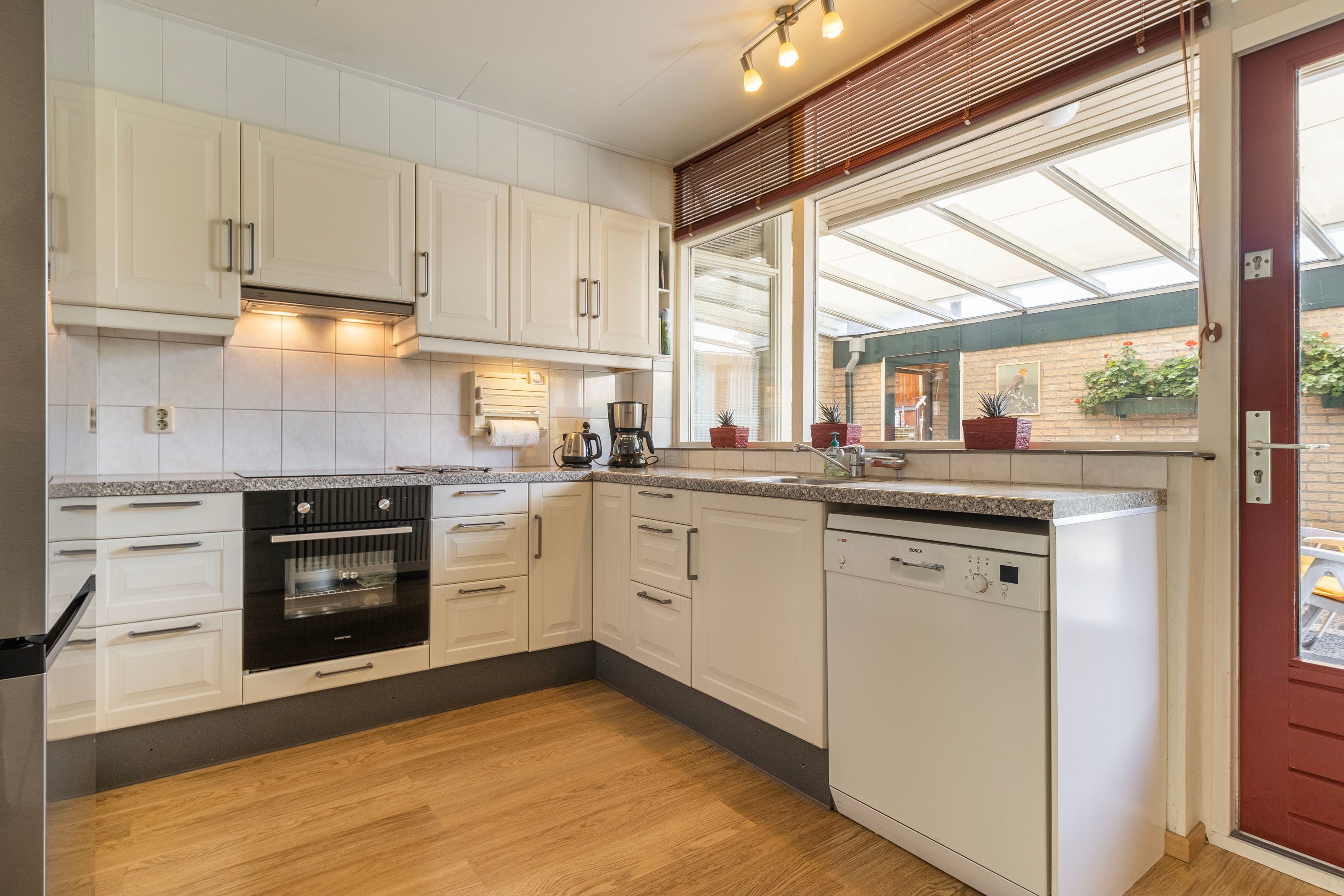 Via de entree, die toegang biedt tot zowel de eerste slaapkamer als de badkamer, kom je in de lichte woonkamer. Dankzij de vele raampartijen voelt deze ruimte bijzonder ruimtelijk aan en heb je een fijn uitzicht op de voortuin. De woonkamer staat in verbinding met het eetgedeelte en de L-vormige keuken. Deze keuken is uitgerust met diverse inbouwapparatuur en biedt volop ruimte om comfortabel te koken.