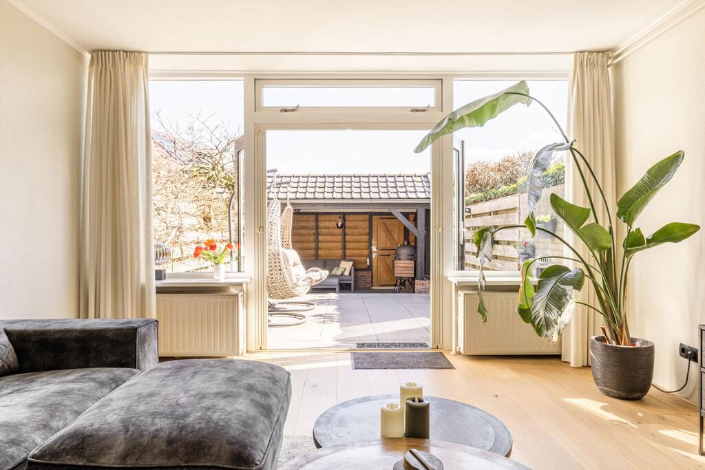 Tussen de woon-/leefkeuken en de woonkamer bevinden zich de en-suite schuifdeuren met inbouwkasten. Hierdoor beschik je naast een woon-/leefkeuken ook over een afsluitbare woonkamer. Eenmaal voorbij de en-suite deuren betreed je de woonkamer. Een heerlijke en ruime woonkamer met prettig uitzicht op de verzorgde achtertuin. Via de openslaande tuindeuren bereik je de verzorgde achtertuin.