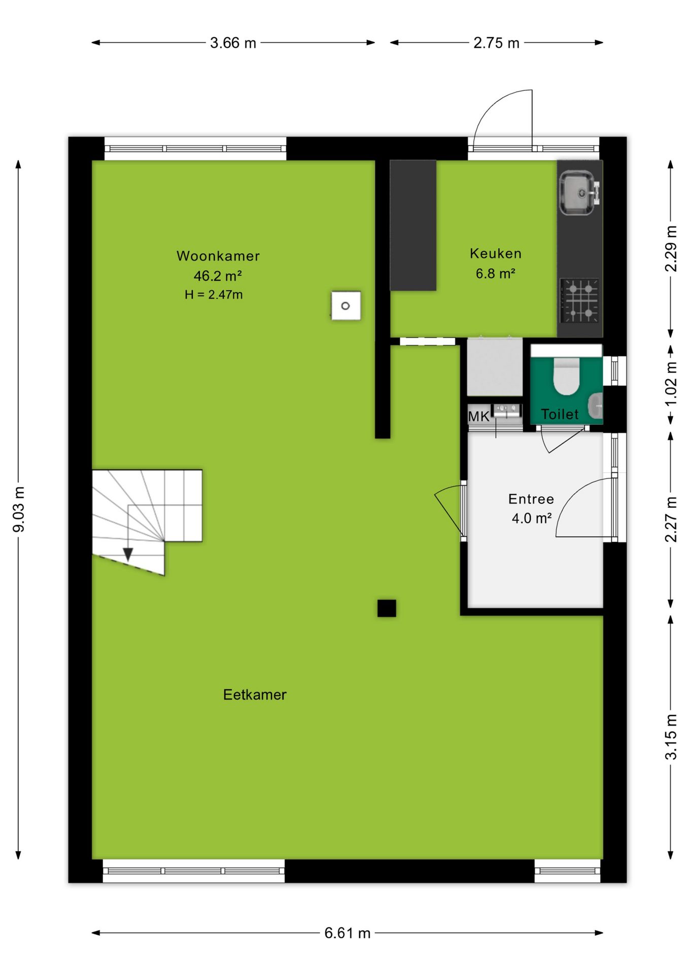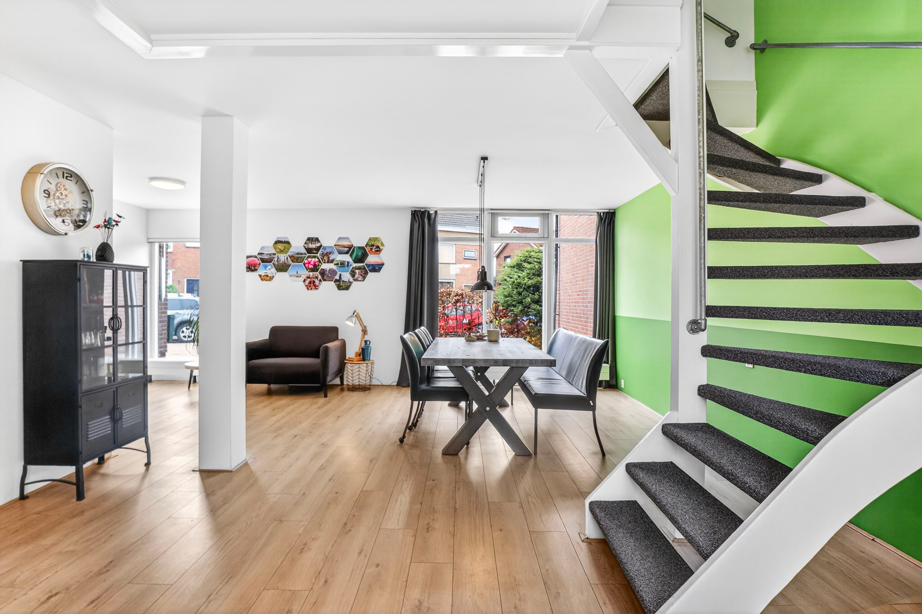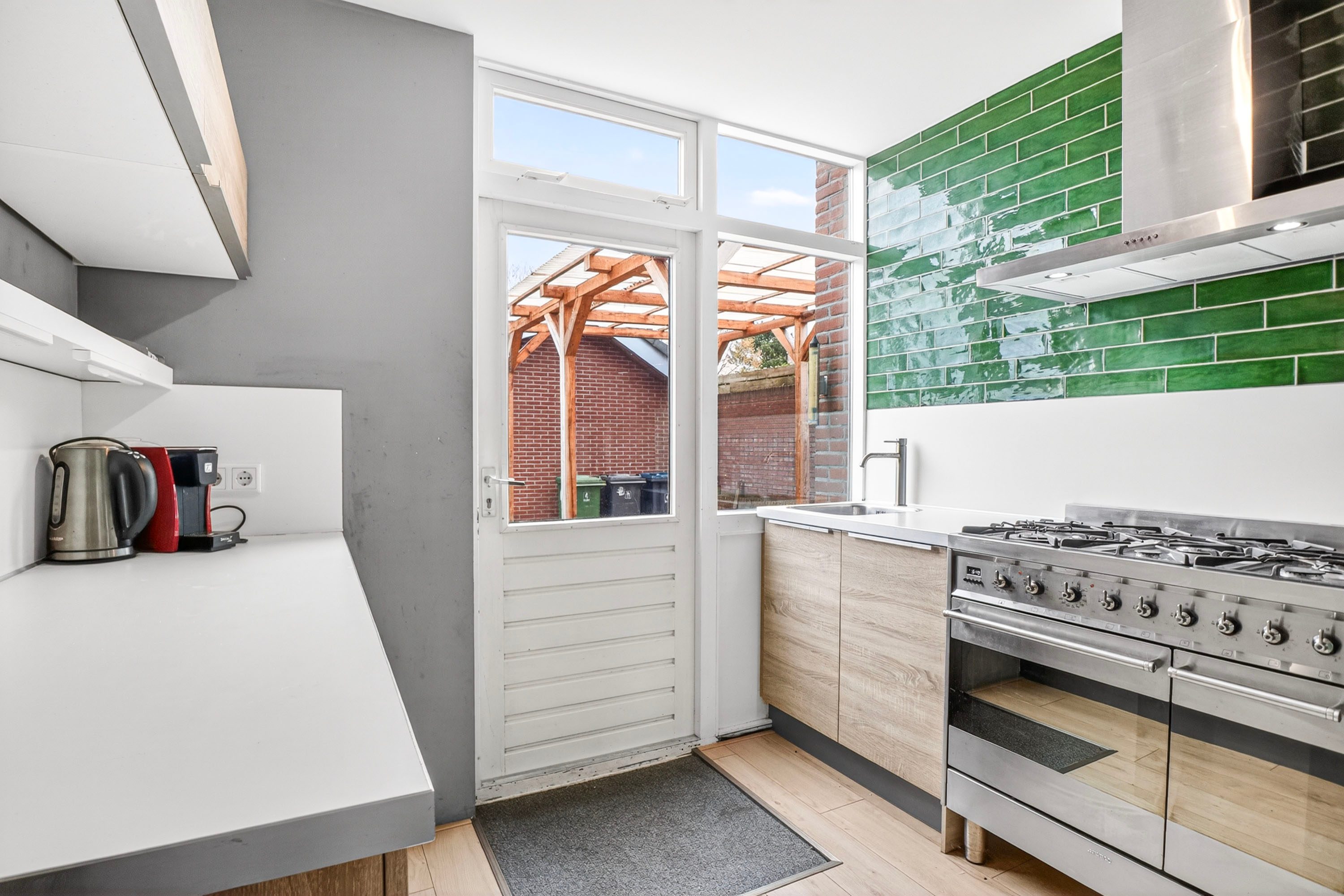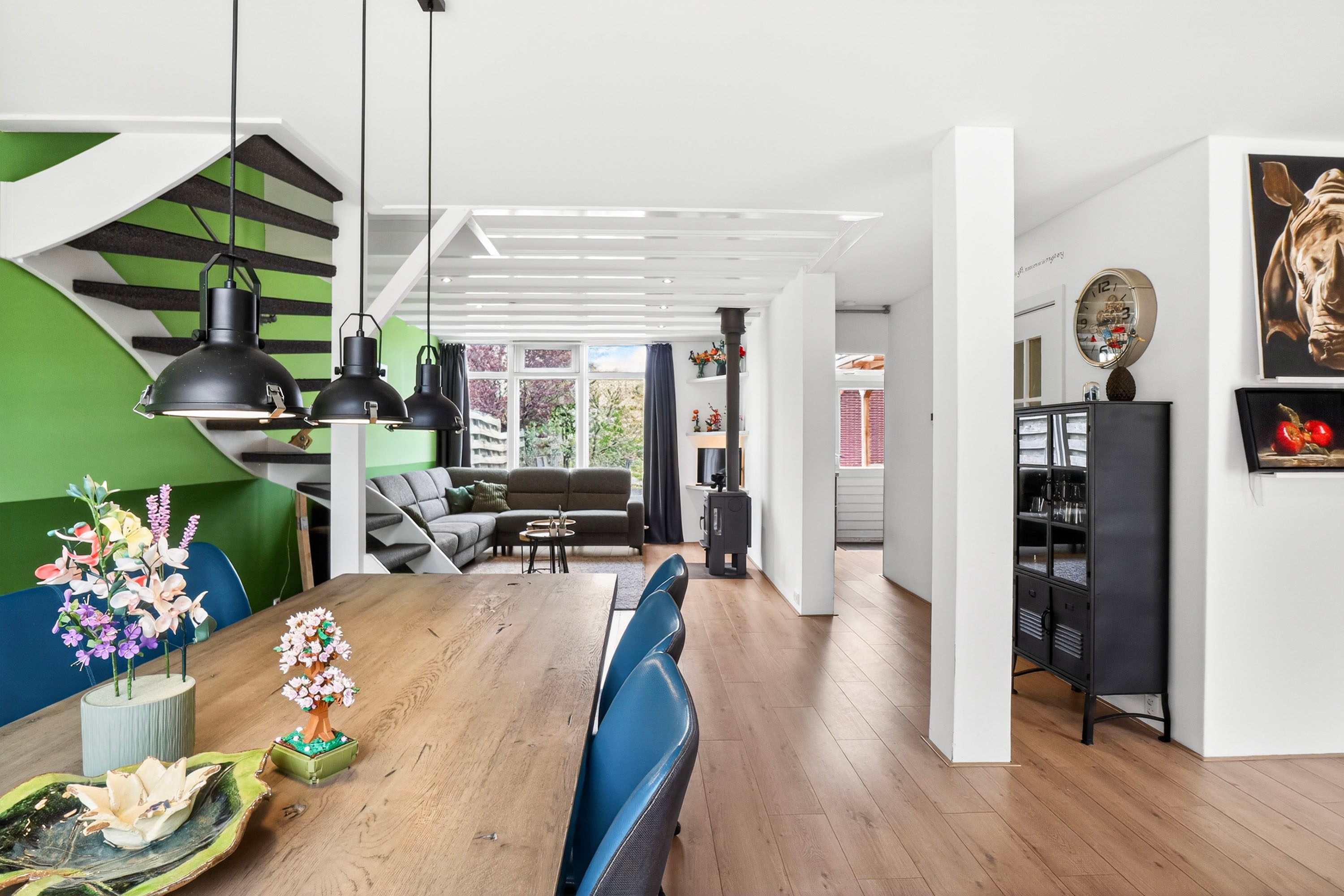 Via je eigen oprit, waar meer dan voldoende ruimte is om je auto's op eigen terrein te parkeren, kom je bij de entree. Bij binnenkomst proef je direct de warme, huiselijke sfeer die deze woning ademt. De living is een heerlijk knusse plek, waar de houtkachel het middelpunt vormt voor sfeervolle winteravonden. Dankzij de grote raampartijen vloeit de woonkamer over in een lichte, royale eetkamer. Dit is de perfecte plek voor lange diners, met een weids en rustgevend uitzicht over je eigen diepe achtertuin. Vanuit de gezellig eethoek kom je bij de moderne keuken die slim is ingedeeld en hoogwaardig afgewerkt met diverse inbouwapparatuur, klaar om de lekkerste maaltijden te bereiden. De hal biedt daarnaast plaats aan de meterkast en een keurig toilet.