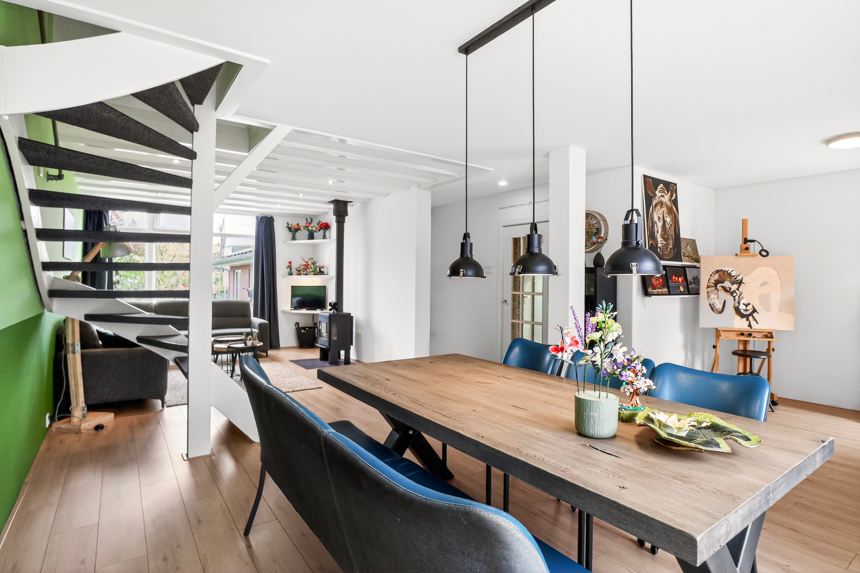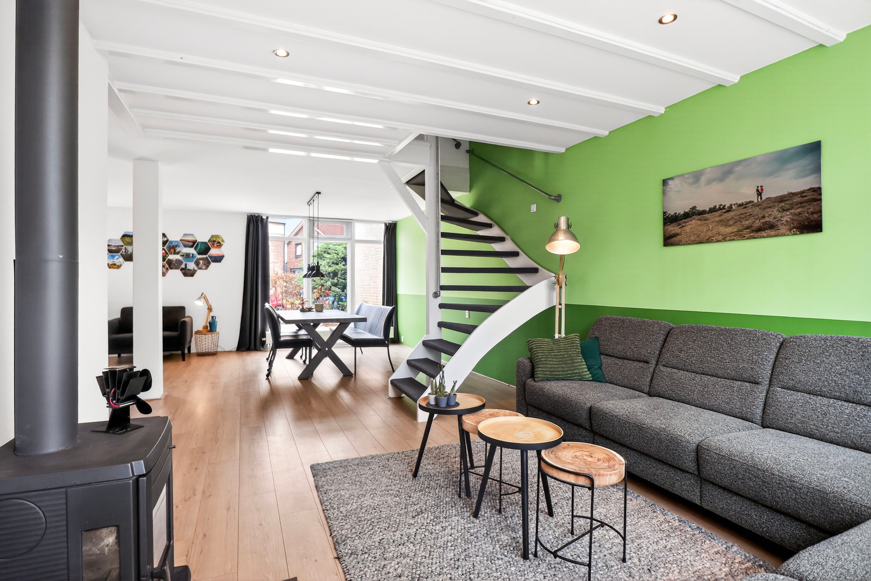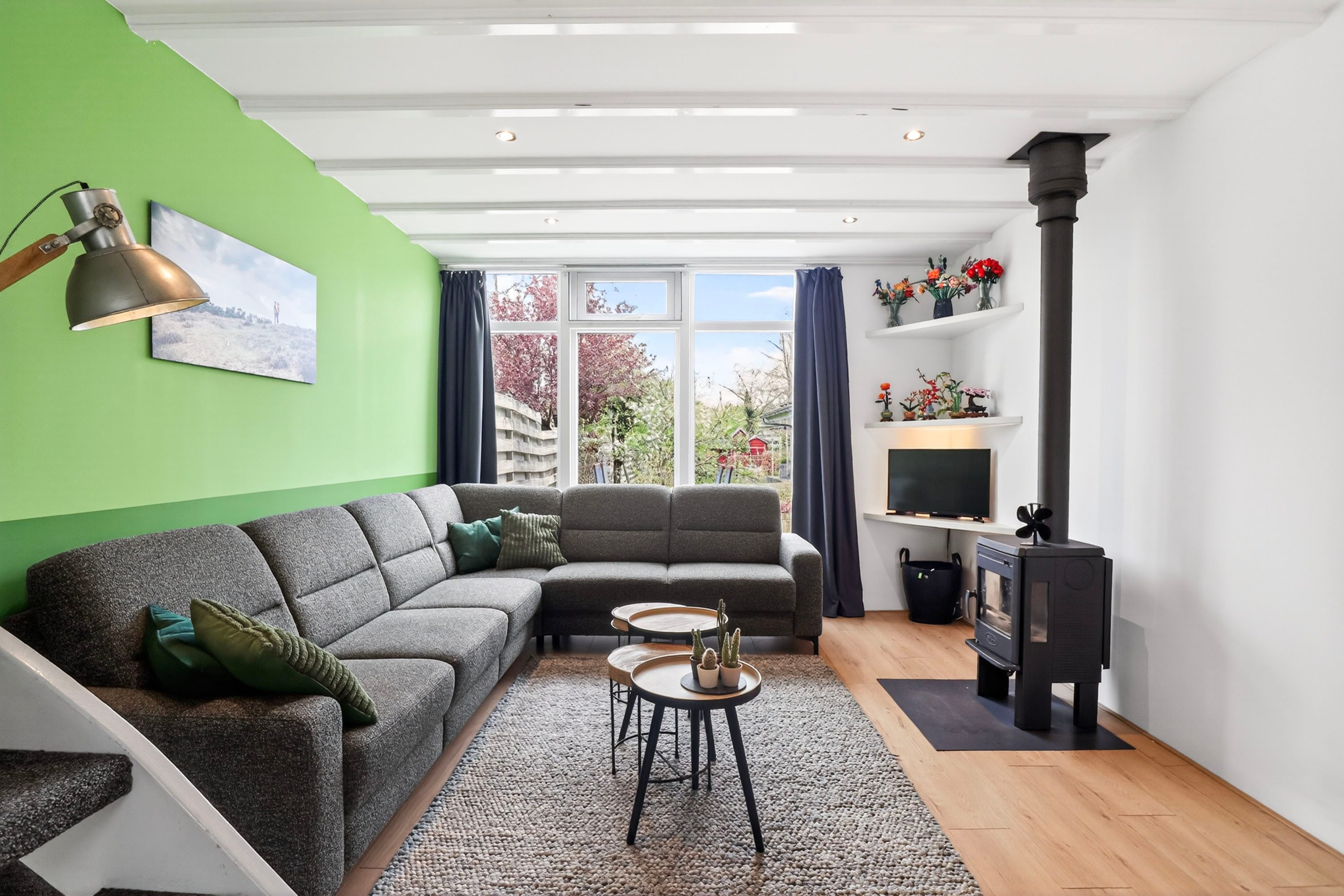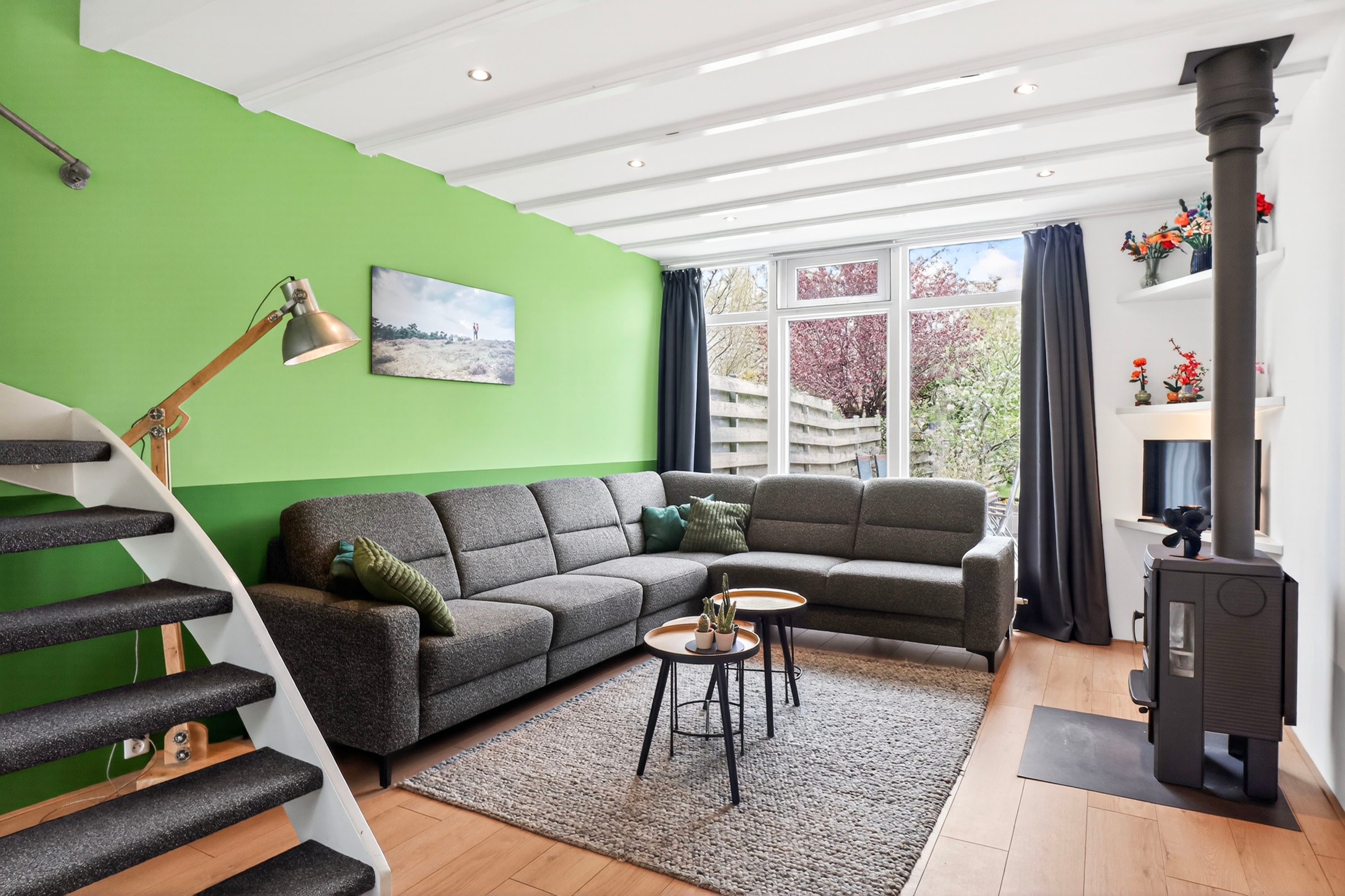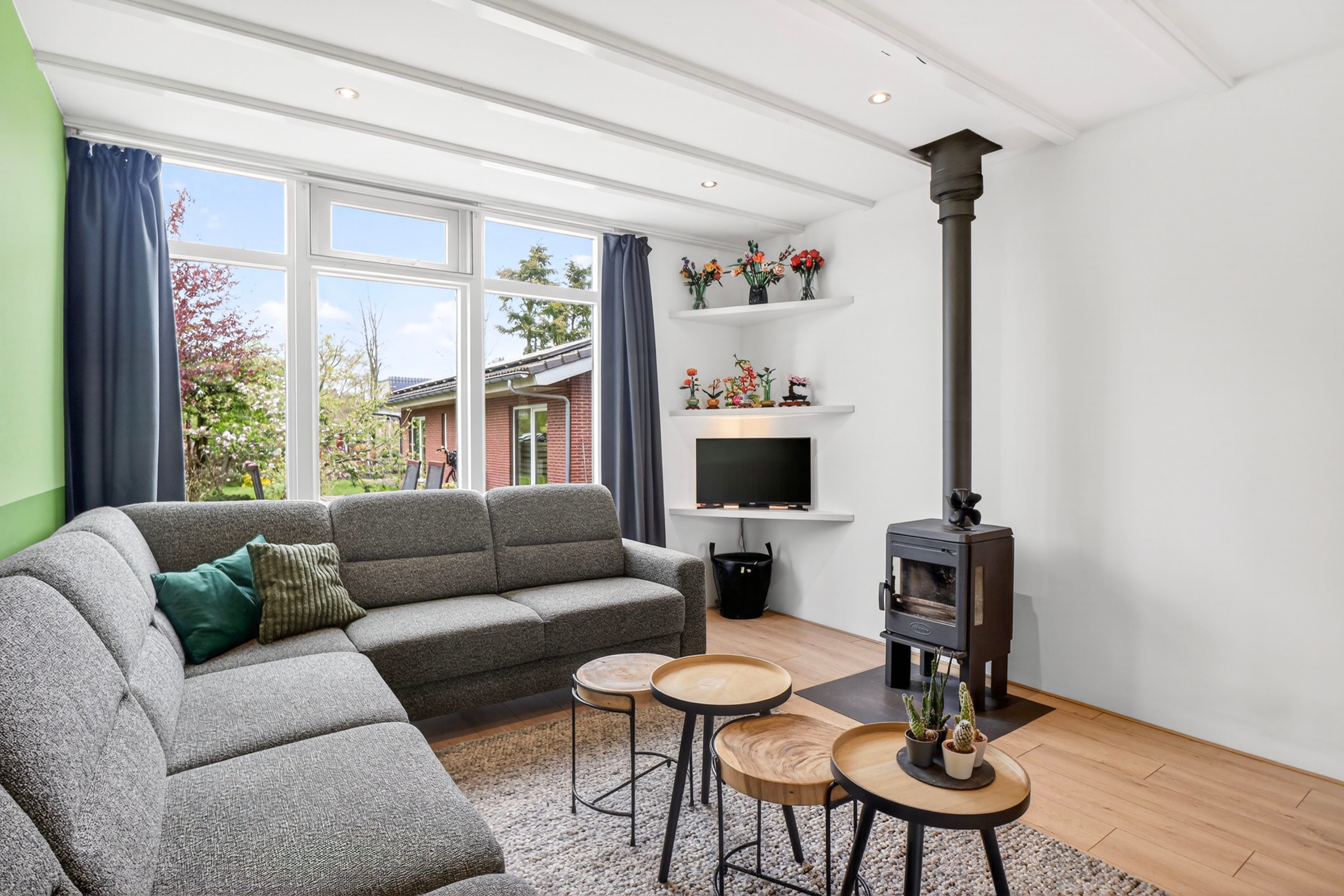 - Sfeervolle woonkamer met houtkachel en veel lichtinval