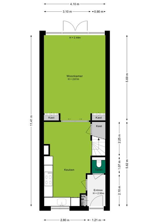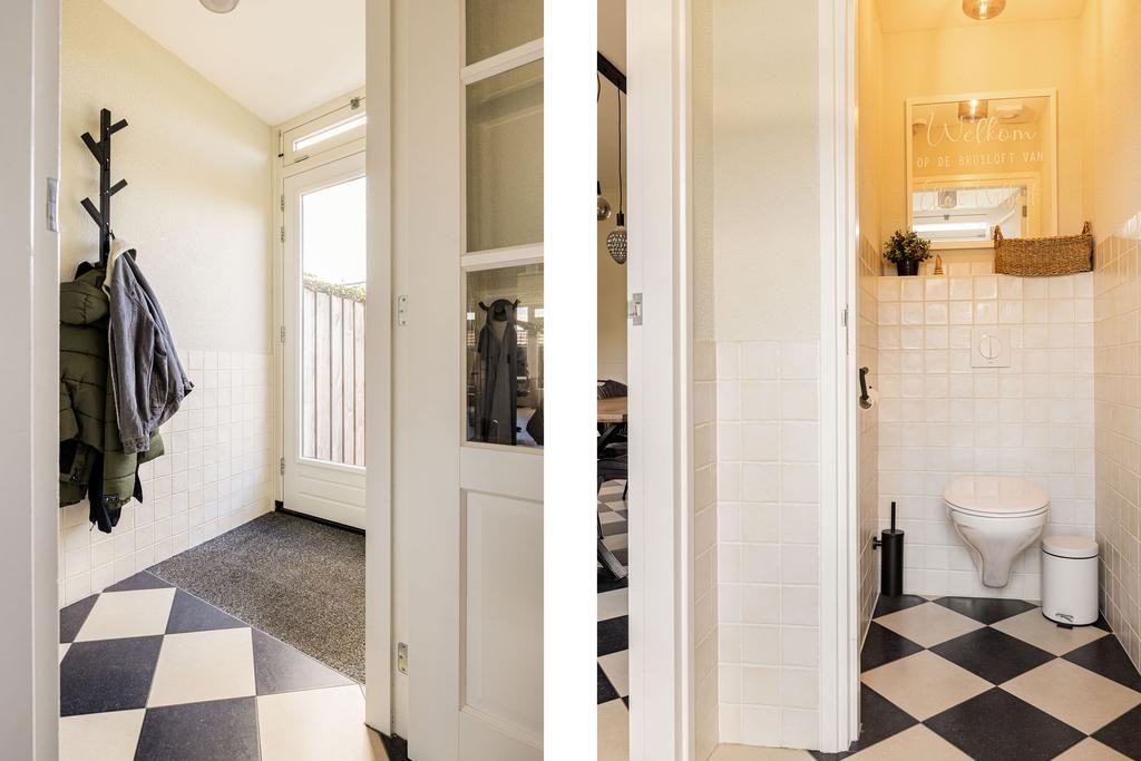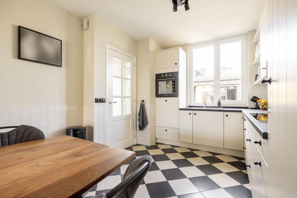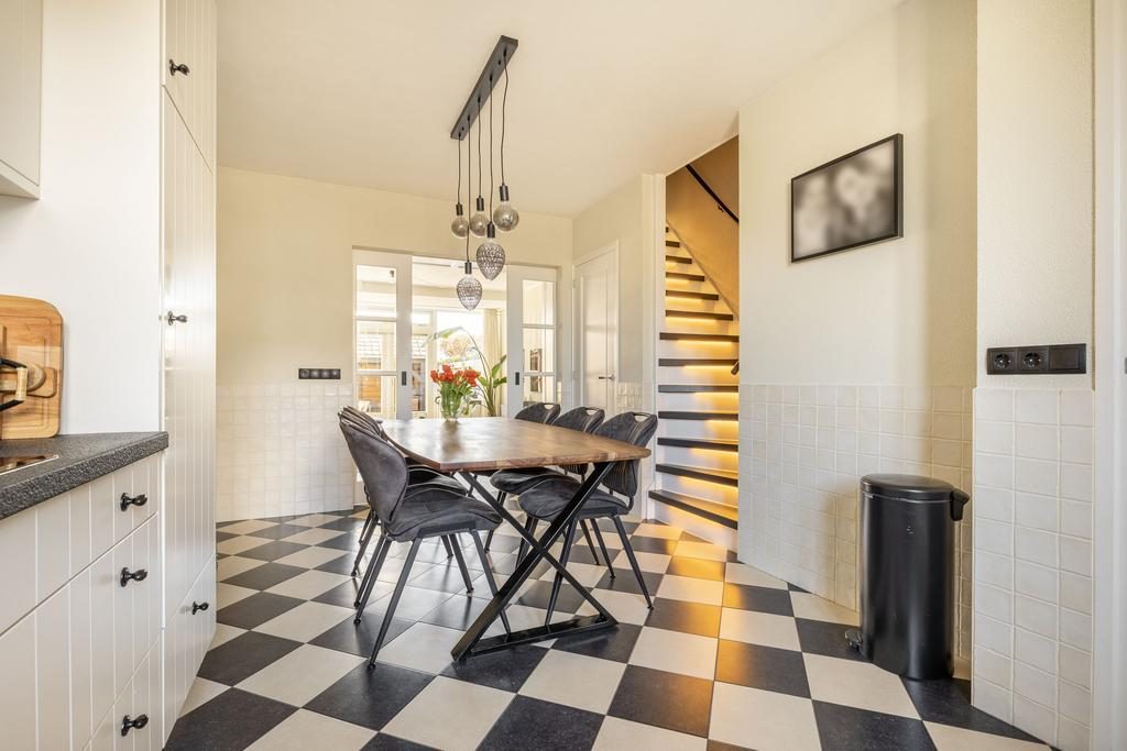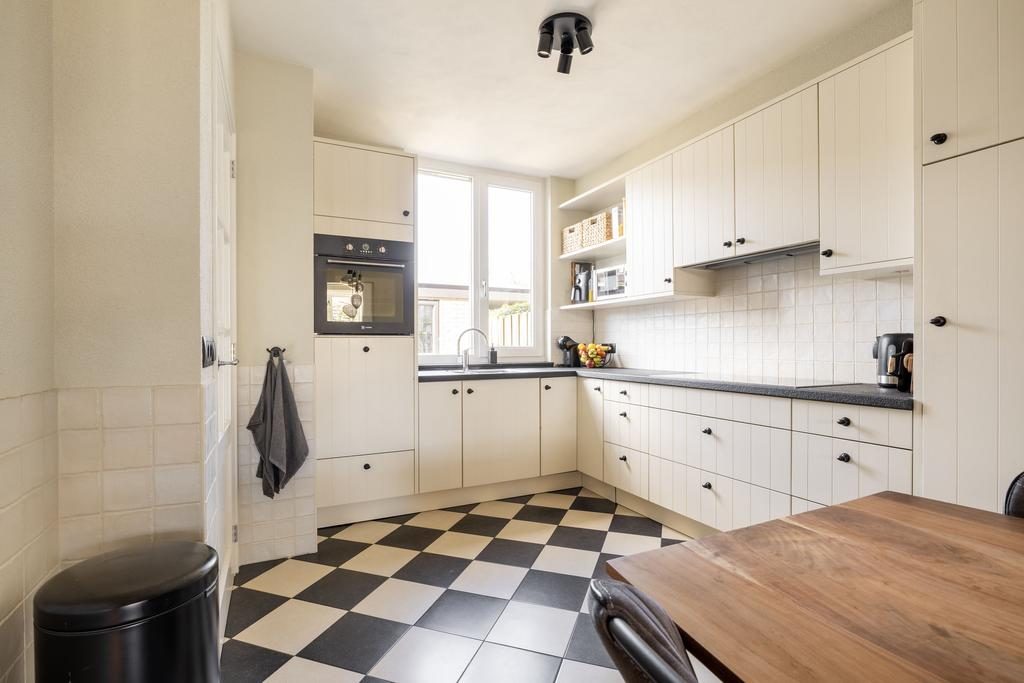 De begane grond is door de huidige eigenaren flink verbouwd. Niet alleen cosmetisch, maar ook bouwkundig. Waar deze woning normaal gesproken een meer gesloten indeling hebben, denk hierbij aan een gesloten keuken, beschikt deze woning over open indeling. Een entree met garderoberuimte, meterkast en de toiletruimte met zwevend toilet. Een toegangsdeur brengt je naar de woonkeuken welke is gelegen aan de voorzijde van de woning. Een heerlijk ruime keuken in L-opstelling met lichte fronten en een stenen aanrechtblad. De keuken is voorzien van het benodigde inbouwapparatuur zoals een oven, inductiekookplaat met ingebouwde afzuigkap, vaatwasser en een koelkast. In de woon-/leefkeuken is meer dan voldoende ruimte voor een grote eettafel. Vanuit de keuken is via een houten trap de 1e verdieping te bereiken.
