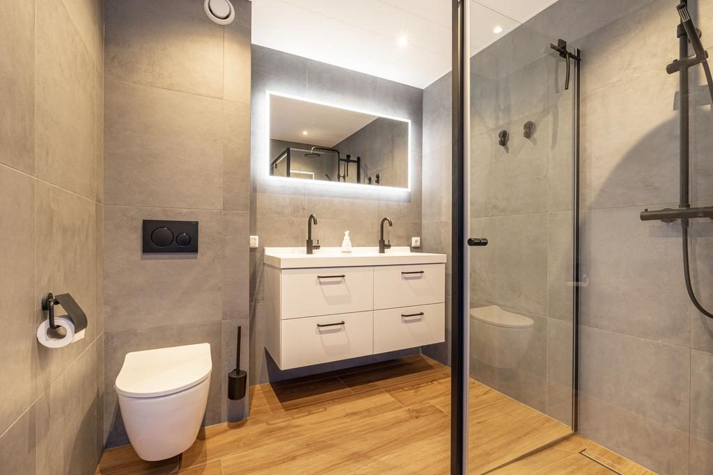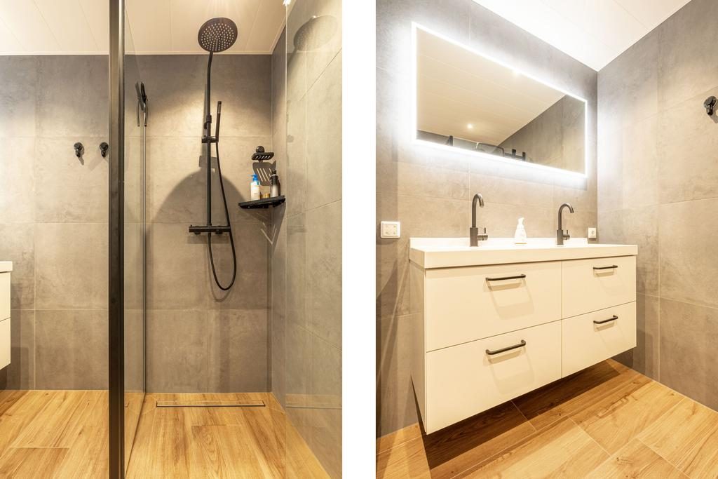 Centraal tussen de slaapkamers bevindt zich een eyecatcher van het huis: de badkamer! Een in BOUWJAAR vernieuwde badkamer en uitgevoerd met grijze betonlook wandtegels en een houtlook vloertegel. Qua uitvoering is er gekozen voor een 2e toilet, wastafelmeubel met dubbele wastafel, mechanische ventilatie en een inloopdouche.