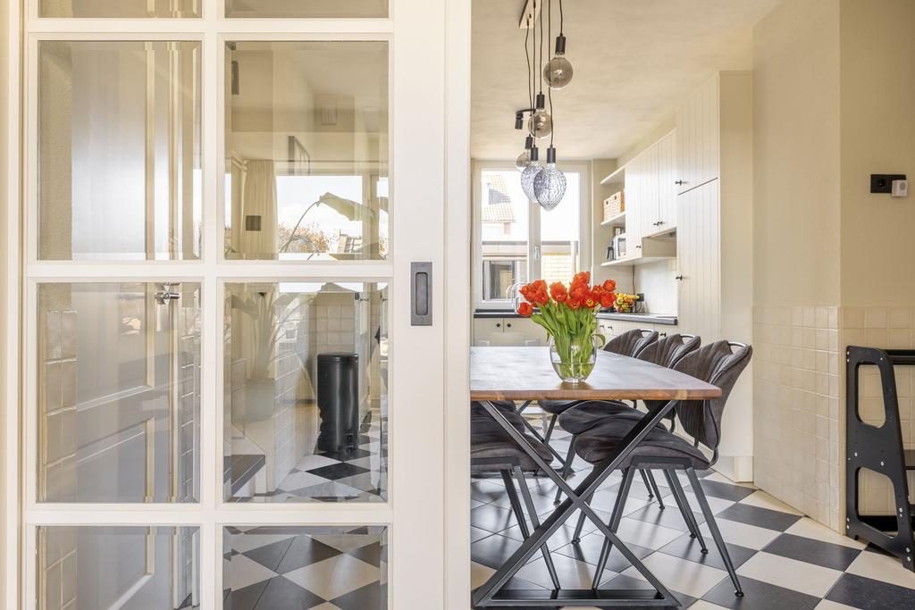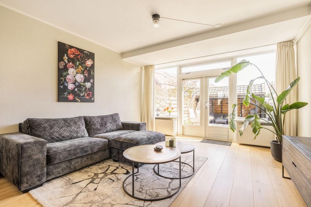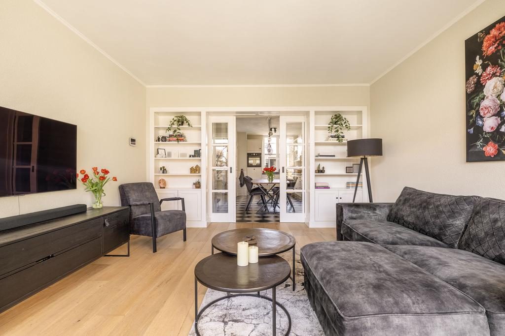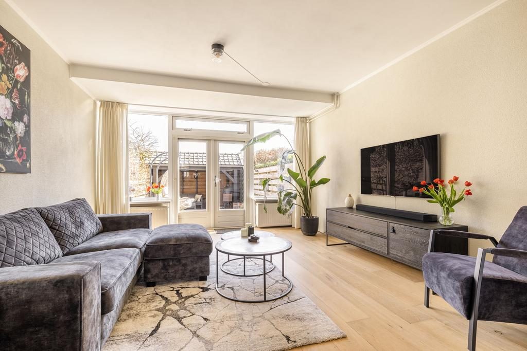 Tussen de woon-/leefkeuken en de woonkamer bevinden zich de en-suite schuifdeuren met inbouwkasten. Hierdoor beschik je naast een woon-/leefkeuken ook over een afsluitbare woonkamer. Eenmaal voorbij de en-suite deuren betreed je de woonkamer. Een heerlijke en ruime woonkamer met prettig uitzicht op de verzorgde achtertuin. Via de openslaande tuindeuren bereik je de verzorgde achtertuin.