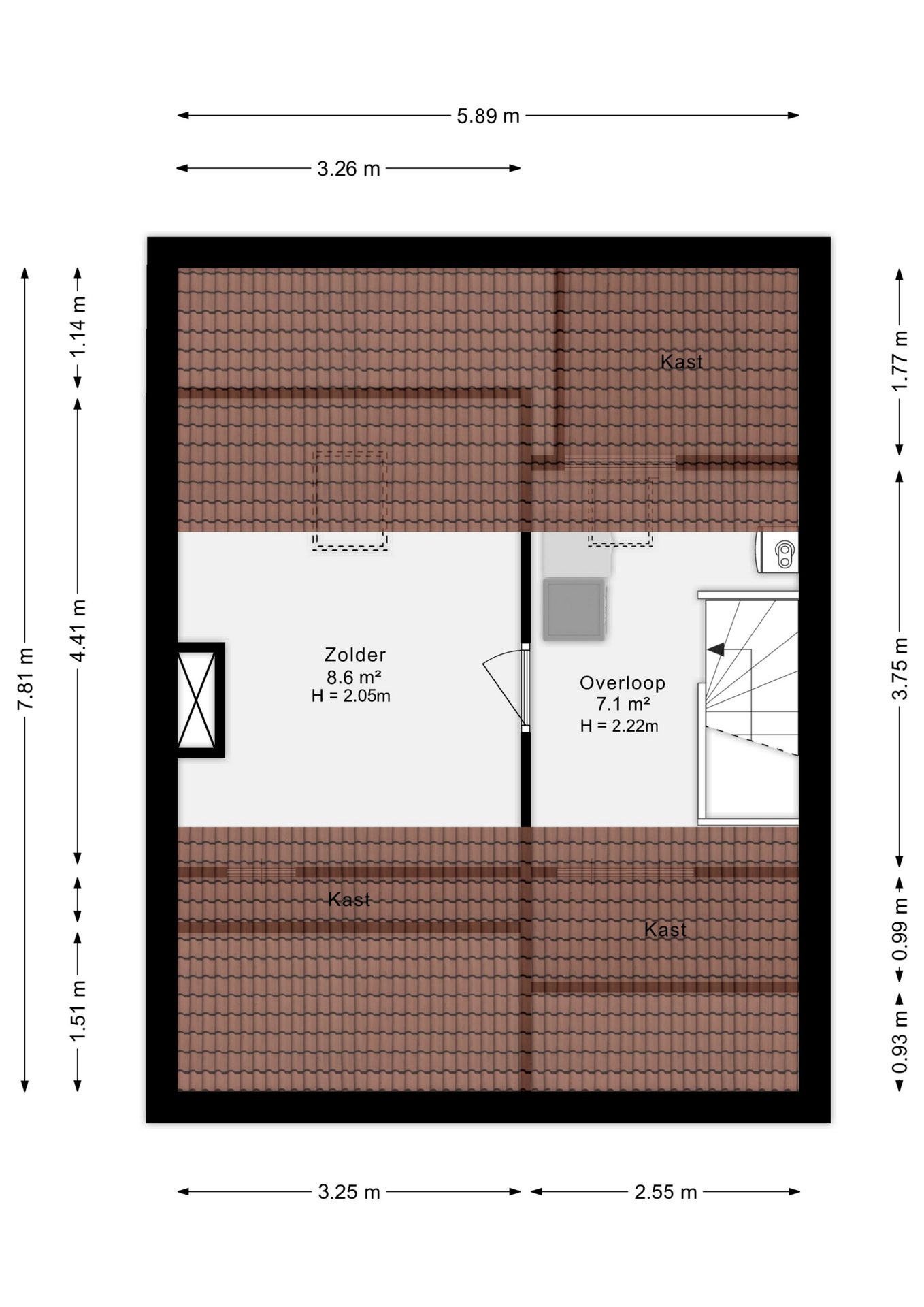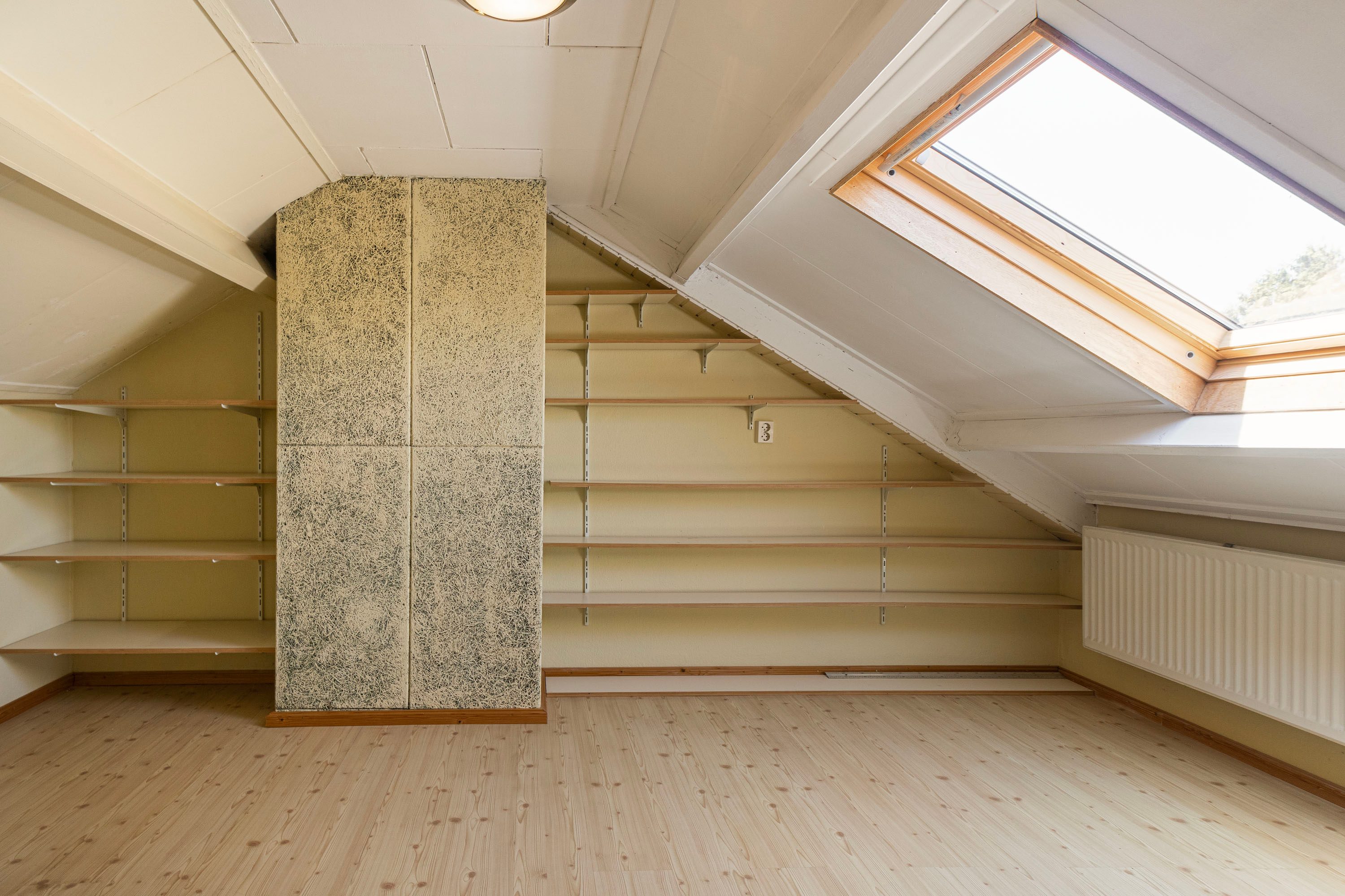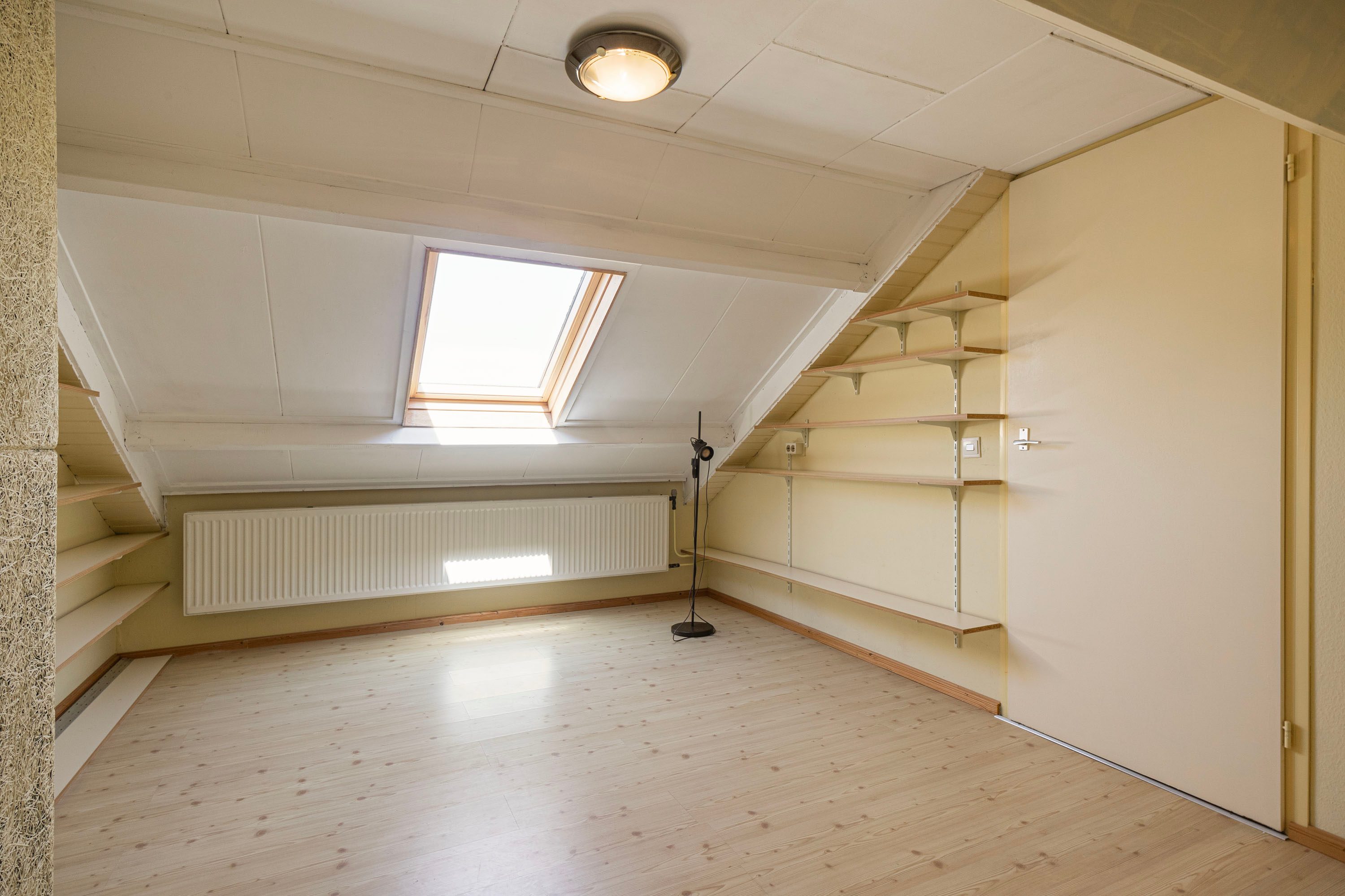 Via een vaste trap kom je op de voorzolder met witgoedaansluiting en bergruimte achter de knieschotten. Daarnaast is hier de vierde slaapkamer van circa 8,6m² met dakraam.