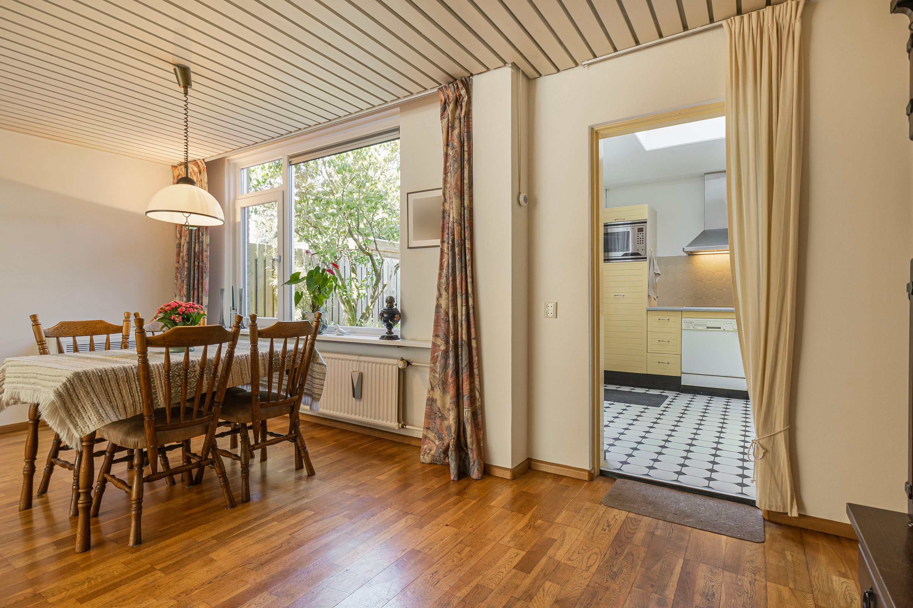 Aan de voorzijde bevindt zich de woonkamer, terwijl de eetkamer en de halfopen keuken aan de achterzijde liggen. Vanuit de woonkamer geniet je van een prachtig groen uitzicht. De keuken is opgesteld in een hoek en sluit aan op de eetkamer. Via de tuindeur stap je zo de achtertuin in. Er is voldoende opbergruimte mede dankzij de aanwezige bovenkasten. De keuken is voorzien van de volgende inbouwapparatuur: kookplaat, afzuigkap, combi-oven en koel-vriescombinatie.