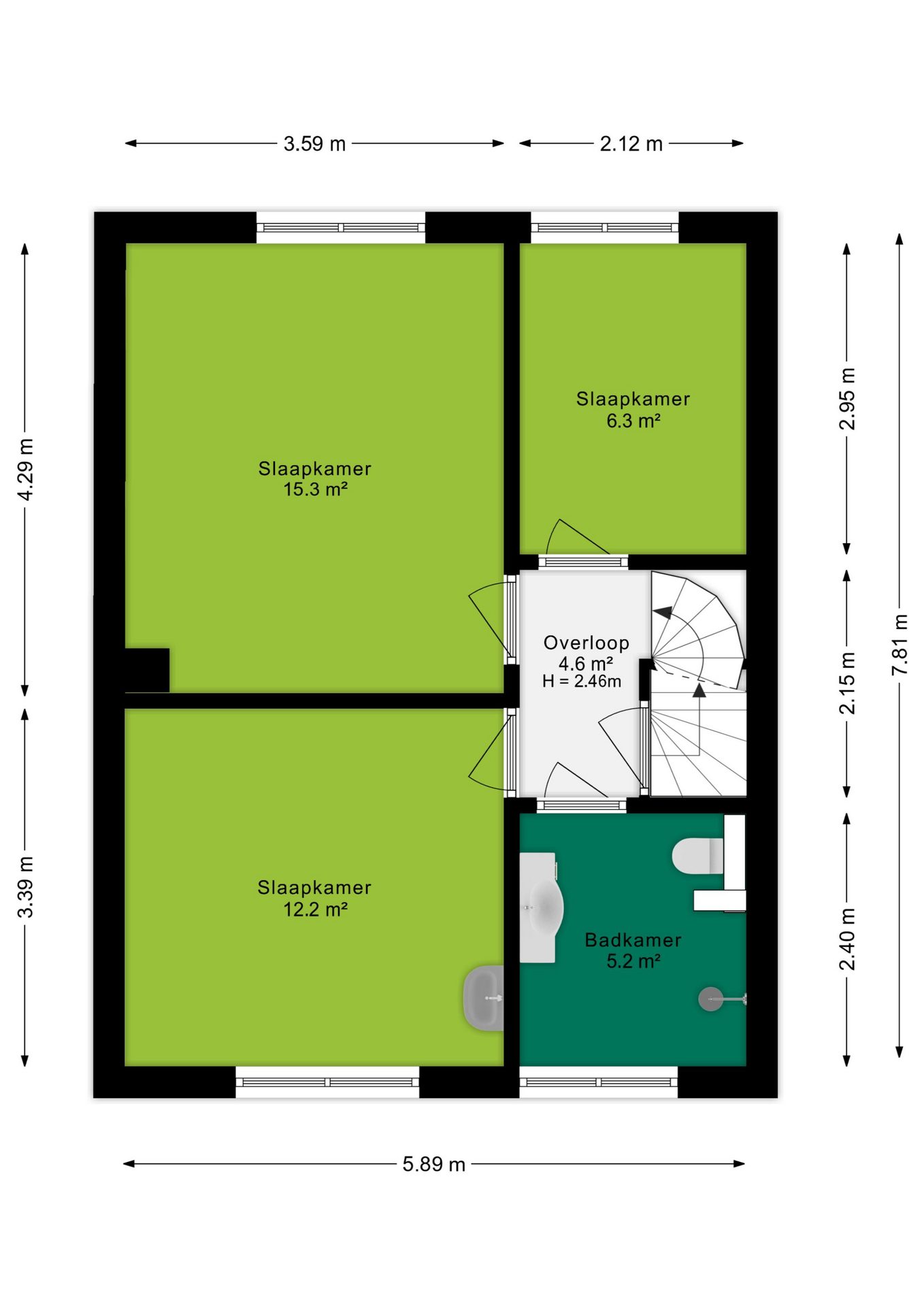Hier vind je drie goed bemeten slaapkamers en de badkamer. De kamers zijn recht opgetrokken en bieden veel ruimte. De badkamer is volledig betegeld in lichte kleurstelling en voorzien van een wastafelmeubel, inloopdouche en toilet. Dankzij de aanwezige ramen wordt de ruimte niet alleen voorzien van prettig natuurlijk licht, maar is er ook de mogelijkheid om de badkamer gemakkelijk op een natuurlijke manier te ventileren.
