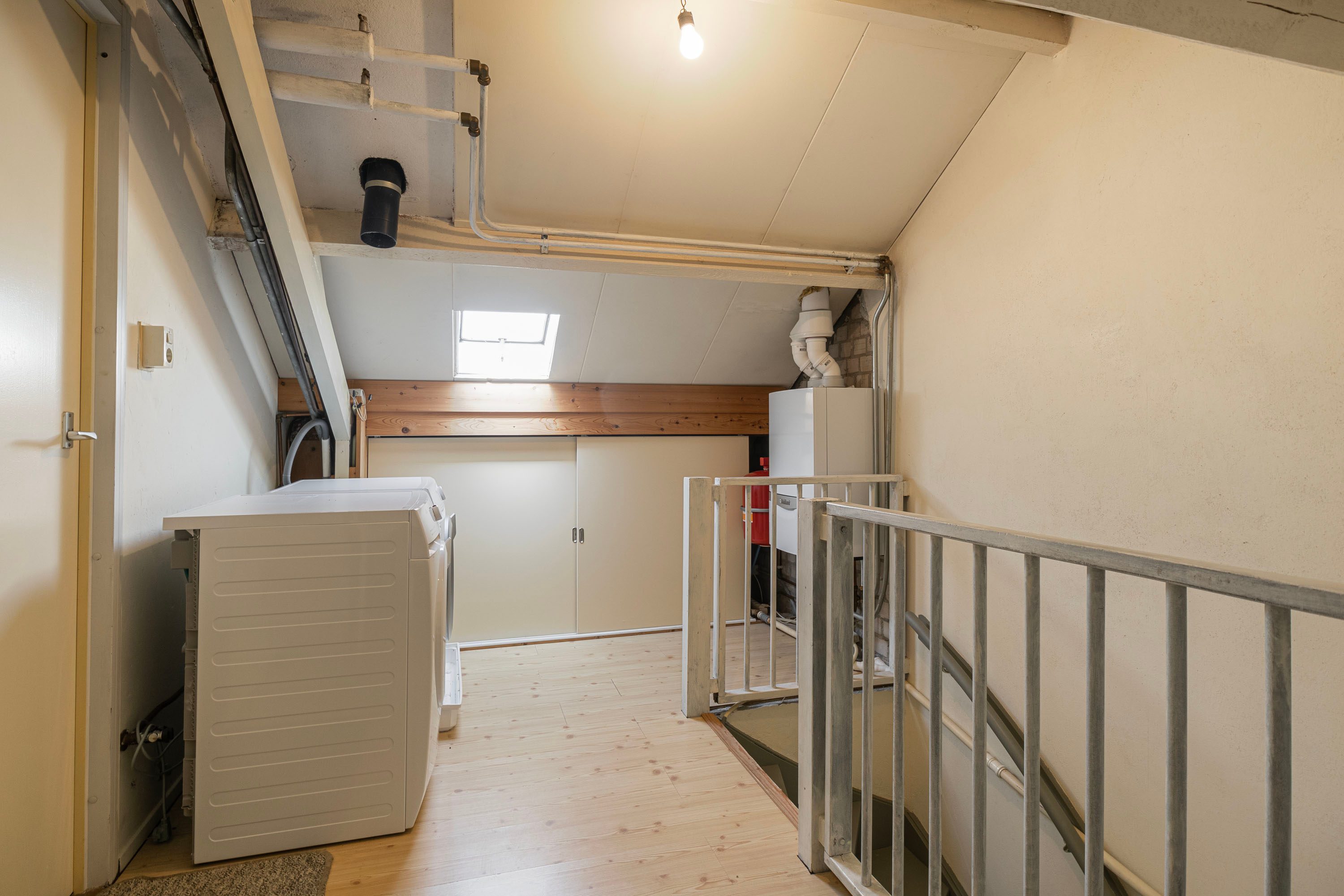 Via een vaste trap kom je op de voorzolder met witgoedaansluiting en bergruimte achter de knieschotten. Daarnaast is hier de vierde slaapkamer van circa 8,6m² met dakraam.