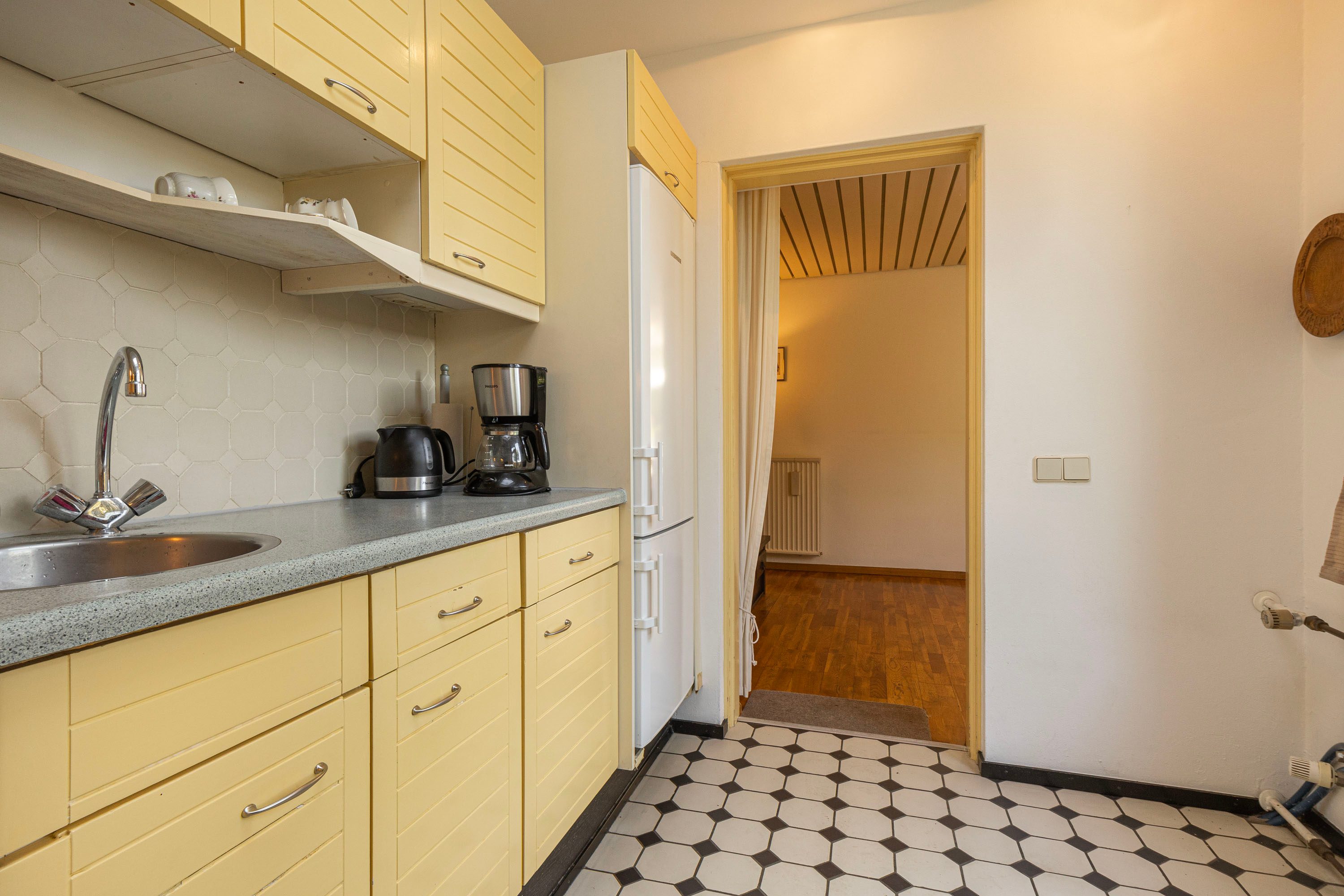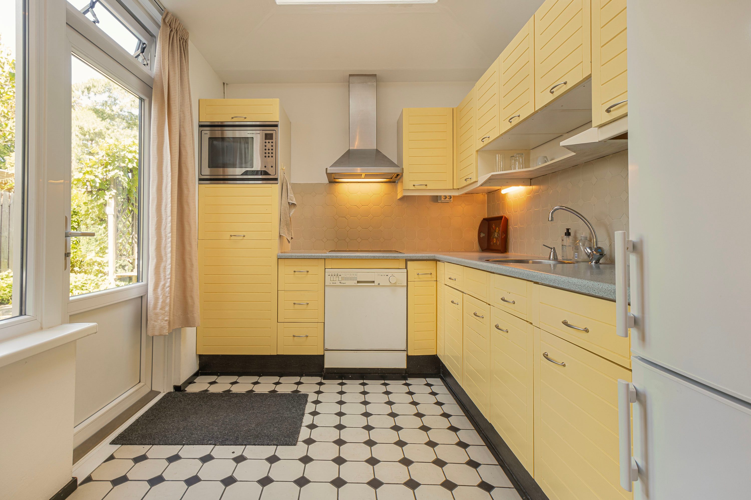 Aan de voorzijde bevindt zich de woonkamer, terwijl de eetkamer en de halfopen keuken aan de achterzijde liggen. Vanuit de woonkamer geniet je van een prachtig groen uitzicht. De keuken is opgesteld in een hoek en sluit aan op de eetkamer. Via de tuindeur stap je zo de achtertuin in. Er is voldoende opbergruimte mede dankzij de aanwezige bovenkasten. De keuken is voorzien van de volgende inbouwapparatuur: kookplaat, afzuigkap, combi-oven en koel-vriescombinatie.