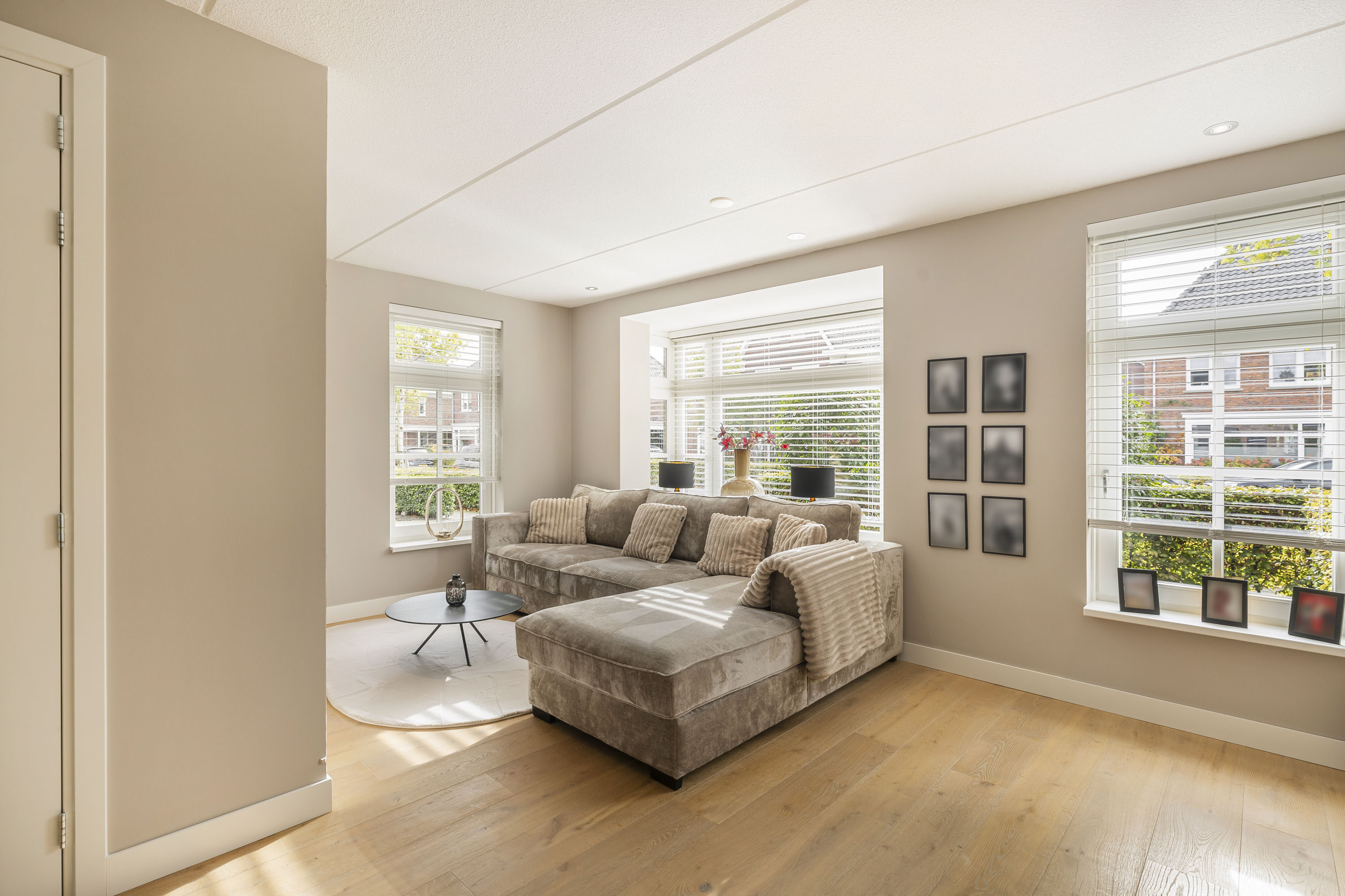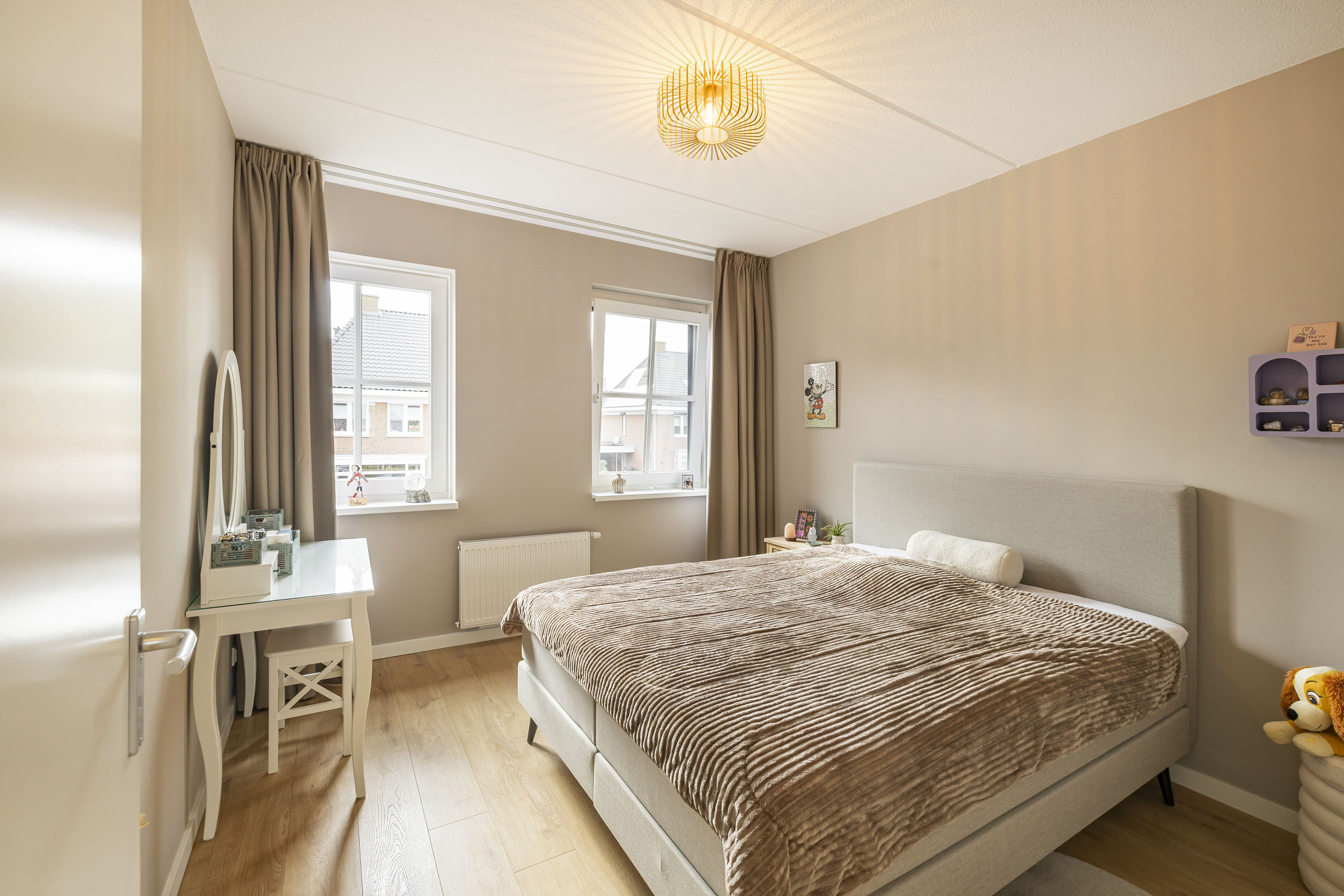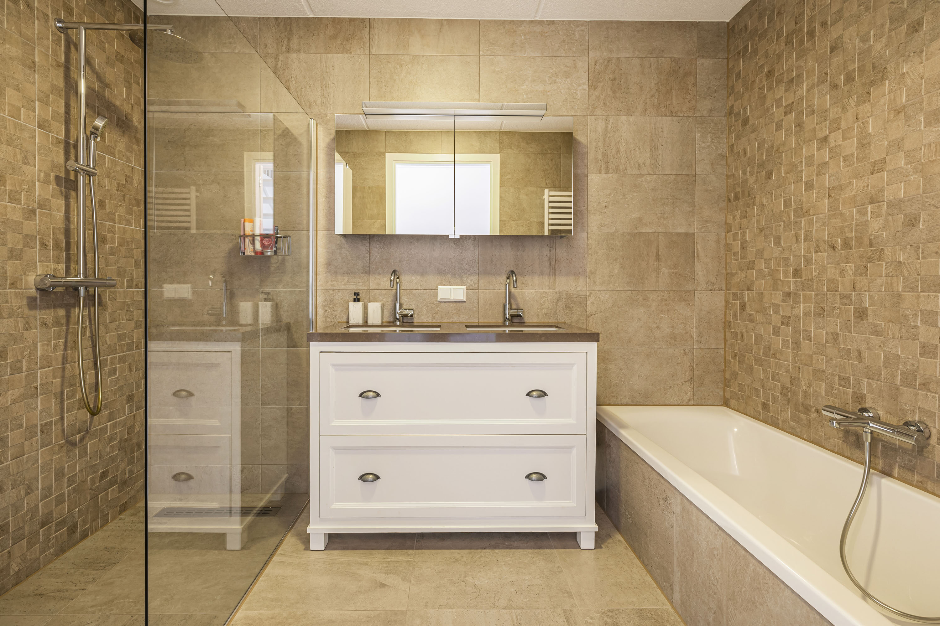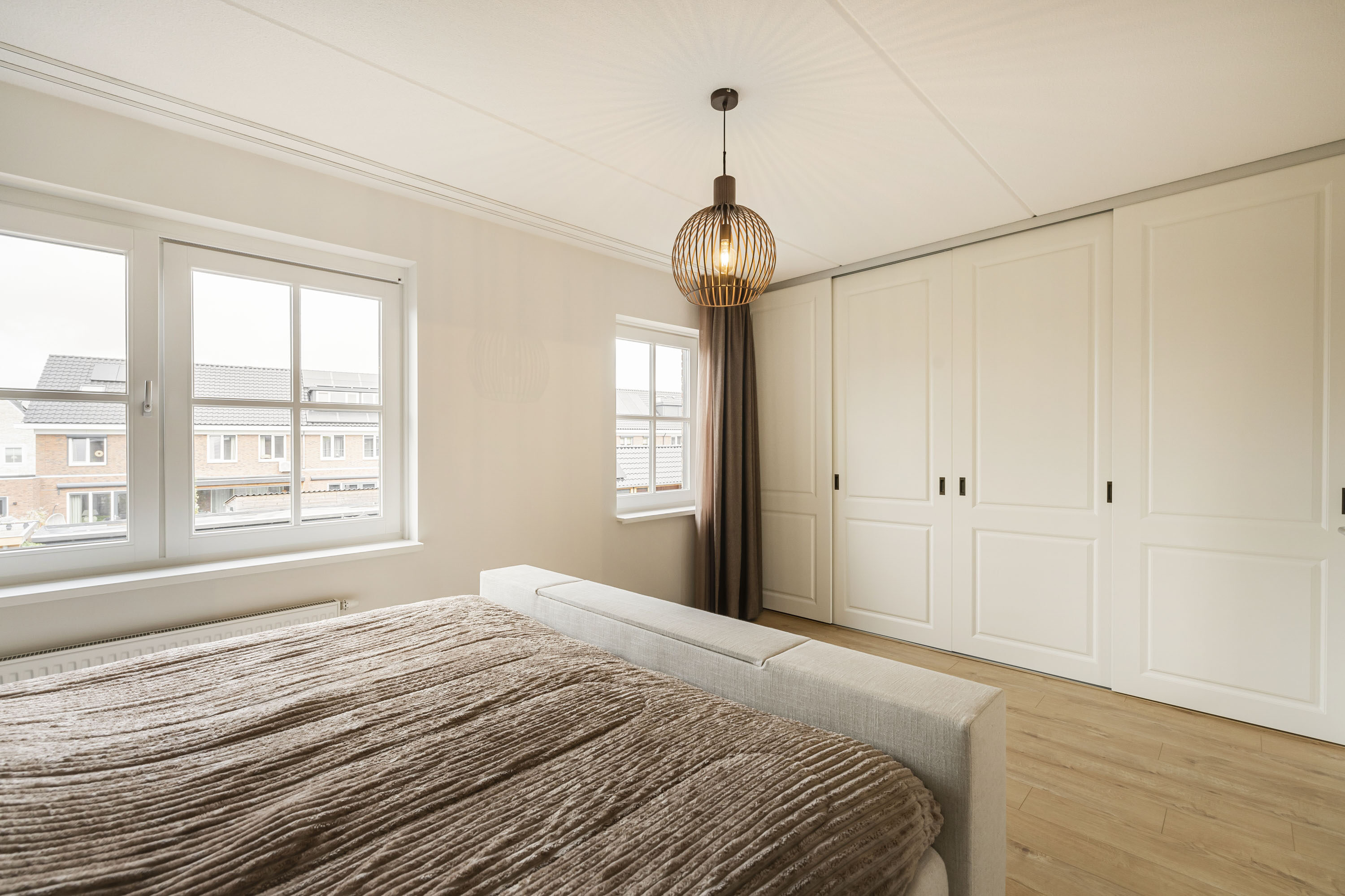 Via de ruime overloop kom je op de eerste verdieping, waar drie lichte slaapkamers te vinden zijn. Deze kamers hebben afmetingen van 7,7 m², 10,7 m² en maar liefst 18 m². De grootste slaapkamer valt op door de ingebouwde kastenwand, wat een extra luxe uitstraling geeft. De badkamer van 6,3 m² is uitgerust met beige tegels en voorzien van een dubbele wastafel, een inloopdouche en een fijn ligbad. Het toilet bevindt zich in de tegenoverliggende ruimte.