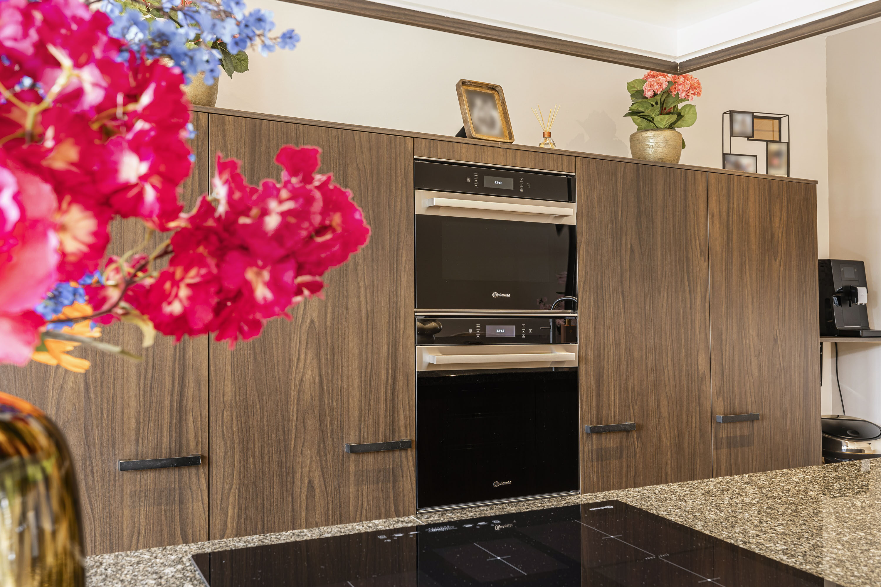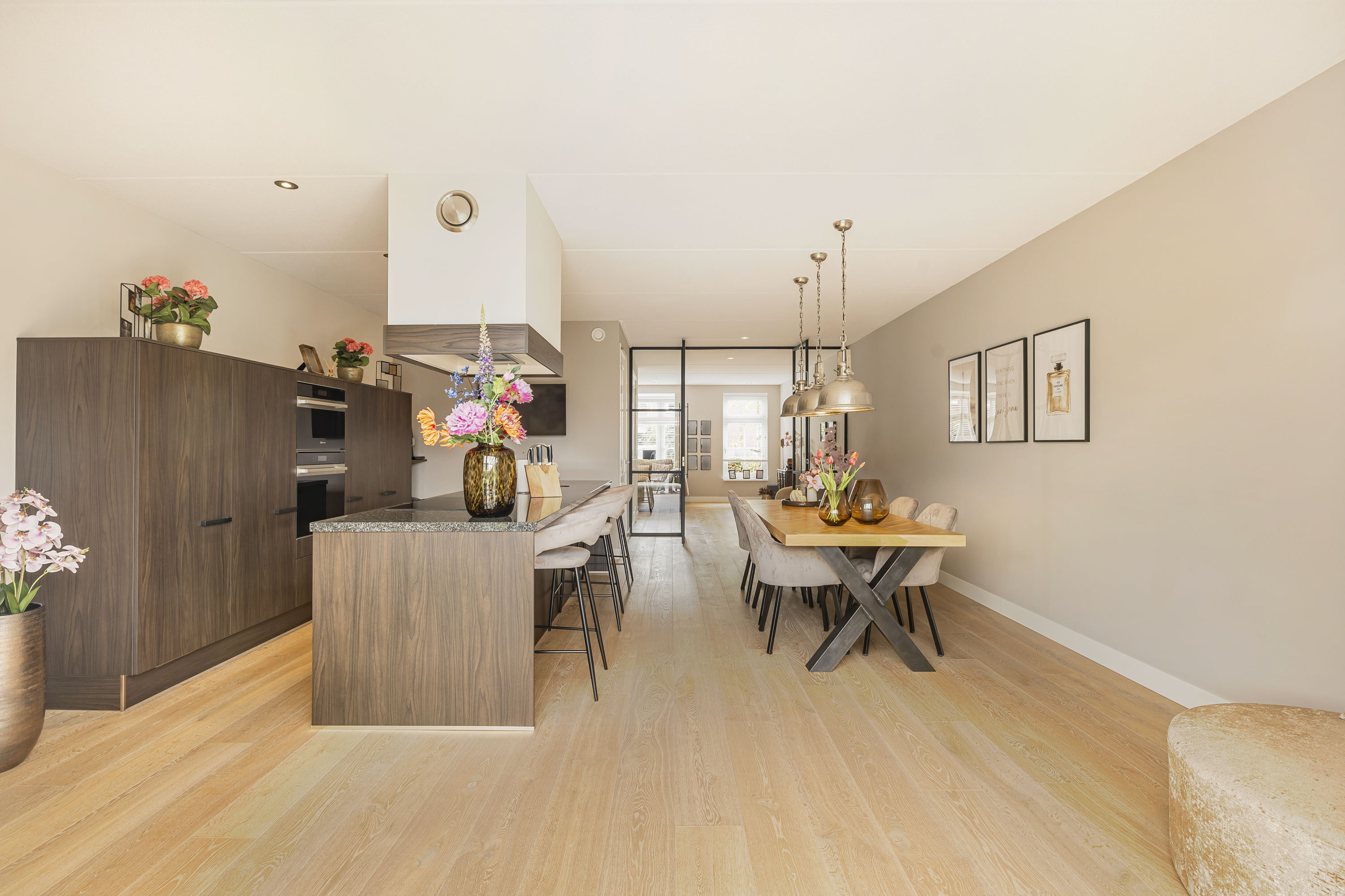 Vanaf je eigen oprit kom je bij de entree, waar je direct de meterkast, het toilet en de trapopgang aantreft. De ruime woonkamer aan de voorzijde biedt genoeg plek voor een grote zitbank en een gezellige zithoek. Via de openslaande taatsdeuren bereik je de ruime leefkeuken, waarin voldoende ruimte is voor een lange eettafel. De luxe open keuken valt op door het grote kookeiland waar je met barkrukken gezellig kunt zitten. Ook vind je er diverse inbouwapparatuur, zoals een kookplaat, afzuigkap, oven, combi-oven, koelkast, vaatwasser en Quooker. Dankzij de tuindeuren valt er veel licht binnen. Vanuit de keuken is er toegang tot een bijkeuken van 5,4 m², waar de aansluitingen voor wasmachine en droger aanwezig zijn. Daarnaast is er een berging van 9,1 m², ook bereikbaar via de oprit, wat ideaal is om al je spullen op te bergen. Bovendien is de begane grond uitgerust met vloerverwarming, wat tijdens de koude winterdagen erg prettig is.
