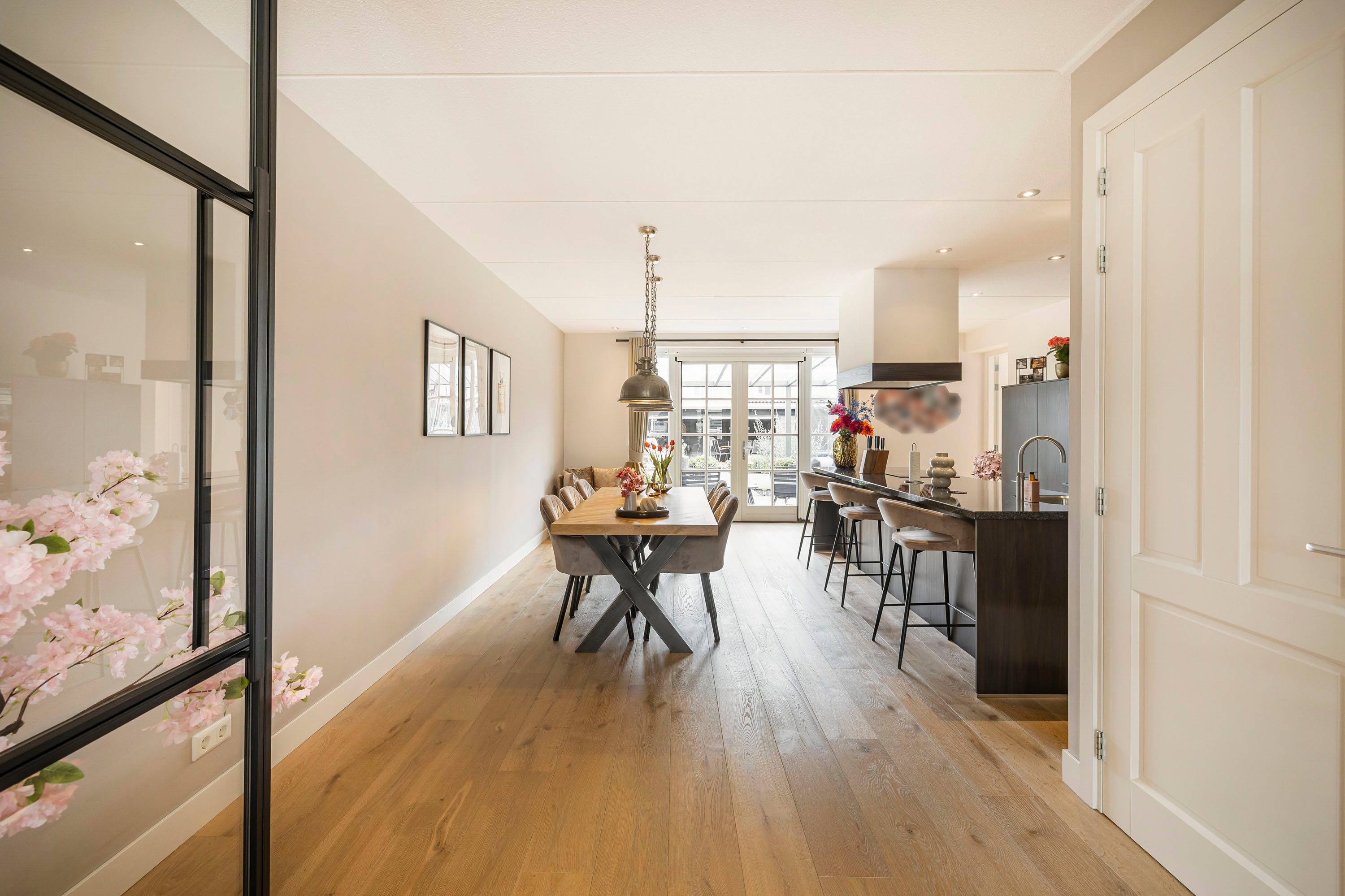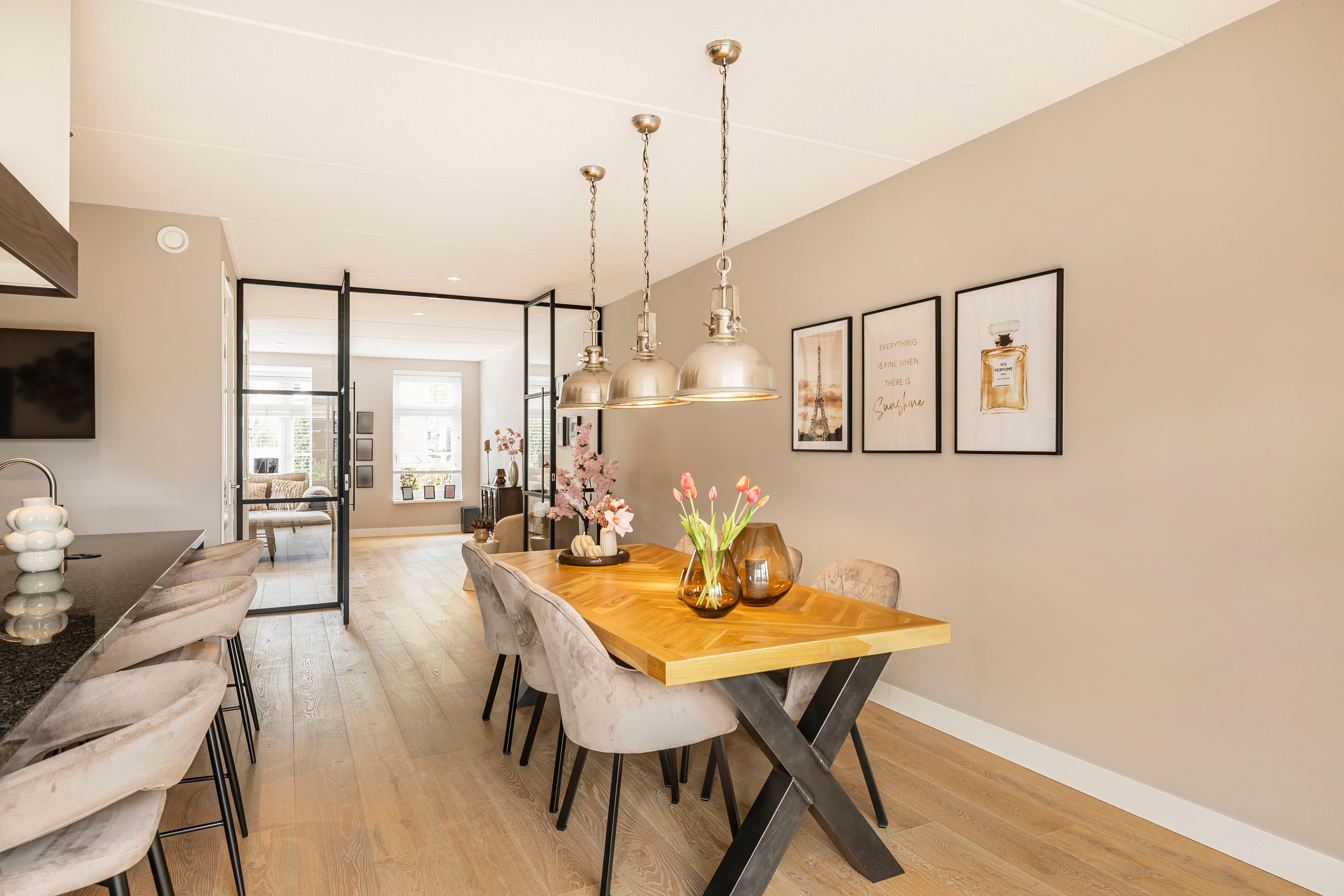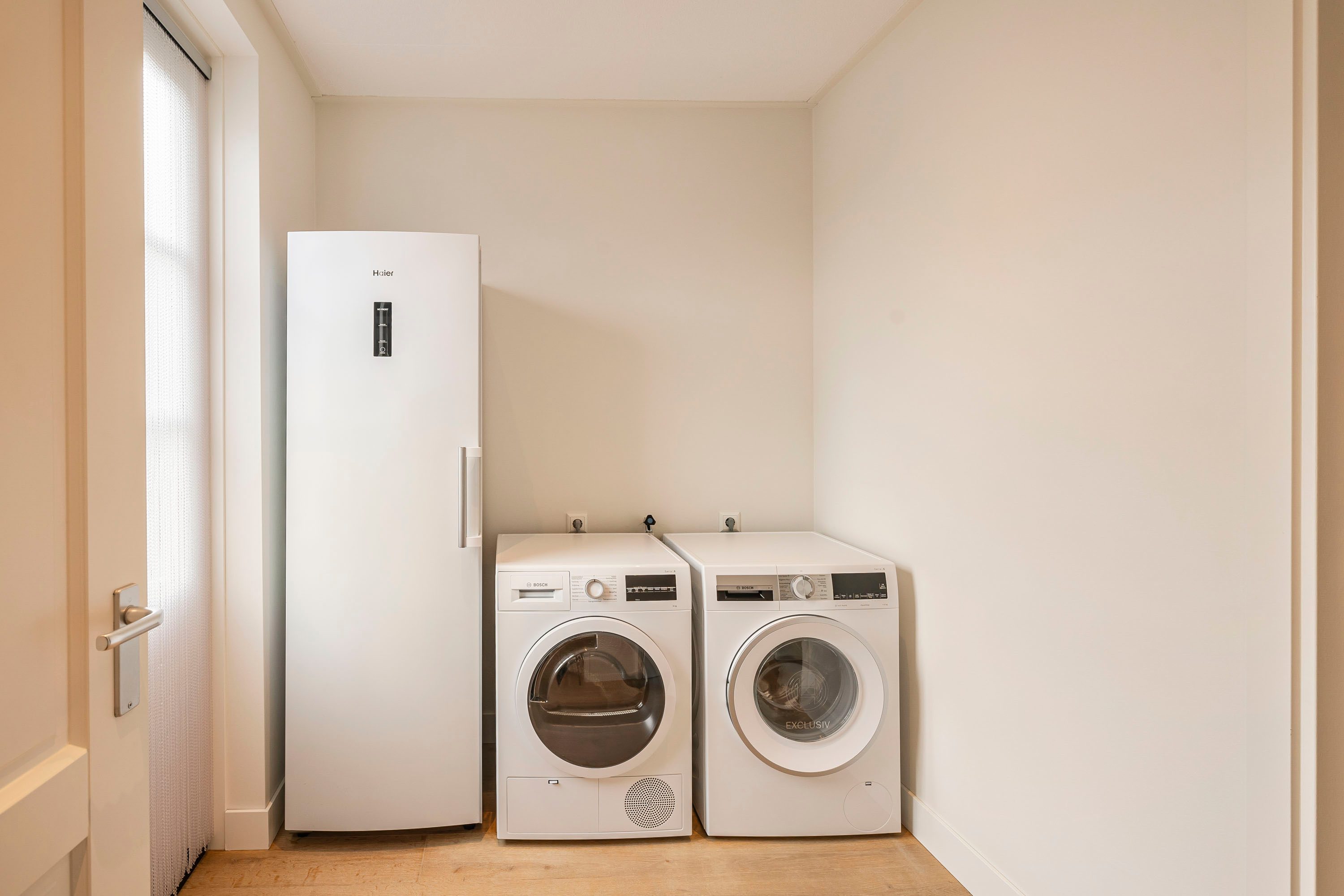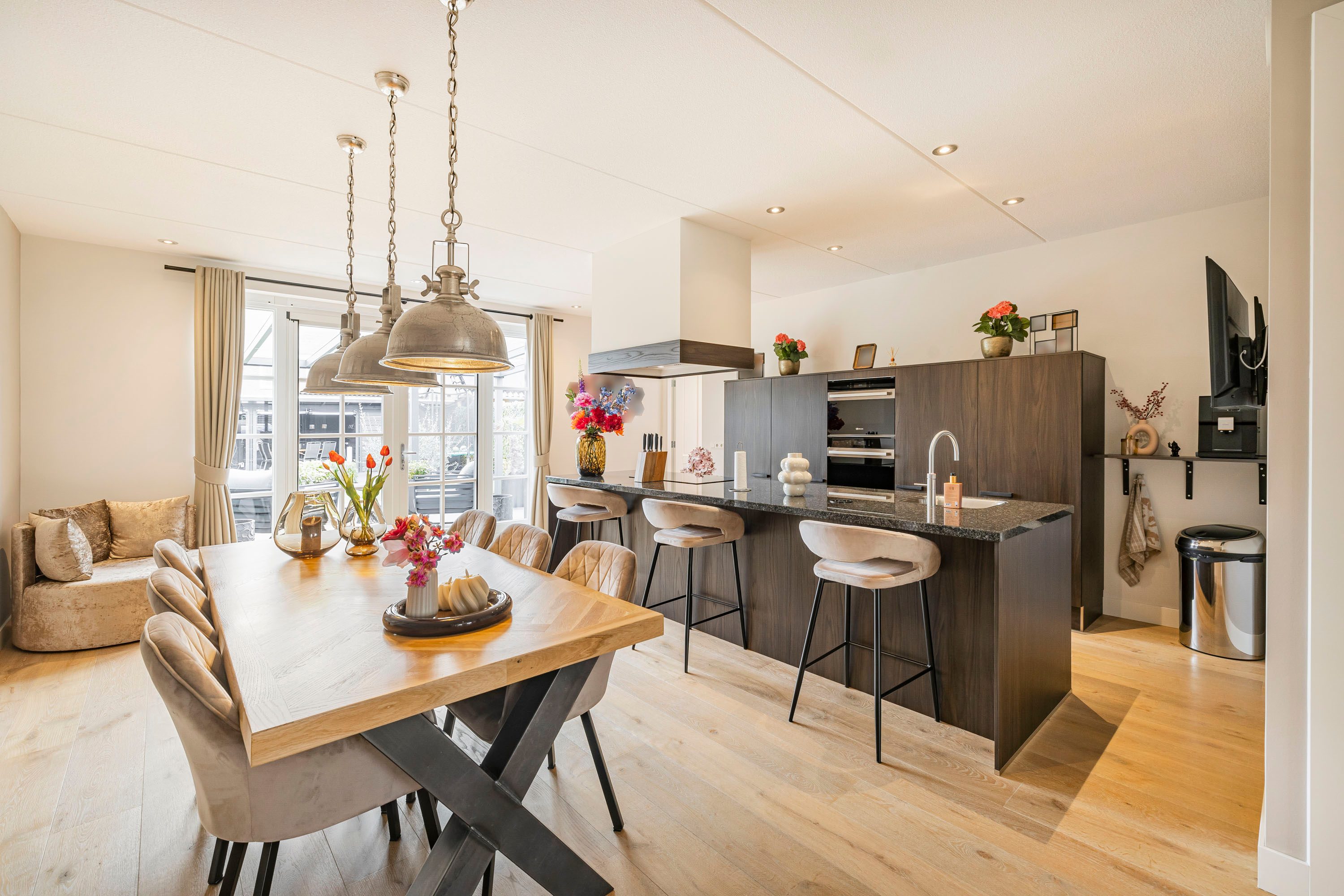 Vanaf je eigen oprit kom je bij de entree, waar je direct de meterkast, het toilet en de trapopgang aantreft. De ruime woonkamer aan de voorzijde biedt genoeg plek voor een grote zitbank en een gezellige zithoek. Via de openslaande taatsdeuren bereik je de ruime leefkeuken, waarin voldoende ruimte is voor een lange eettafel. De luxe open keuken valt op door het grote kookeiland waar je met barkrukken gezellig kunt zitten. Ook vind je er diverse inbouwapparatuur, zoals een kookplaat, afzuigkap, oven, combi-oven, koelkast, vaatwasser en Quooker. Dankzij de tuindeuren valt er veel licht binnen. Vanuit de keuken is er toegang tot een bijkeuken van 5,4 m², waar de aansluitingen voor wasmachine en droger aanwezig zijn. Daarnaast is er een berging van 9,1 m², ook bereikbaar via de oprit, wat ideaal is om al je spullen op te bergen. Bovendien is de begane grond uitgerust met vloerverwarming, wat tijdens de koude winterdagen erg prettig is.