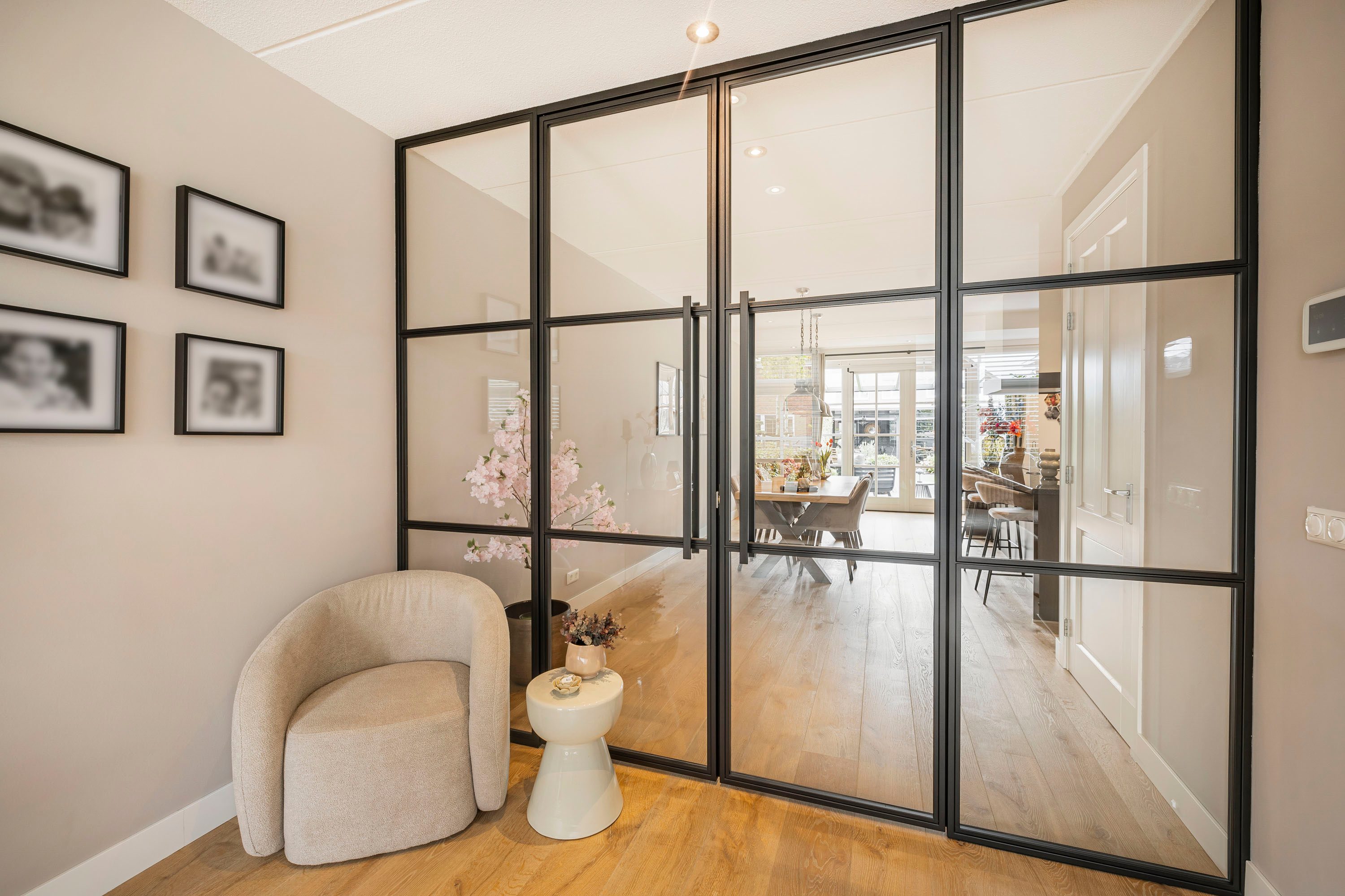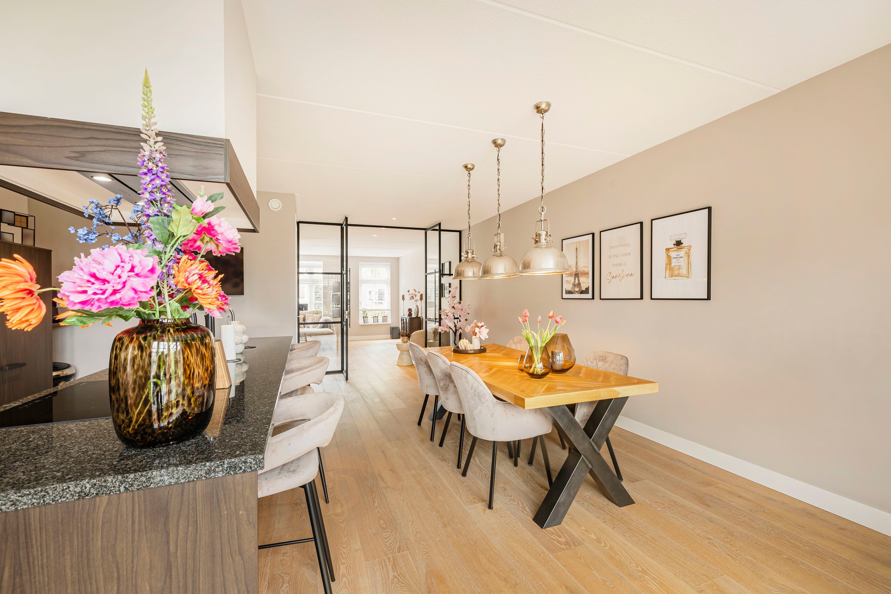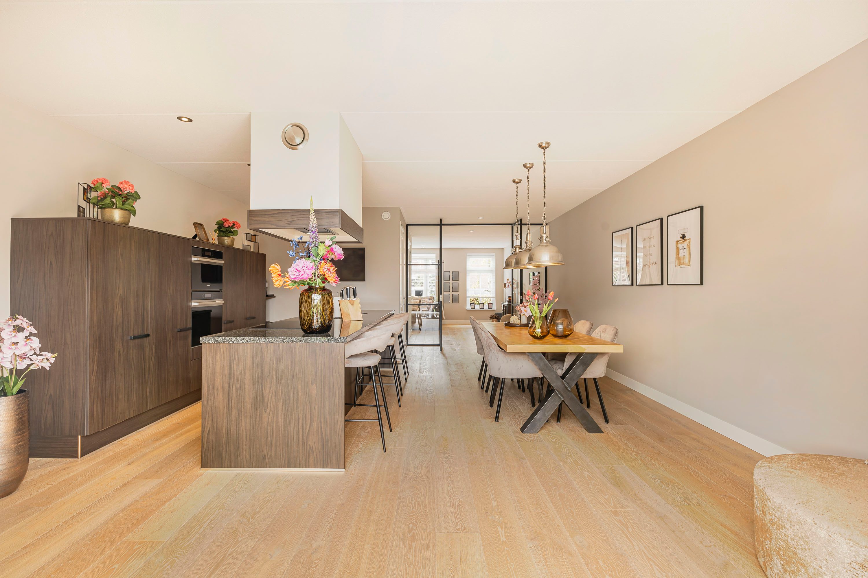 Vanaf je eigen oprit kom je bij de entree, waar je direct de meterkast, het toilet en de trapopgang aantreft. De ruime woonkamer aan de voorzijde biedt genoeg plek voor een grote zitbank en een gezellige zithoek. Via de openslaande taatsdeuren bereik je de ruime leefkeuken, waarin voldoende ruimte is voor een lange eettafel. De luxe open keuken valt op door het grote kookeiland waar je met barkrukken gezellig kunt zitten. Ook vind je er diverse inbouwapparatuur, zoals een kookplaat, afzuigkap, oven, combi-oven, koelkast, vaatwasser en Quooker. Dankzij de tuindeuren valt er veel licht binnen. Vanuit de keuken is er toegang tot een bijkeuken van 5,4 m², waar de aansluitingen voor wasmachine en droger aanwezig zijn. Daarnaast is er een berging van 9,1 m², ook bereikbaar via de oprit, wat ideaal is om al je spullen op te bergen. Bovendien is de begane grond uitgerust met vloerverwarming, wat tijdens de koude winterdagen erg prettig is.