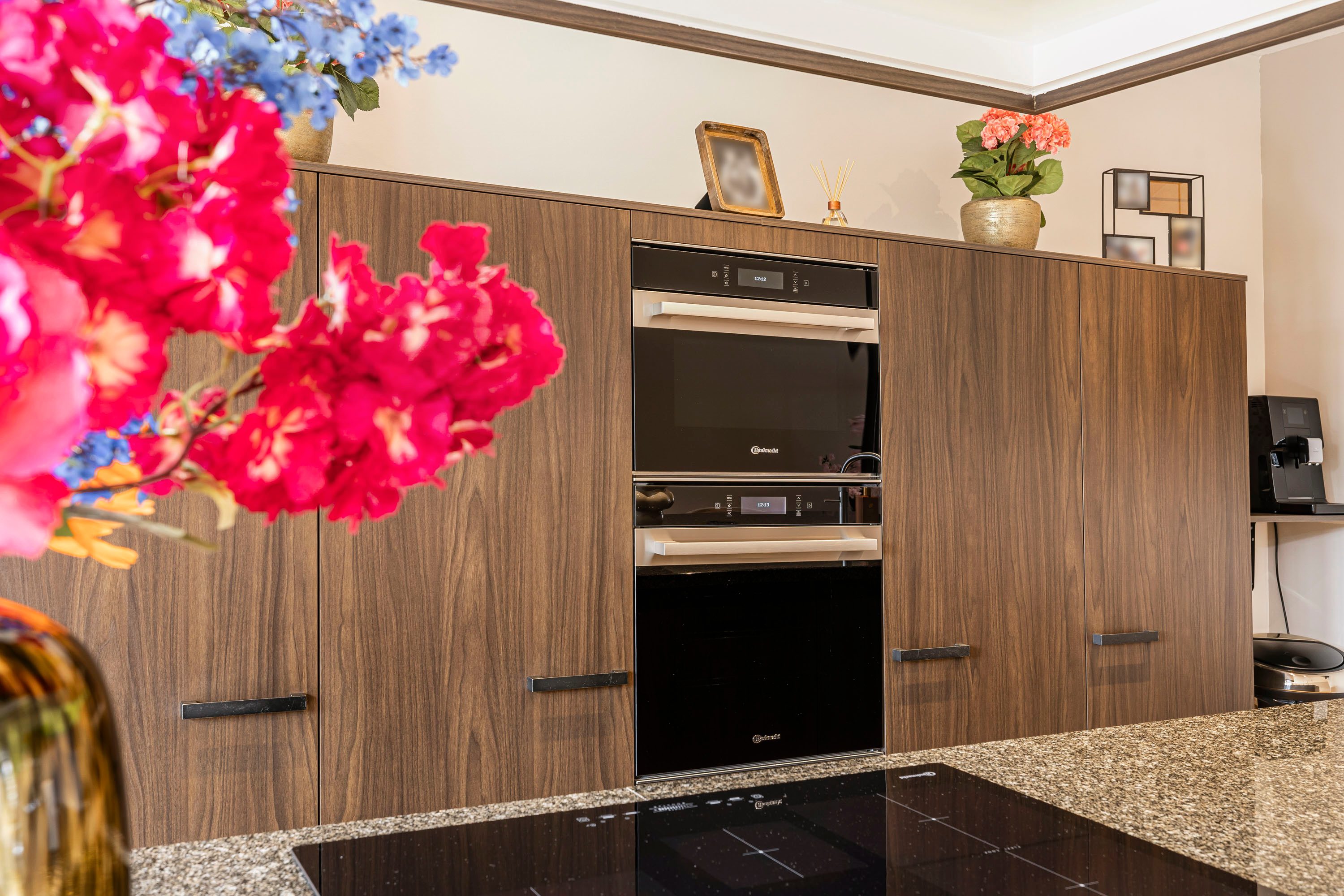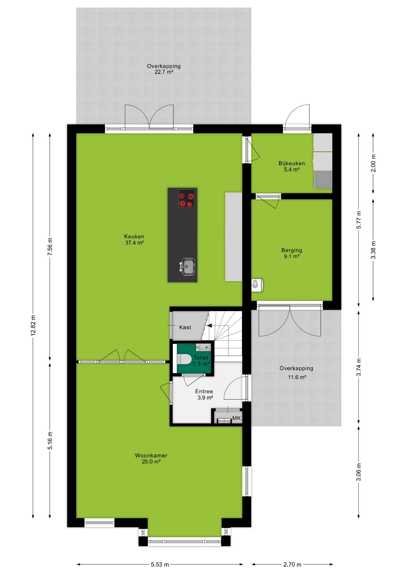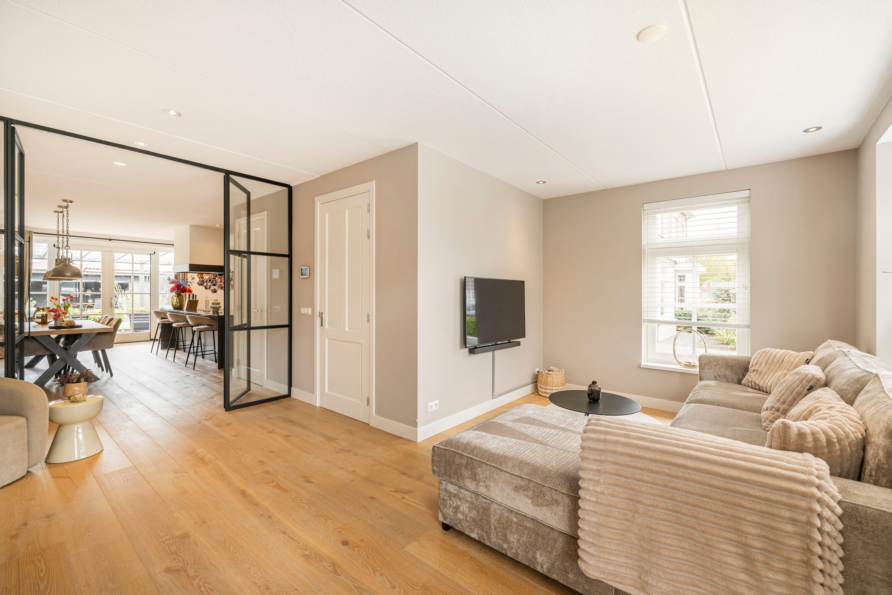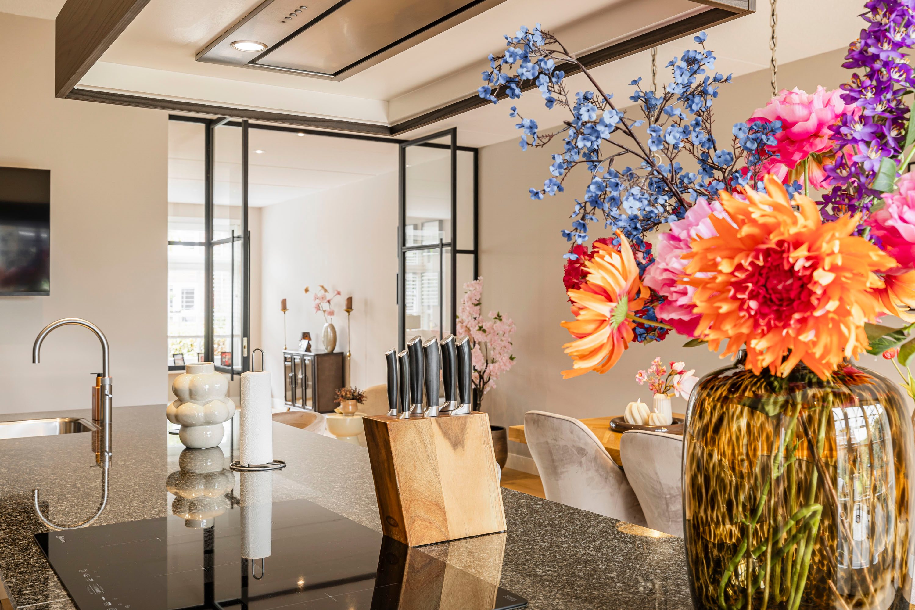 Vanaf je eigen oprit kom je bij de entree, waar je direct de meterkast, het toilet en de trapopgang aantreft. De ruime woonkamer aan de voorzijde biedt genoeg plek voor een grote zitbank en een gezellige zithoek. Via de openslaande taatsdeuren bereik je de ruime leefkeuken, waarin voldoende ruimte is voor een lange eettafel. De luxe open keuken valt op door het grote kookeiland waar je met barkrukken gezellig kunt zitten. Ook vind je er diverse inbouwapparatuur, zoals een kookplaat, afzuigkap, oven, combi-oven, koelkast, vaatwasser en Quooker. Dankzij de tuindeuren valt er veel licht binnen. Vanuit de keuken is er toegang tot een bijkeuken van 5,4 m², waar de aansluitingen voor wasmachine en droger aanwezig zijn. Daarnaast is er een berging van 9,1 m², ook bereikbaar via de oprit, wat ideaal is om al je spullen op te bergen. Bovendien is de begane grond uitgerust met vloerverwarming, wat tijdens de koude winterdagen erg prettig is.