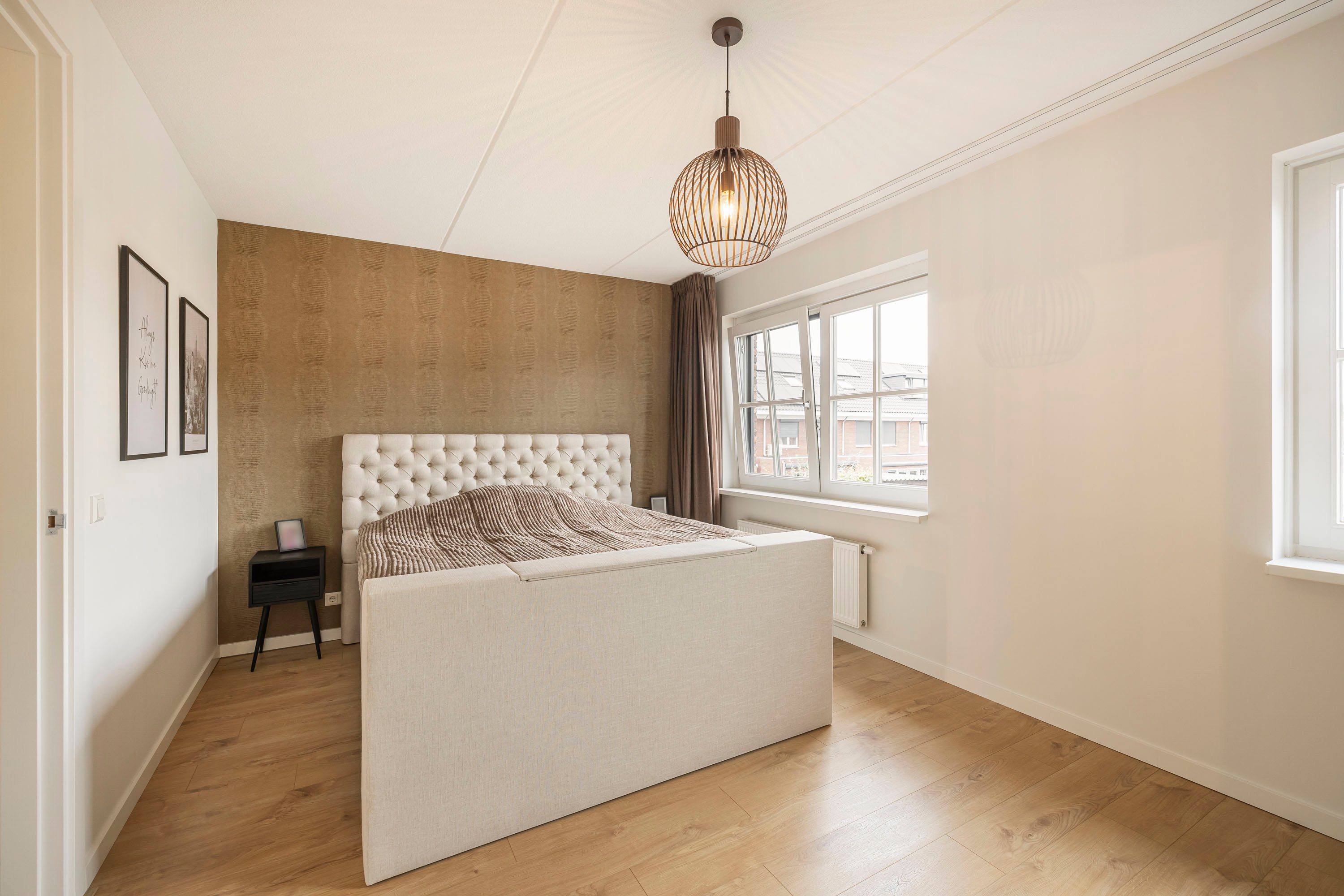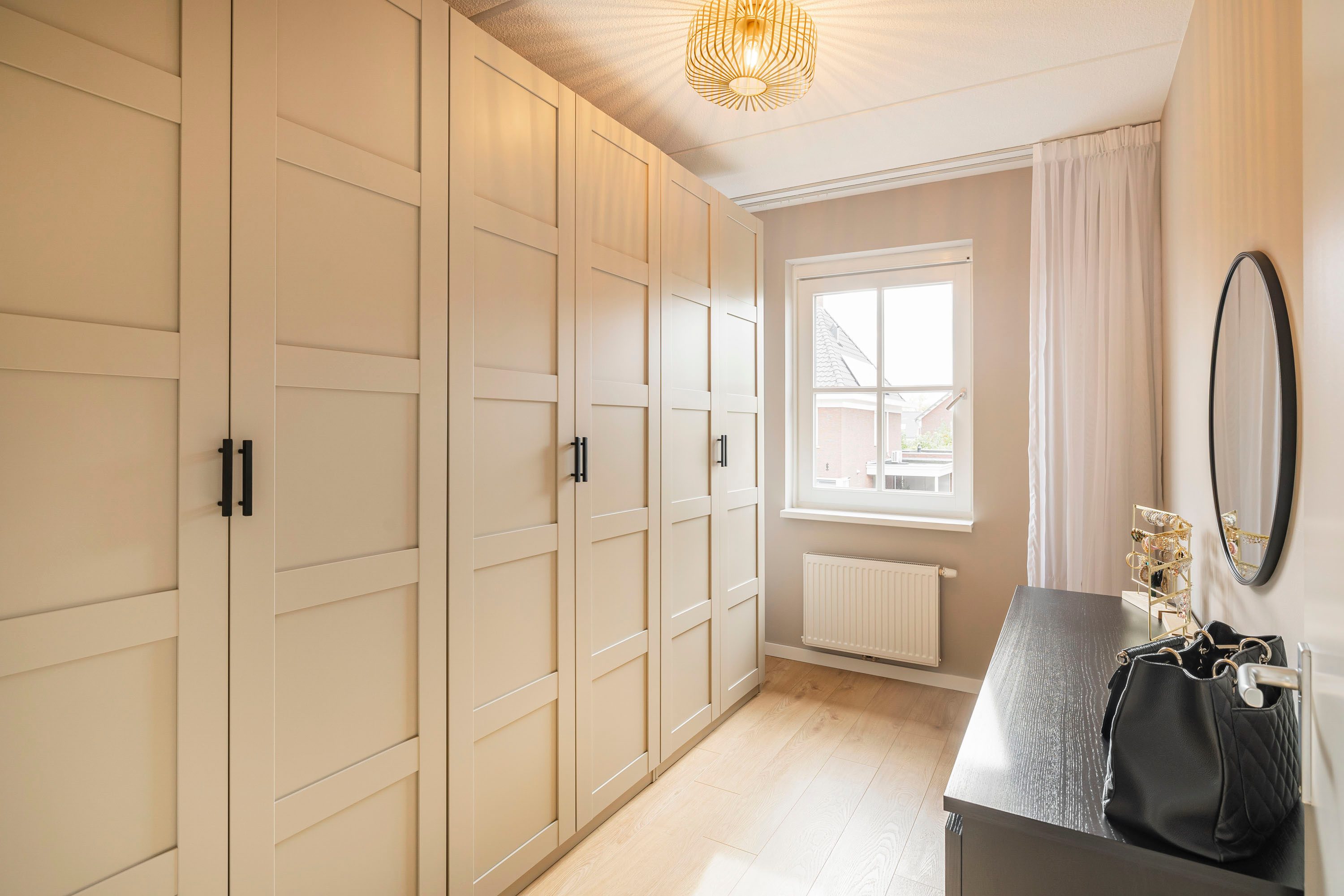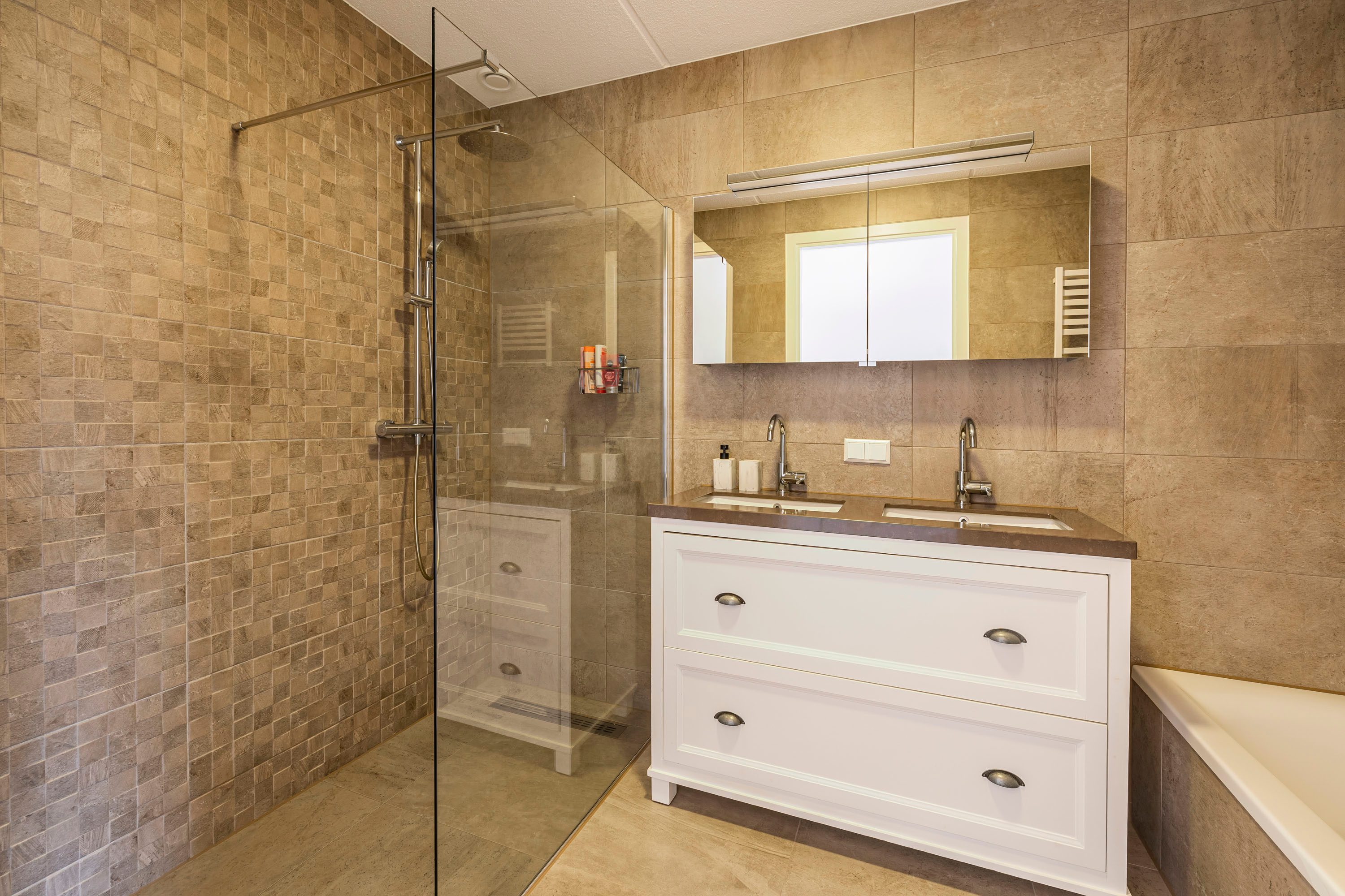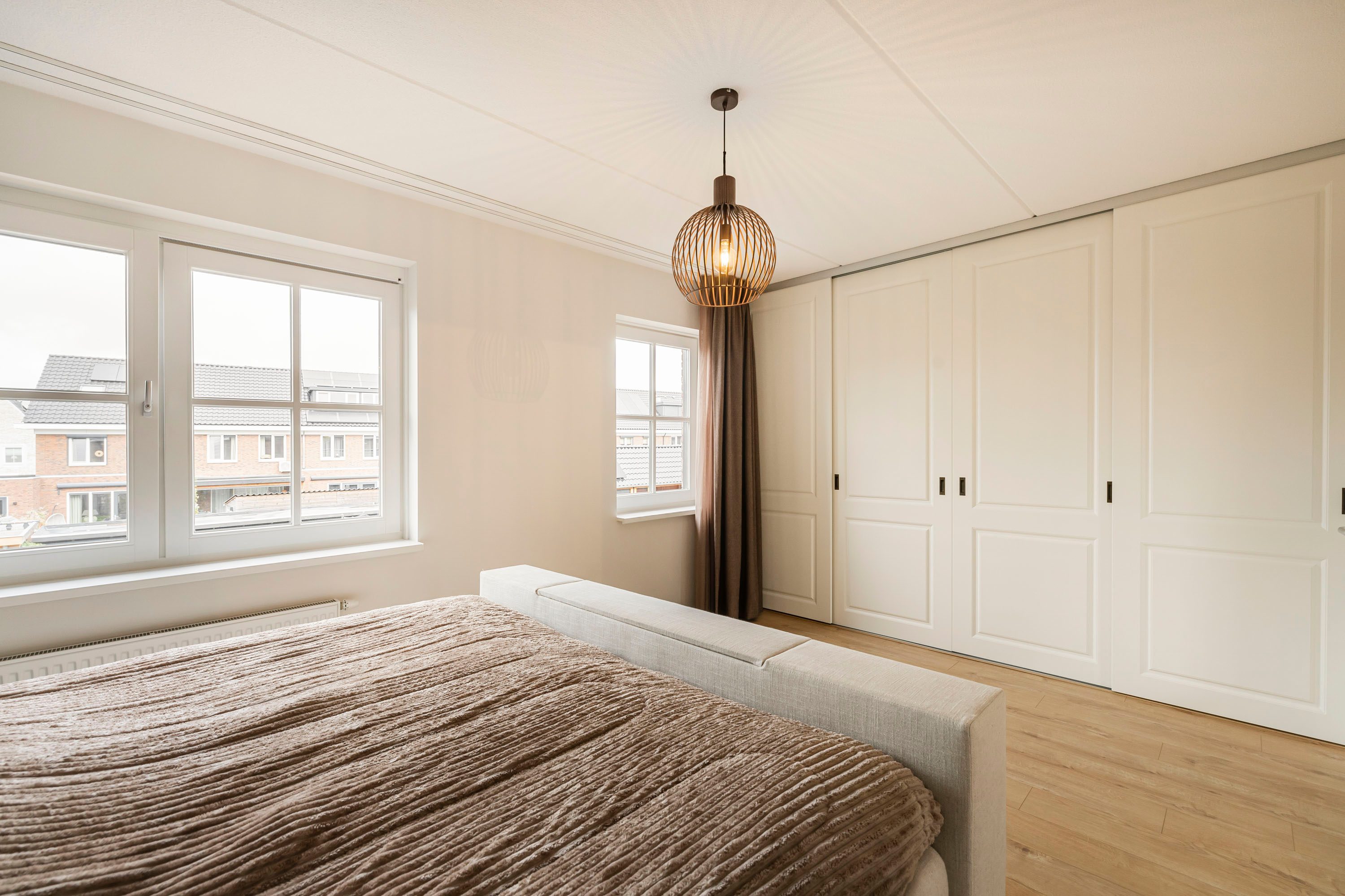 Via de ruime overloop kom je op de eerste verdieping, waar drie lichte slaapkamers te vinden zijn. Deze kamers hebben afmetingen van 7,7 m², 10,7 m² en maar liefst 18 m². De grootste slaapkamer valt op door de ingebouwde kastenwand, wat een extra luxe uitstraling geeft. De badkamer van 6,3 m² is uitgerust met beige tegels en voorzien van een dubbele wastafel, een inloopdouche en een fijn ligbad. Het toilet bevindt zich in de tegenoverliggende ruimte.