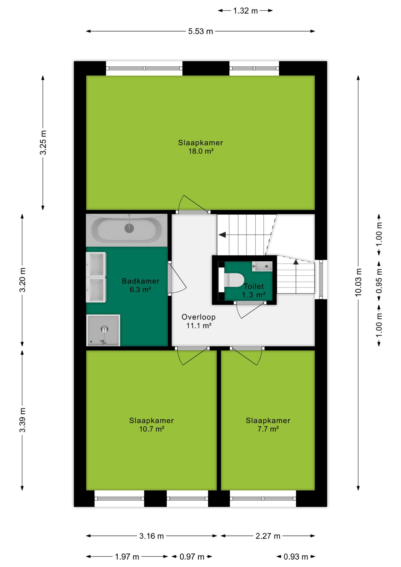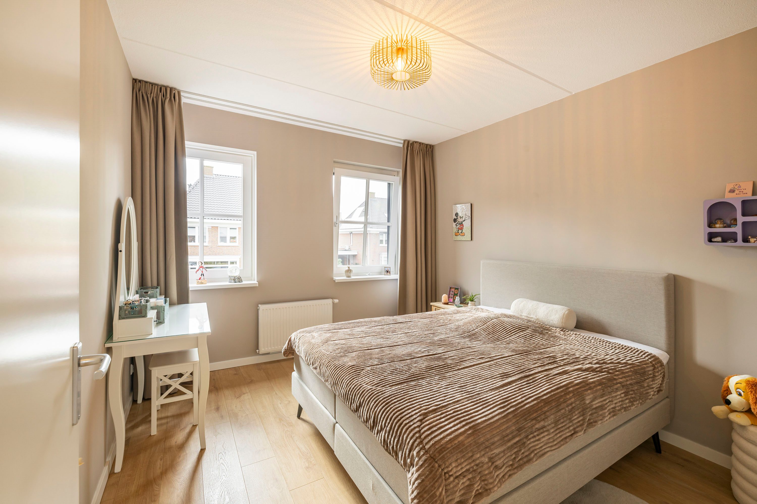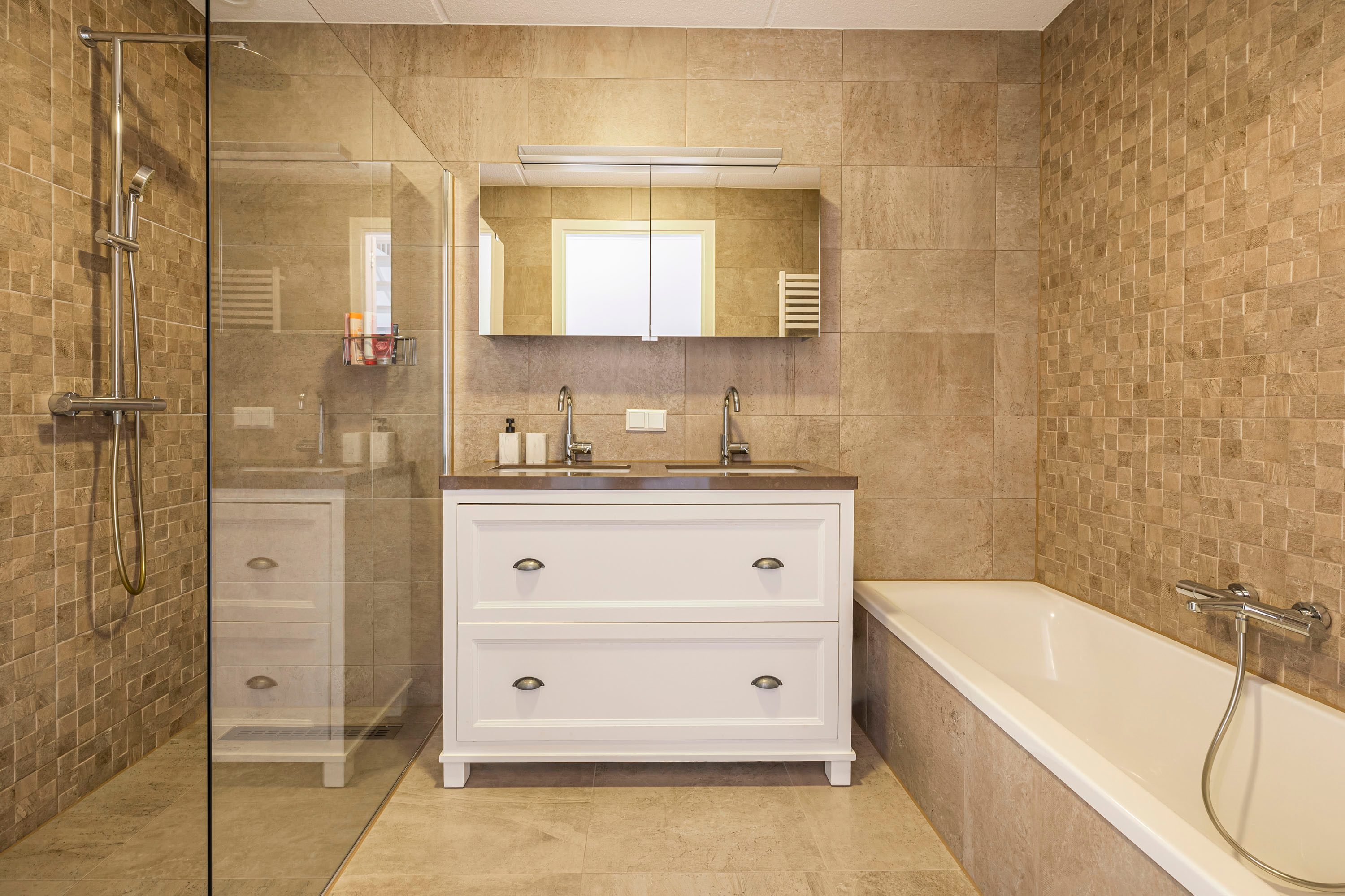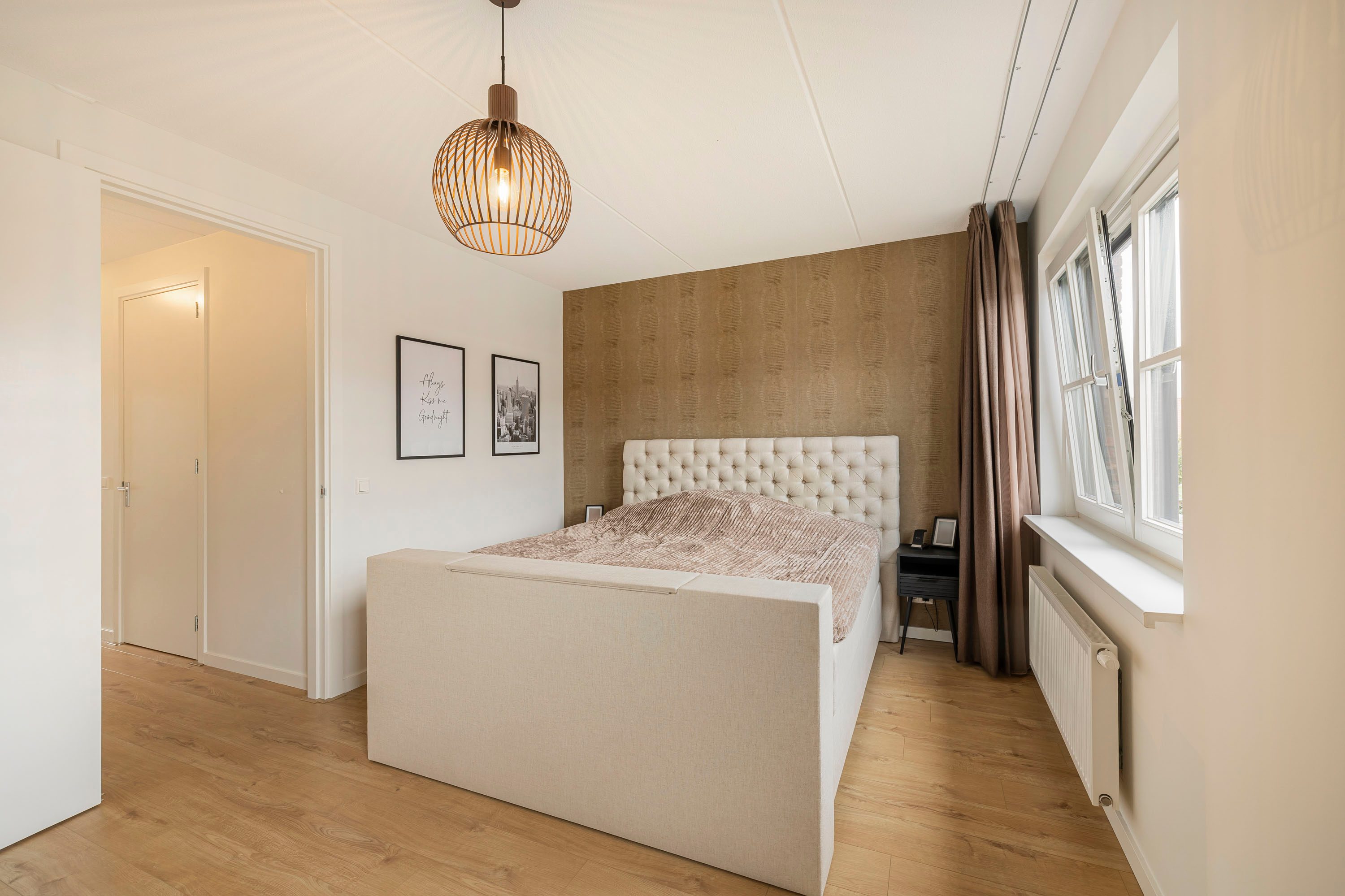 Via de ruime overloop kom je op de eerste verdieping, waar drie lichte slaapkamers te vinden zijn. Deze kamers hebben afmetingen van 7,7 m², 10,7 m² en maar liefst 18 m². De grootste slaapkamer valt op door de ingebouwde kastenwand, wat een extra luxe uitstraling geeft. De badkamer van 6,3 m² is uitgerust met beige tegels en voorzien van een dubbele wastafel, een inloopdouche en een fijn ligbad. Het toilet bevindt zich in de tegenoverliggende ruimte.