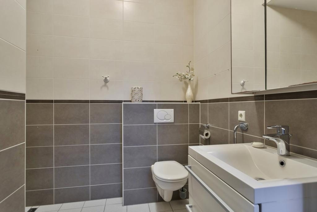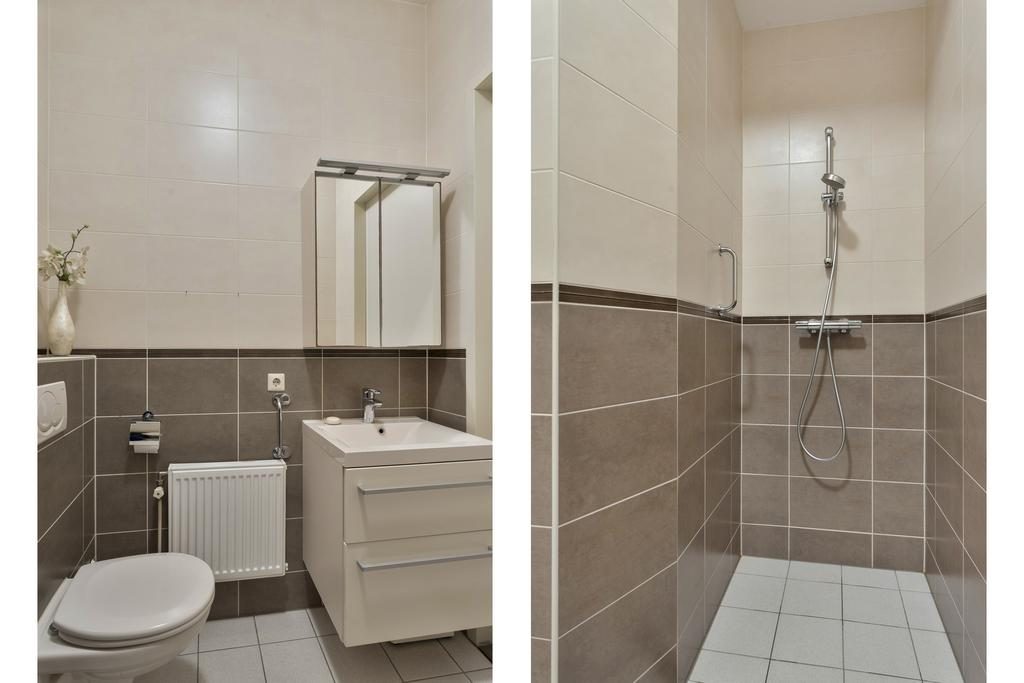 De nette badkamer is volledig betegeld en beschikt over een inloopdouche met een thermostaatkraan. Daarnaast vind je er een toilet, een wastafelmeubel en een spiegelkast voor handige opbergruimte. Een radiator zorgt voor een aangename temperatuur, waardoor de badkamer zowel praktisch als functioneel is ingericht.