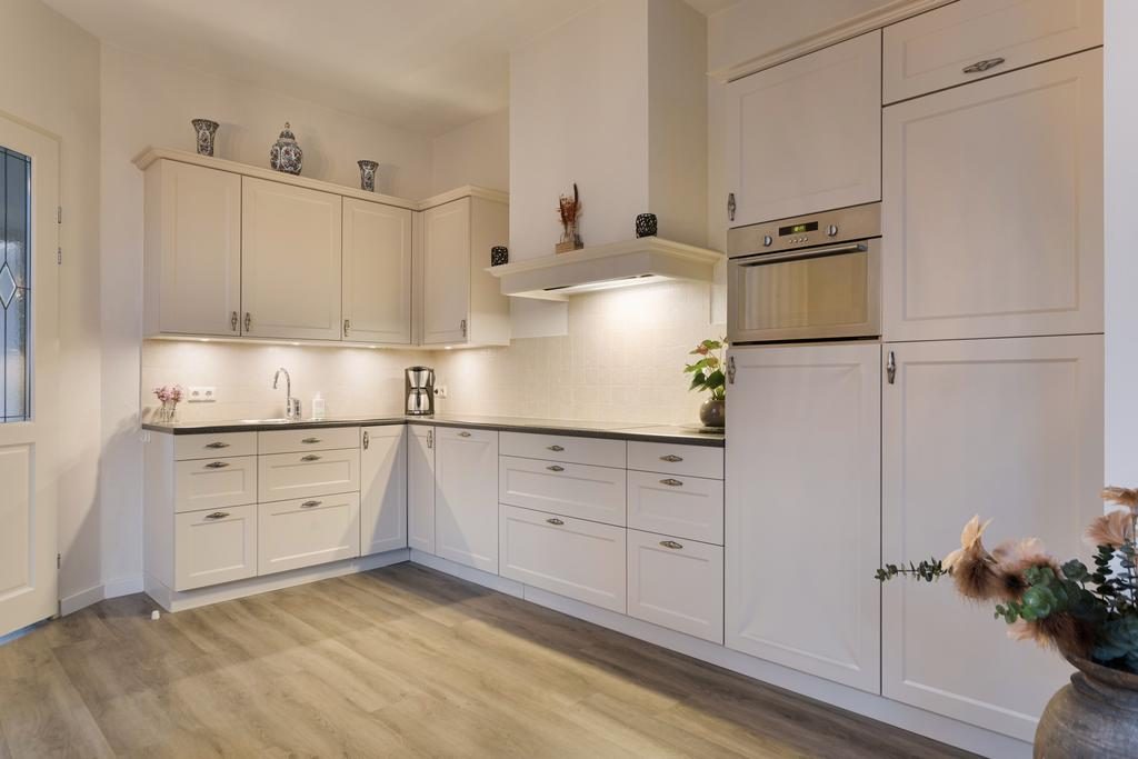 De open keuken is uitgevoerd in een L vormige opstelling met lichte kasten en donker werkblad. Deze nette keuken is voorzien van diverse inbouwapparatuur. Tot de apparatuur behoren een vaatwasser, oven, koel-/vriescombinatie, een inductiekookplaat en een afzuigkap die netjes in de schouw is geïntegreerd. Met zowel onderkasten als bovenkasten is er voldoende ruimte om al je keukengerei, servies en voorraad georganiseerd op te bergen.