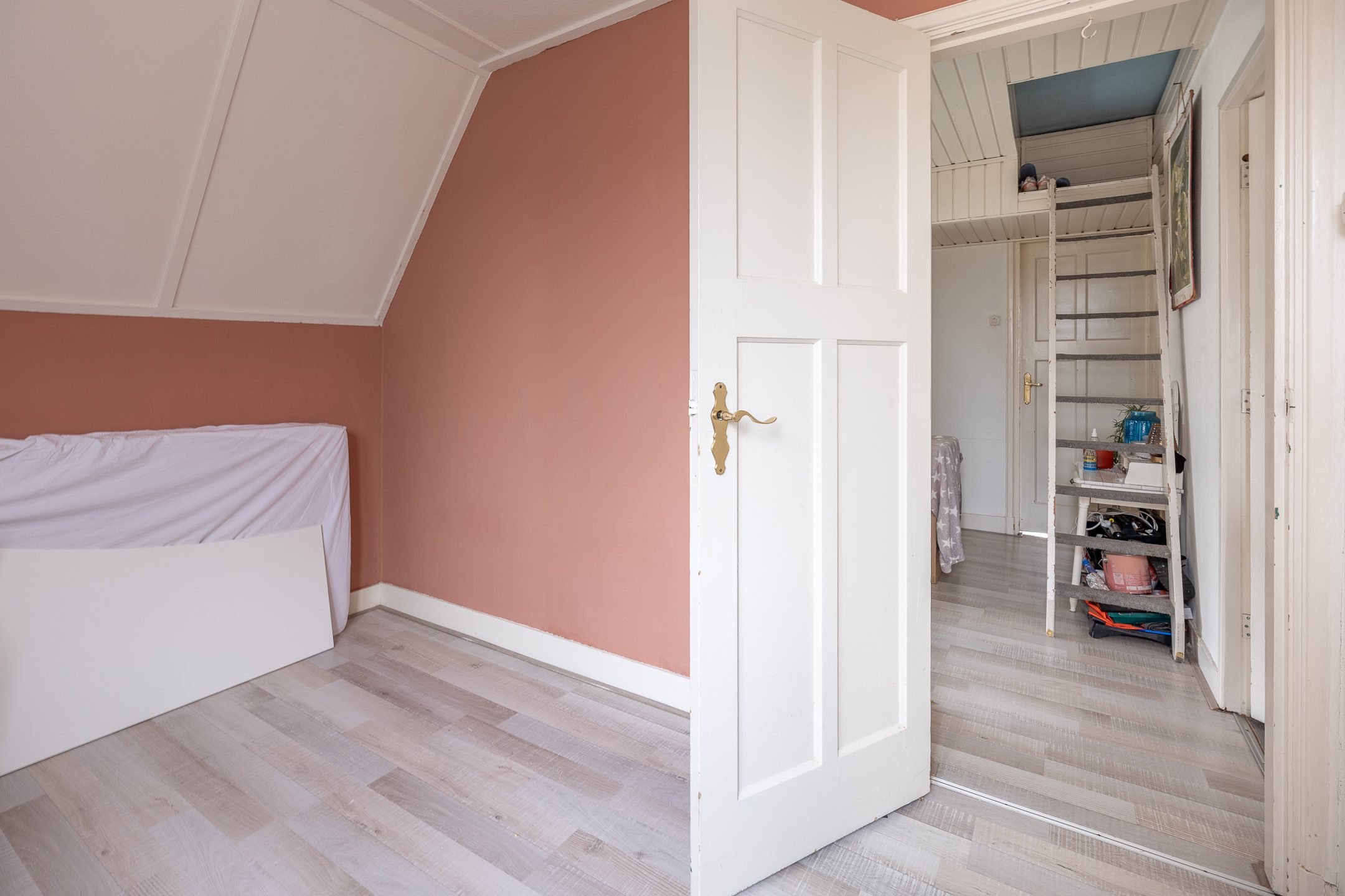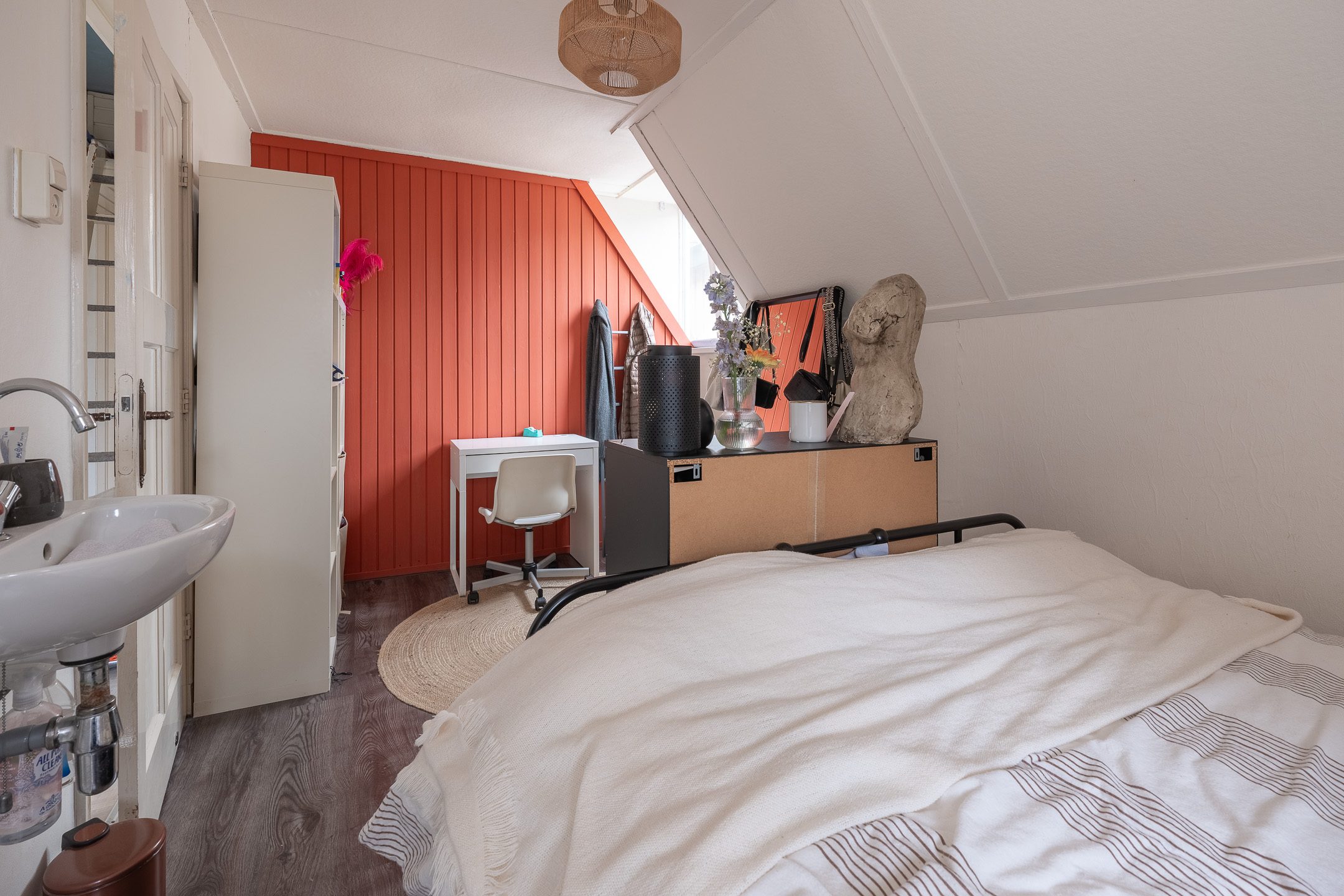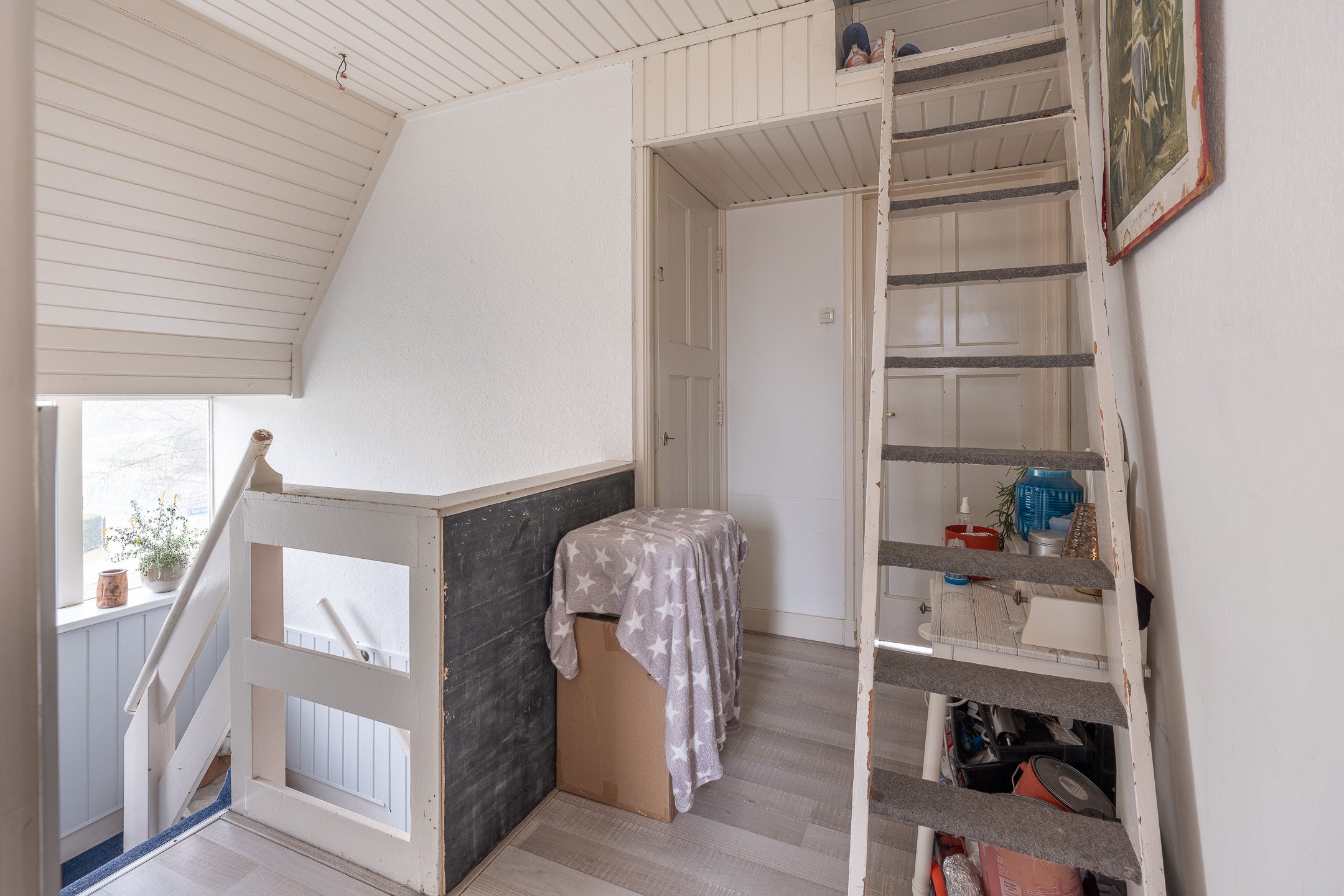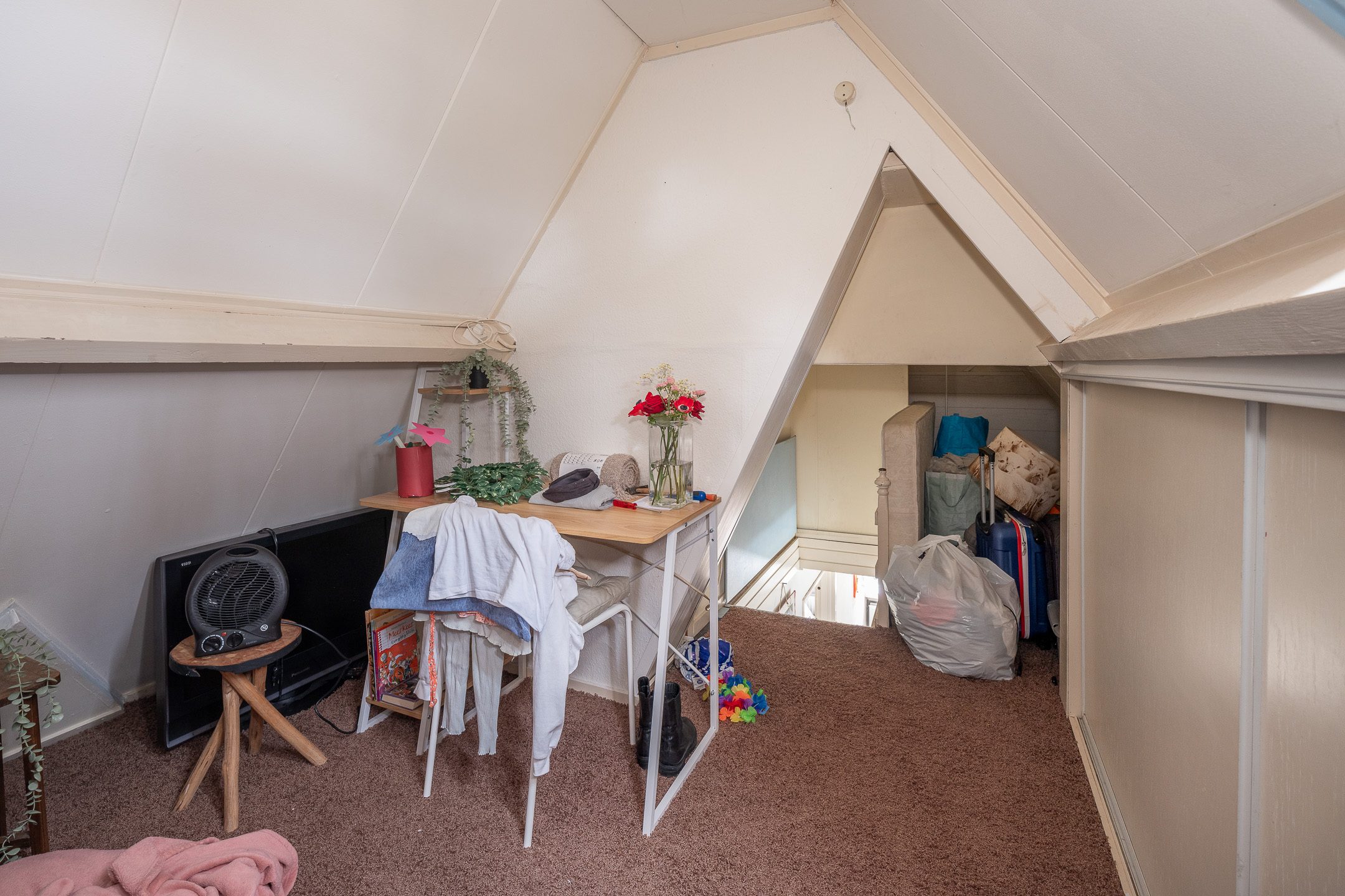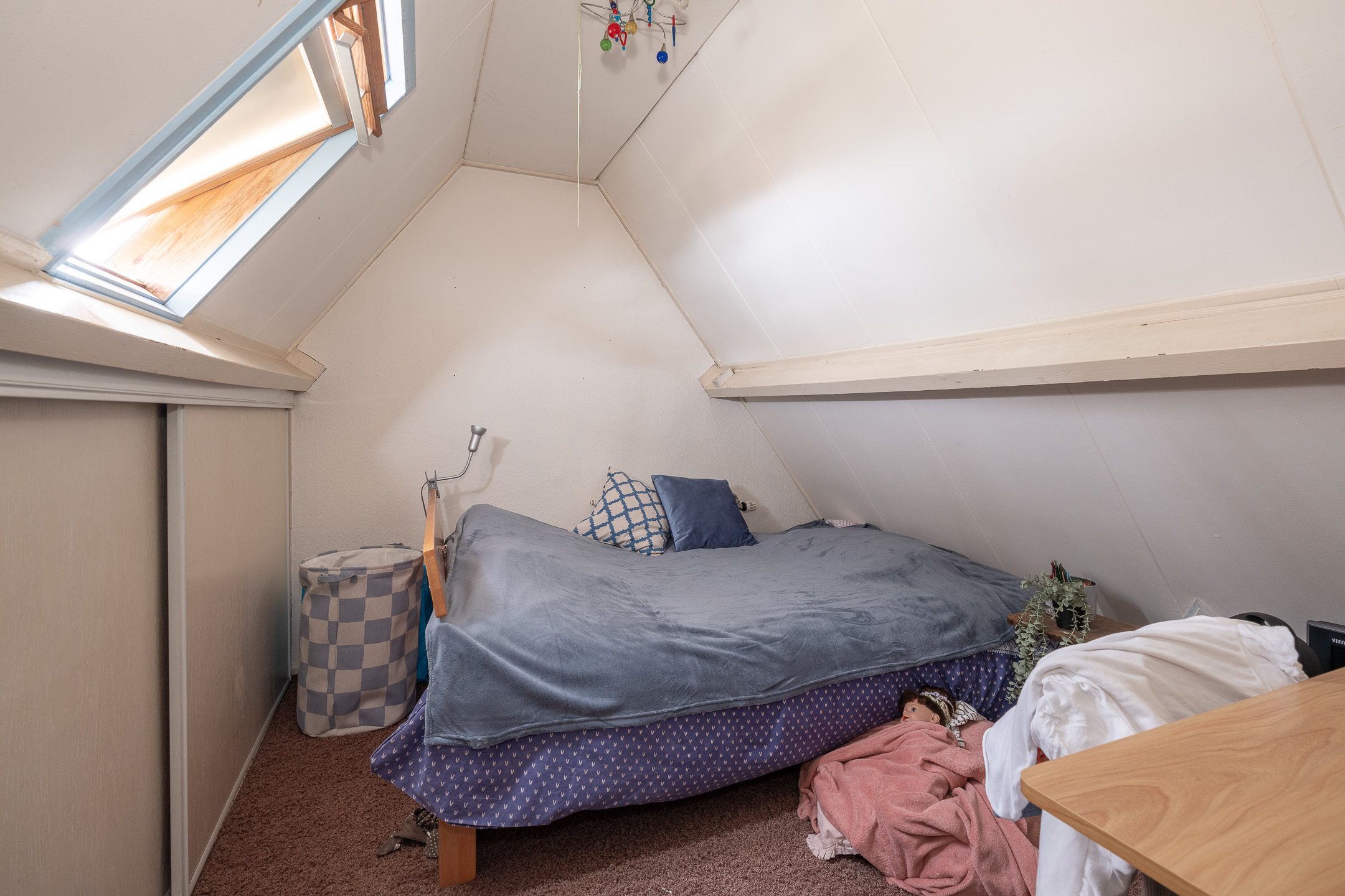 Op de zolder bevindt zich een slaapkamer met een dakraam en genoeg bergruimte.