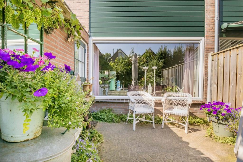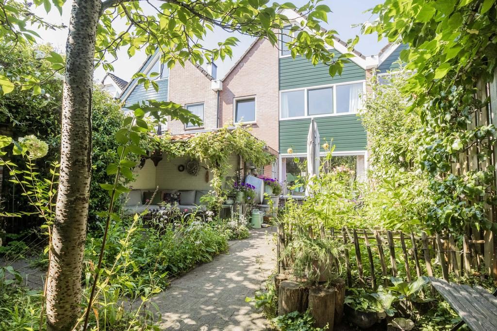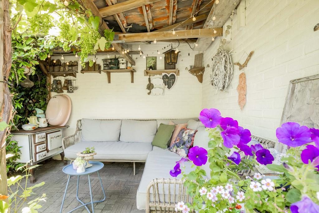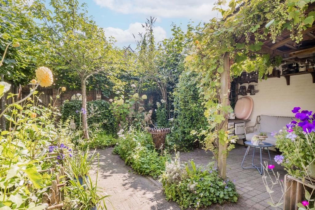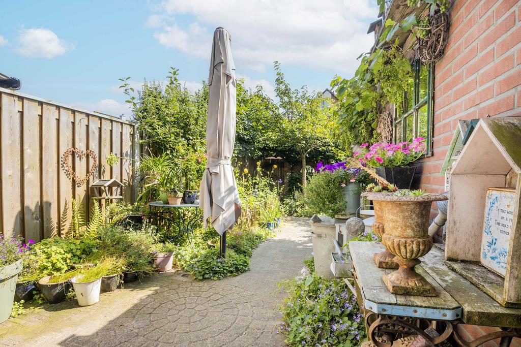 Via de berging kom je in de tuin, die met zorg is aangelegd en je het gevoel geeft in een groene oase te zijn. De weelderige beplanting maken het een ideale plek om te ontspannen en te genieten. Bovendien beschikt de tuin over een charmante veranda, waar je heerlijk kunt zitten, ongeacht het weer. Deze overdekte ruimte biedt een perfecte plek voor buitenmaaltijden of om simpelweg te genieten van de rust en het uitzicht op de tuin. Aan de achterzijde van de woning is er ook toegang, wat het gemakkelijk maakt om de woning van verschillende kanten te bereiken.
