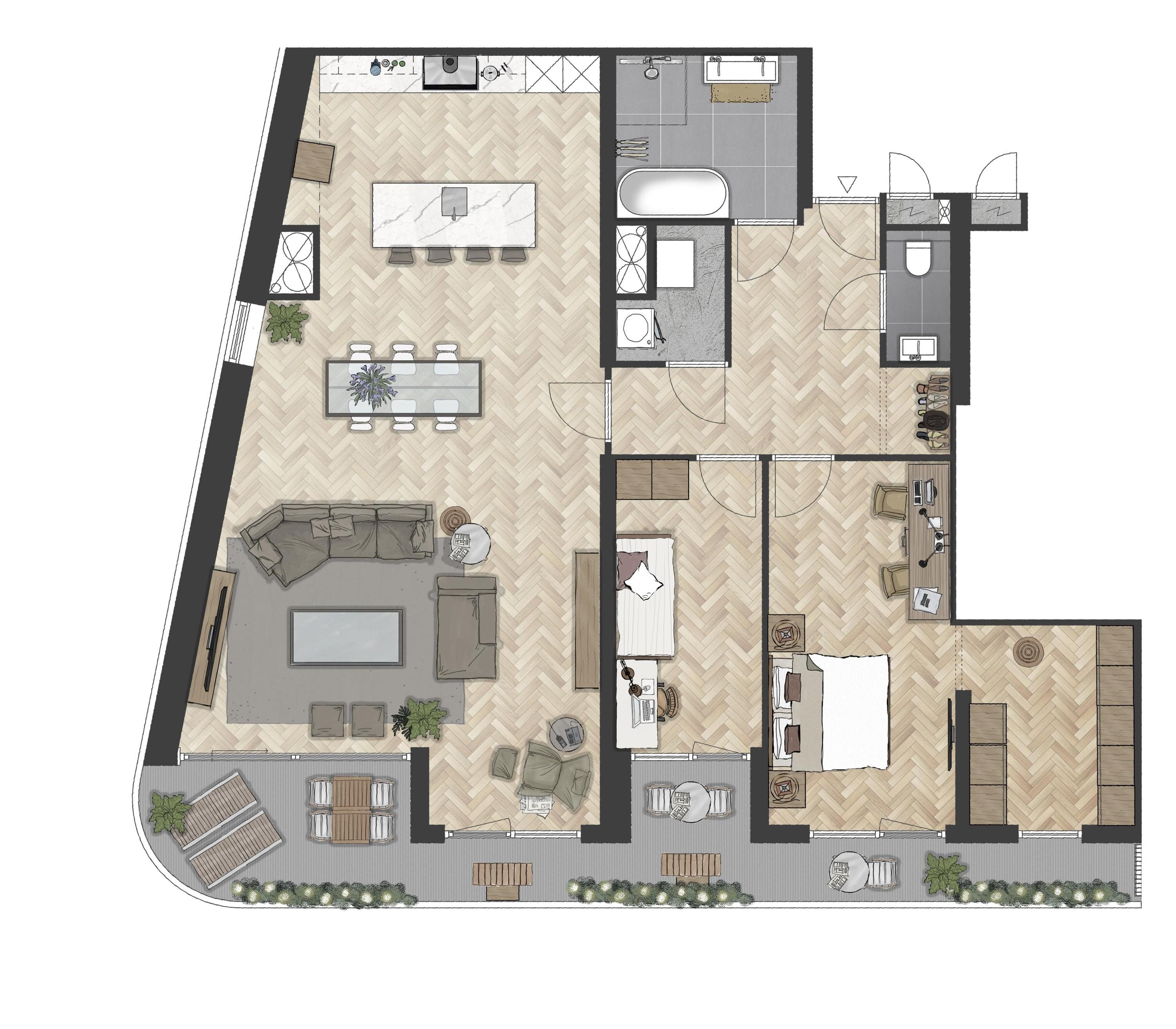 Dit type top-appartement van maar liefst 130m2 is gelegen op de 4e t/m de 7e verdieping. De zeer ruime woonkamer en keuken bieden de mogelijkheid voor diverse indelingsvarianten. Een grote keuken met kookeiland zou hier niet misstaan. Ook dit appartement heeft een grote hal met de mogelijkheid om een ruime garderobe te creëren. Vanuit beide slaapkamers heeft u directe toegang tot het terras met voldoende ruimte voor zowel meubilair als plantenbakken. Het balkon is gericht op het westen en biedt de mogelijkheid om diverse zithoekjes te maken.