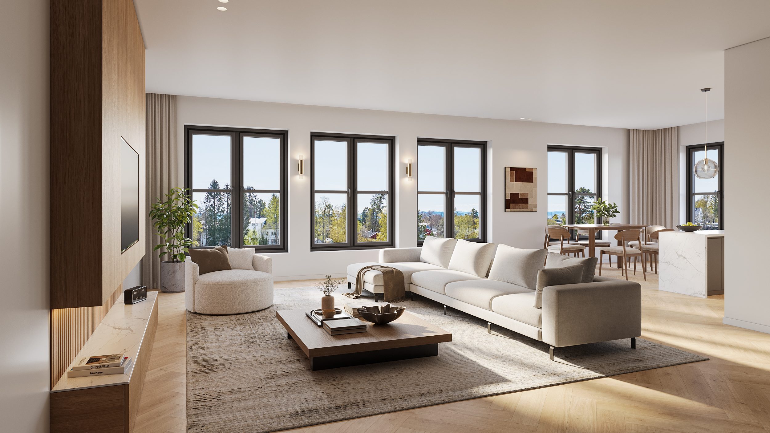 Het appartement beschikt over circa 95 m² woonoppervlak en is verrassend ruim ingedeeld. De woonkamer van ca. 45 m² is het centrale leefgedeelte, met een open keukenopstelling, zitgedeelte en ruimte voor een grote eettafel. De schuifpui geeft toegang tot het terras van 24 m², gelegen op het zuidwesten – perfect voor een kop koffie in de zon.