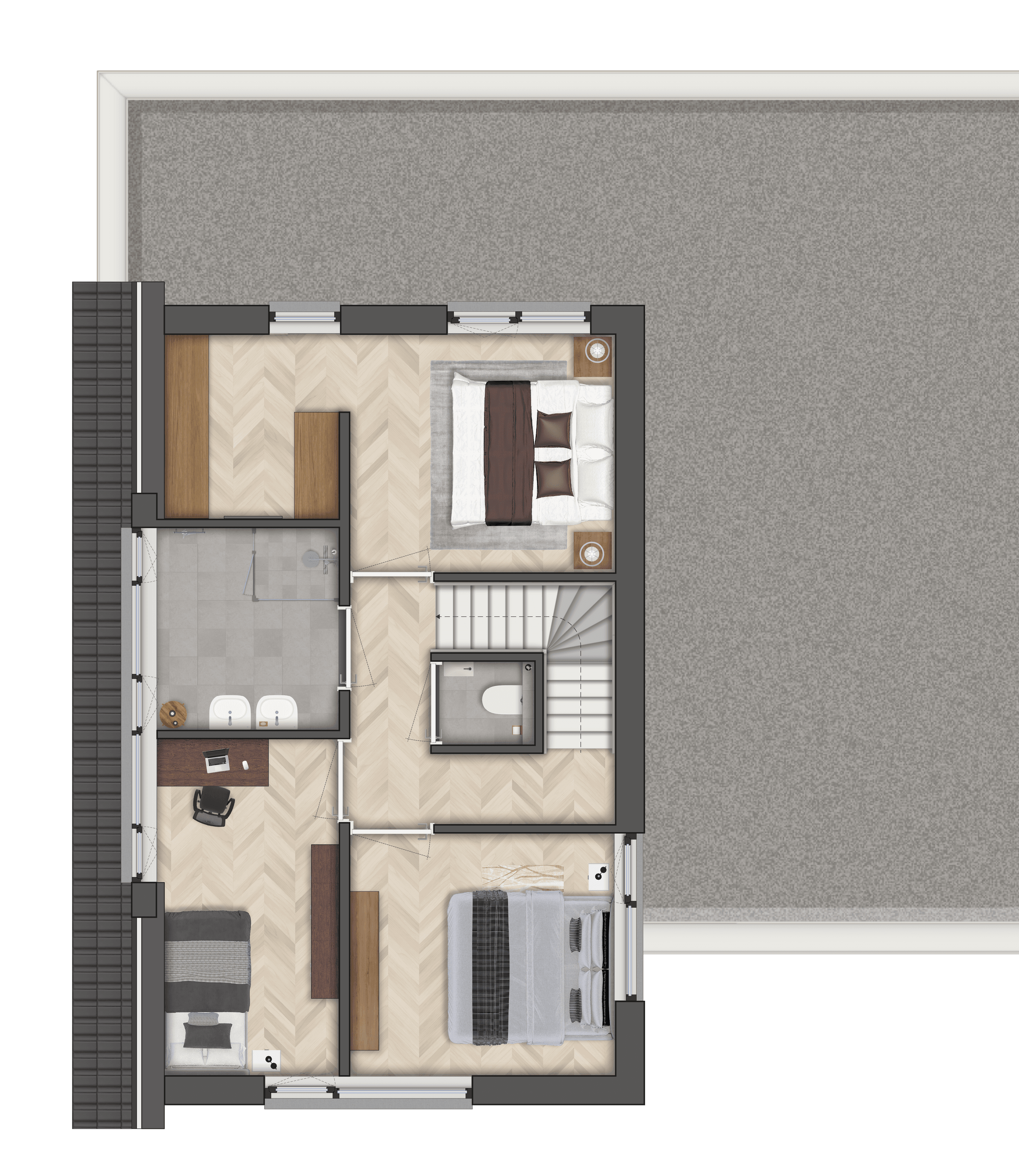 + In de huidige indeling heeft de woning drie slaapkamers, met ruimte op de tweede verdieping voor het realiseren van twee extra slaapkamers