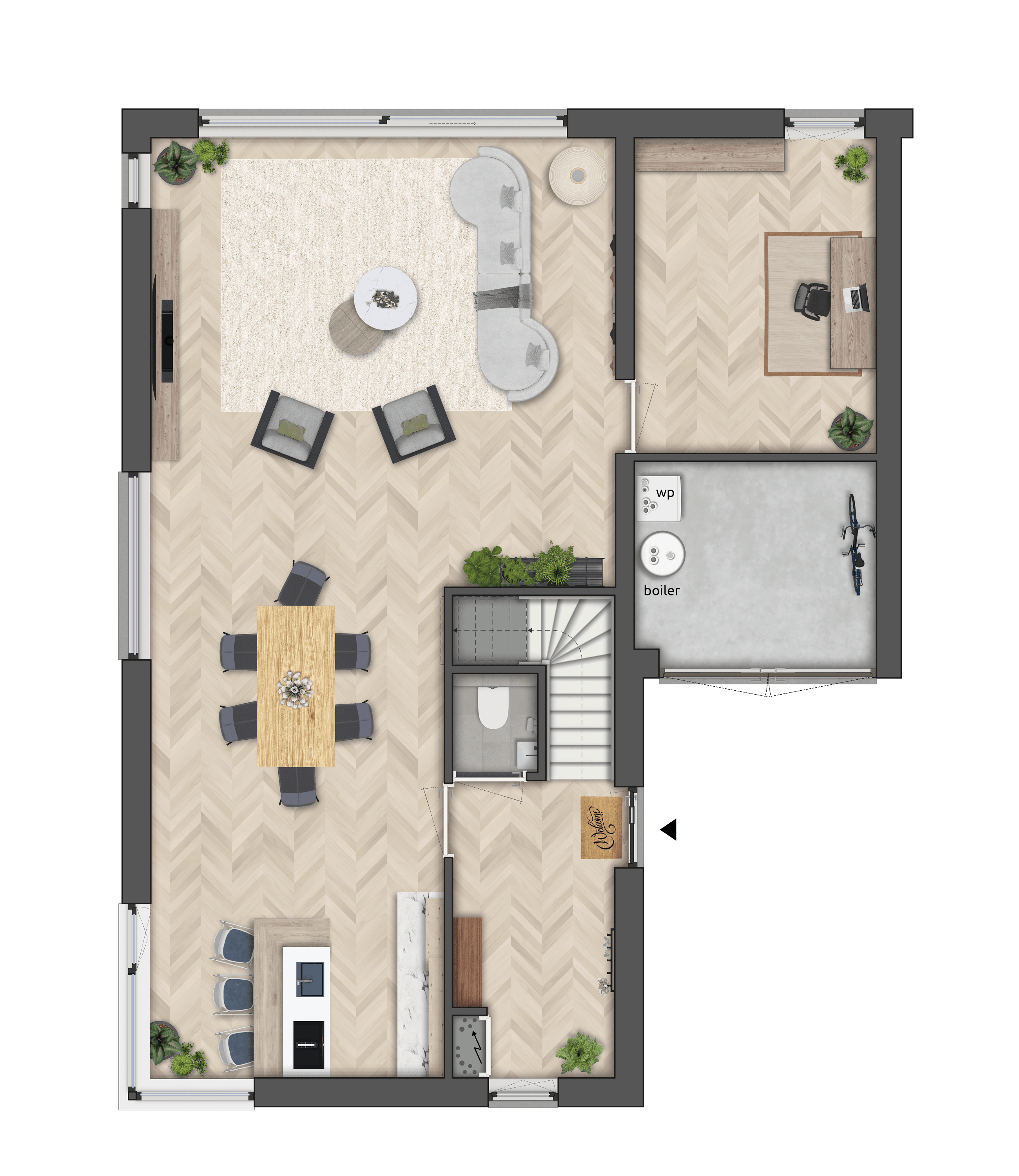 Wil je een grotere woonkamer of een werkkamer op de begane grond? Het is mogelijk om een deel van de berging bij de woonkamer te betrekken.