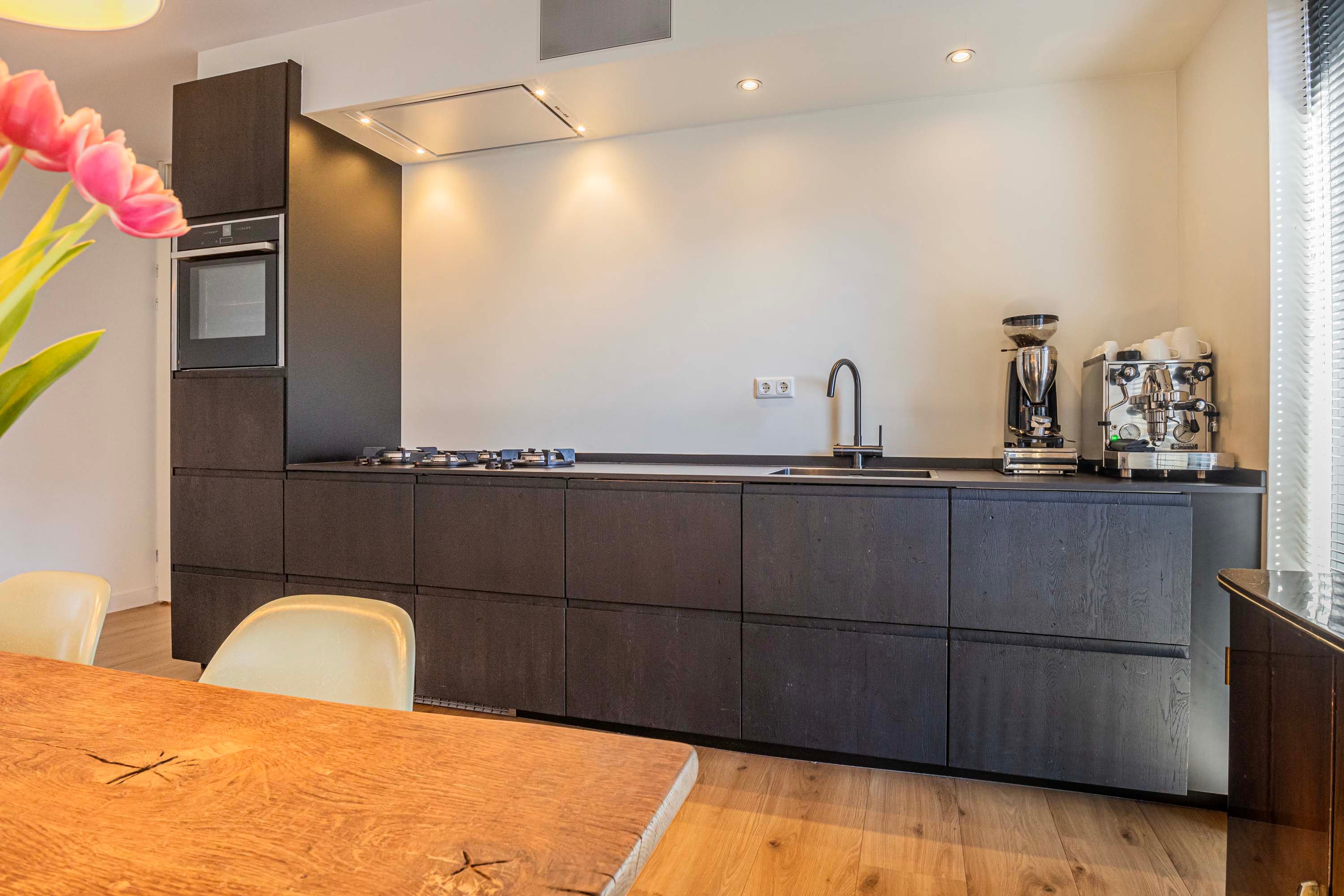 De ruime woonkamer is voorzien van hoge raampartijen met aluminium kozijnen, wat een heerlijk natuurlijk lichtinval geeft en door de franse balkons kan je hier ook in de buitenlucht genieten. De open keuken beschikt over een keuken in rechte opstelling en beschikt over de volgende apparatuur: Pitt Cooking, kokendwaterkraan, afzuigkap, oven, koelkast en een vaatwasser. Het werkblad is van keramiek en de keukenfronten zijn van massief eiken. Door de raampartijen in de keuken ervaar je hier ook een prettig daglicht.