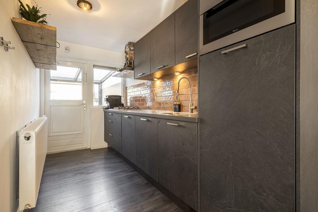 De keuken is gelegen in de uitbouw en gesitueerd tussen de woon-/eetkamer en tuin. Qua uitvoering is er gekozen voor donkere keukenkastjes, een betegelde achterwand en de benodigde inbouwapparatuur zoals een koelkast, vaatwasser, combi-oven en een gasfornuis met afzuigkap. Vanuit de keuken is middels een loopdeur de serre en achtertuin te bereiken.