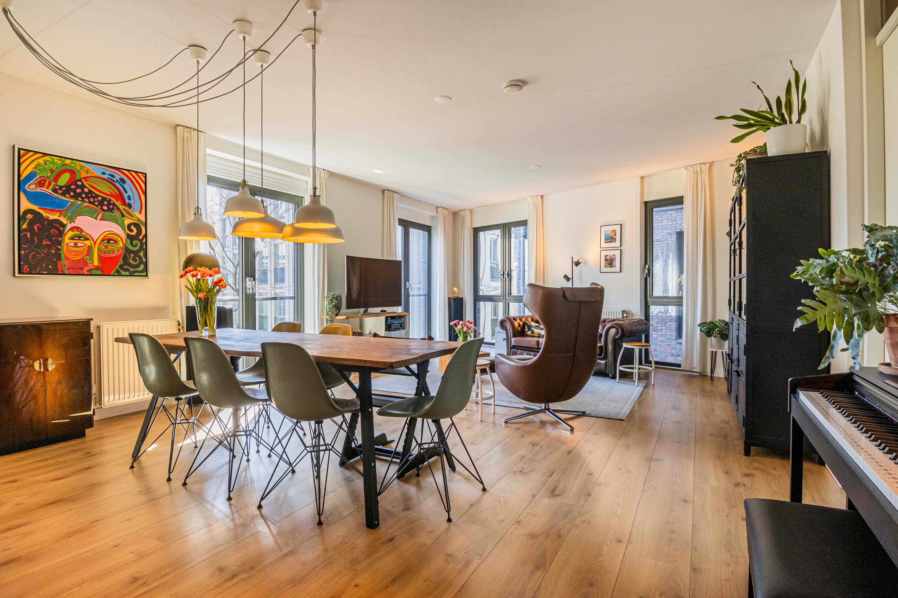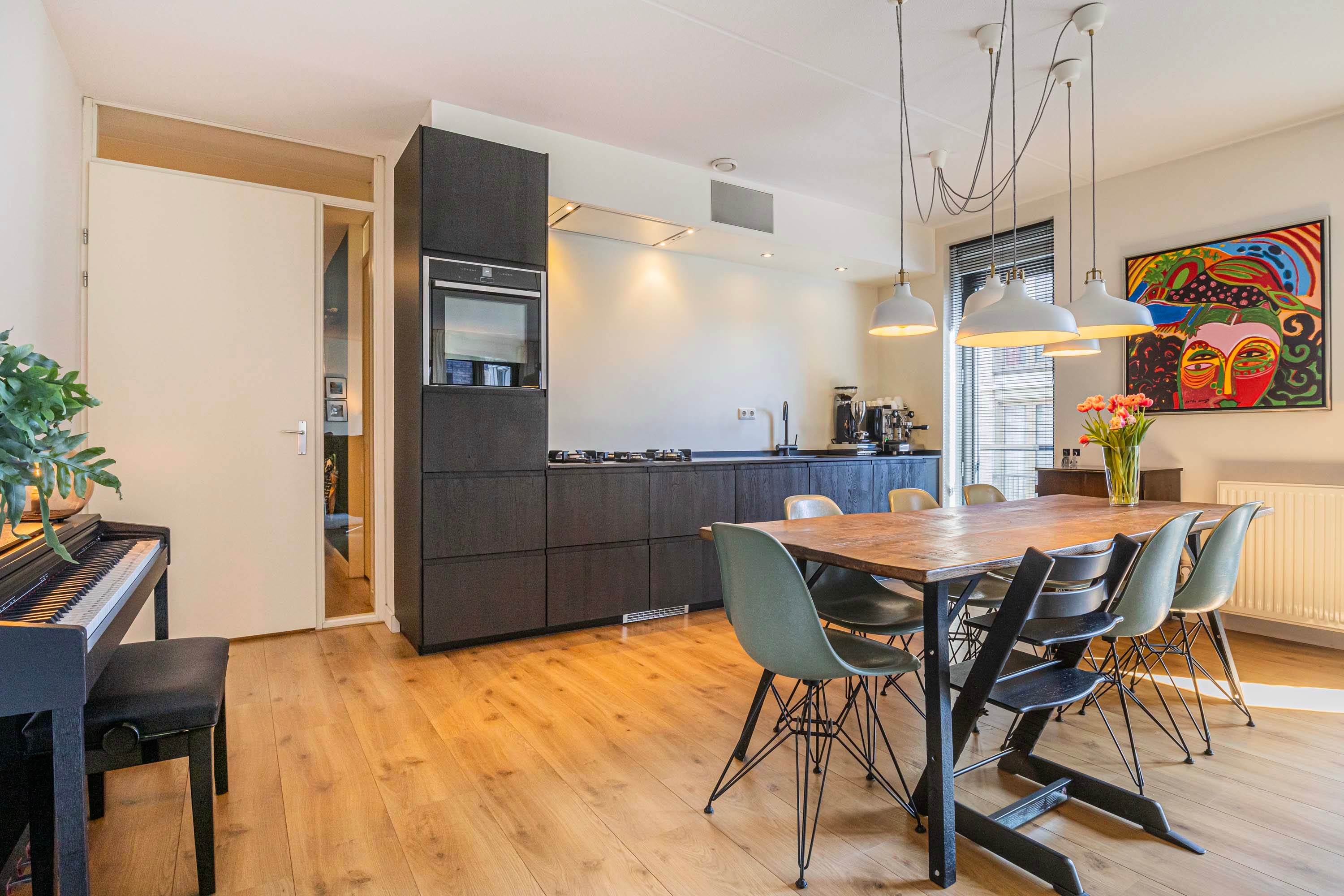 De ruime woonkamer is voorzien van hoge raampartijen met aluminium kozijnen, wat een heerlijk natuurlijk lichtinval geeft en door de franse balkons kan je hier ook in de buitenlucht genieten. De open keuken beschikt over een keuken in rechte opstelling en beschikt over de volgende apparatuur: Pitt Cooking, kokendwaterkraan, afzuigkap, oven, koelkast en een vaatwasser. Het werkblad is van keramiek en de keukenfronten zijn van massief eiken. Door de raampartijen in de keuken ervaar je hier ook een prettig daglicht.