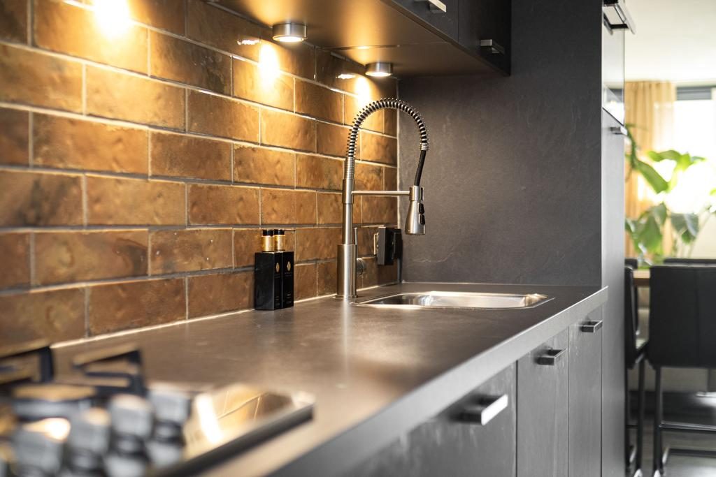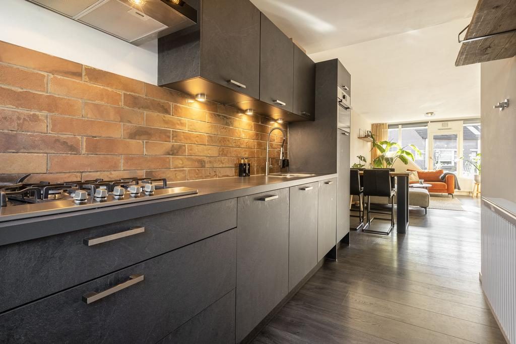 De keuken is gelegen in de uitbouw en gesitueerd tussen de woon-/eetkamer en tuin. Qua uitvoering is er gekozen voor donkere keukenkastjes, een betegelde achterwand en de benodigde inbouwapparatuur zoals een koelkast, vaatwasser, combi-oven en een gasfornuis met afzuigkap. Vanuit de keuken is middels een loopdeur de serre en achtertuin te bereiken.