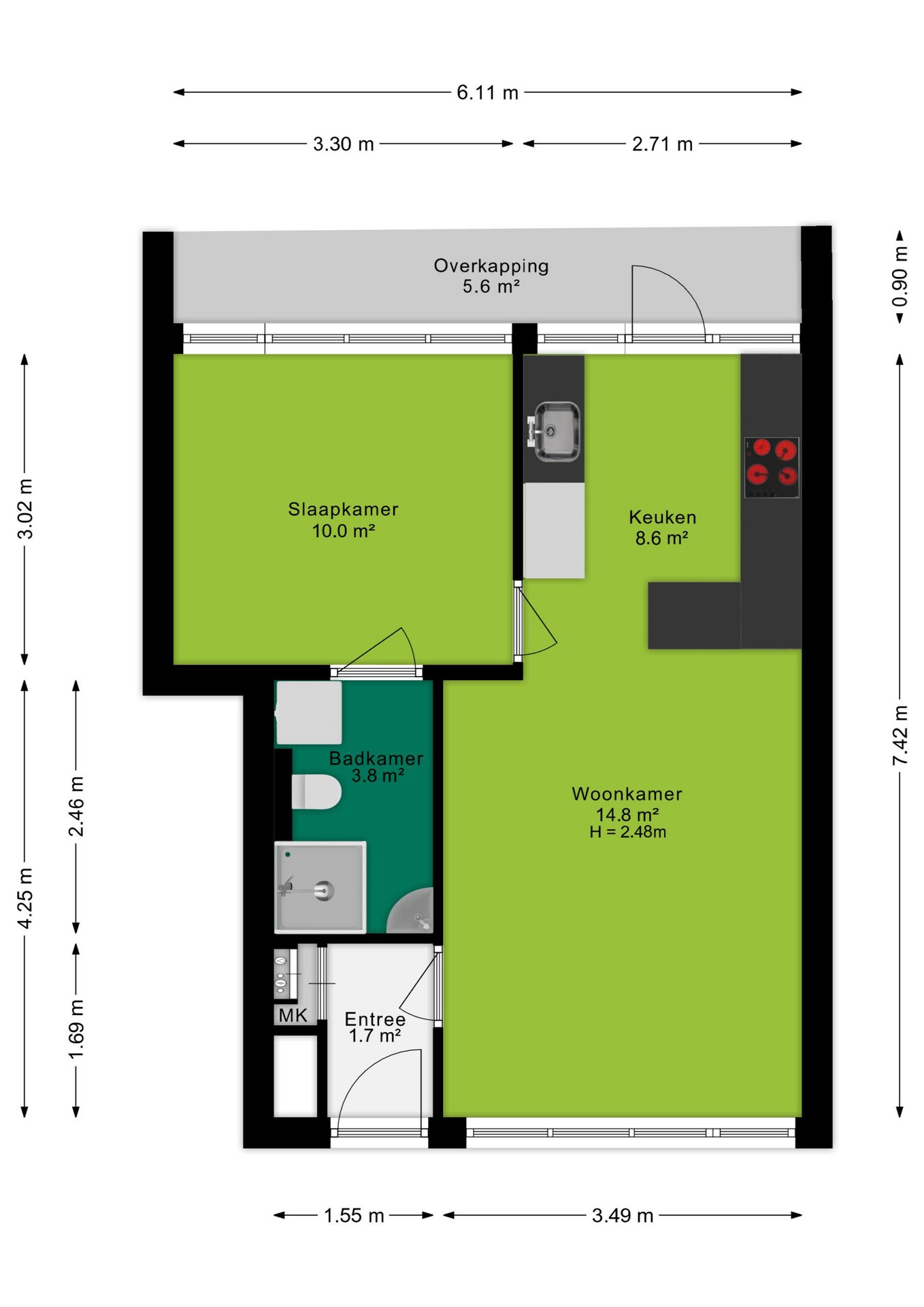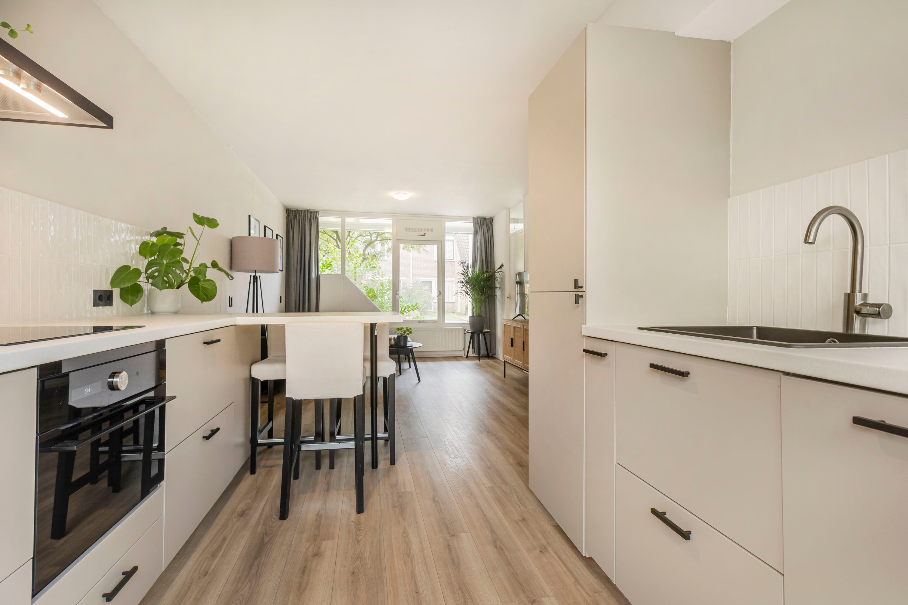 Bij binnenkomst in de hal is er toegang tot de meterkast en de woonkamer. De woonkamer is gelegen aan de voorzijde en biedt ruimte voor gezellige zithoek met vrij uitzicht op de voortuin. De open keuken, vernieuwd in 2025, is voorzien van een dubbele keukenopstelling met eettafel bar. Een fijne plek om de dag rustig te beginnen of om met familie en/of vrienden te genieten van een hapje, drankje en spelletje! Qua uitvoering is er gekozen voor lichte keukenkastjes met praktische opberglades, een half betegelde achterwand en de benodigde inbouwapparatuur zoals een koel-/vriescombinatie, vaatwasser, combi-oven en een inductiekookplaat met afzuigkap. Vanuit de keuken is middels een loopdeur de tuin te bereiken. De slaapkamer is vanuit de keuken-/ woonkamer toegankelijk, circa 10m² groot, uitzicht op de tuin en aangrenzend de badkamer. De badkamer is voorzien van douche, wastafel en witgoedaansluiting. In het gehele appartement tref je een moderne laminaatvloer die doorloopt in alle ruimtes.