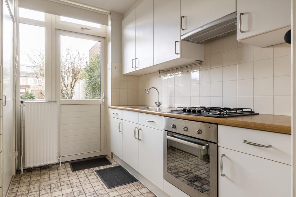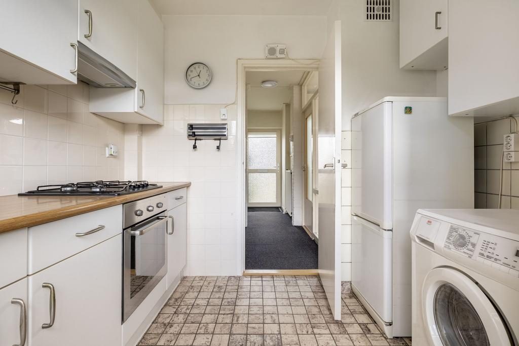 De woonkamer is aan de voorzijde gesitueerd en aan de achterzijde is de eethoek en gesloten keuken gelegen. Vaak zie je dat de muur tussen woonkamer en keuken opengebroken wordt waardoor je een grote woonkeuken kan realiseren. Zowel vanuit de eethoek als vanuit de keuken heb je toegang tot de achtertuin. De keuken is opgesteld in een lichte kleurstelling en beschikt over een 4-pits kookplaat, oven, koelkast en witgoedaansluiting. Op de zolder tref je eveneens de mogelijkheid om de wasmachine aan te sluiten.