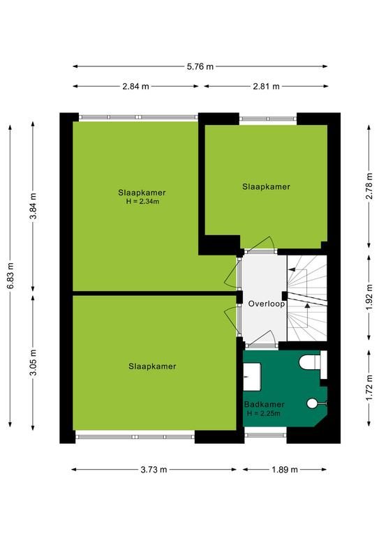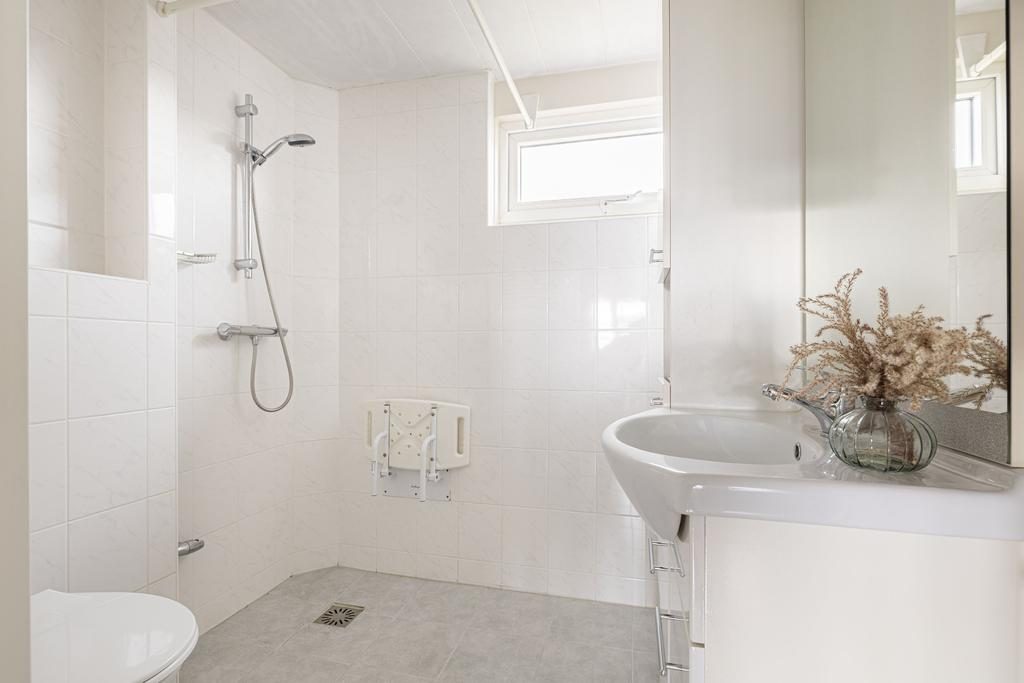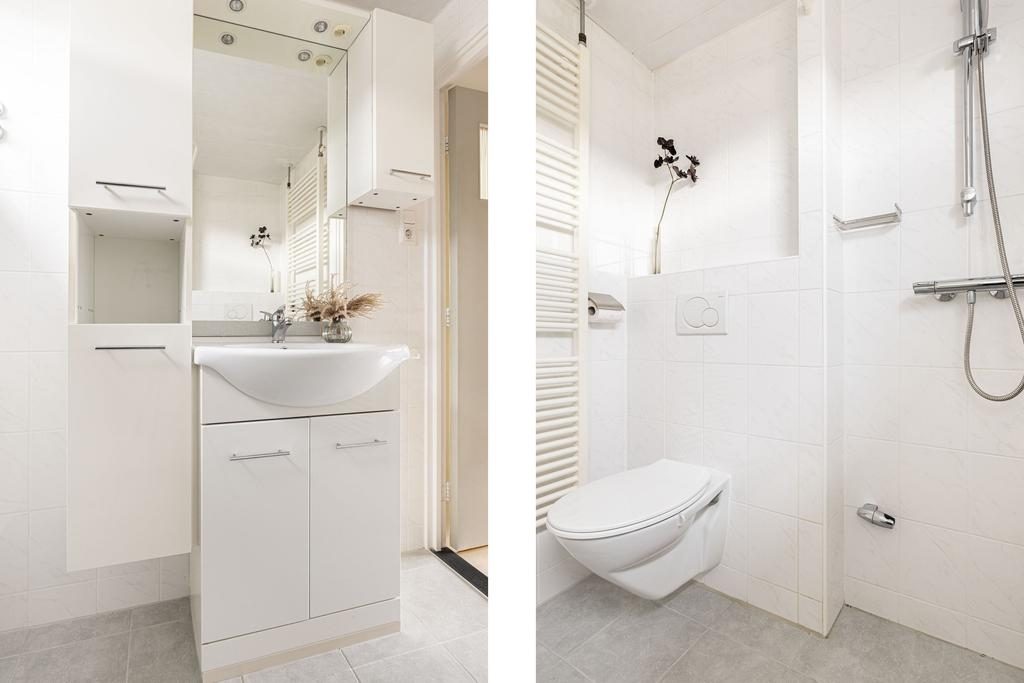 Op de eerste verdieping tref je drie slaapkamers. De slaapkamers aan de achterzijde zijn 11m² en 8m² groot. Aan de voorzijde tref je de derde slaapkamer aan van circa 11m². Alle slaapkamers zijn voorzien van wanden in neutrale kleurstelling. De volledig betegelde badkamer in lichte kleurstelling is voorzien van een douche, wastafel in meubel en toilet. Het raam in de badkamer zorgt voor een beetje daglicht en geeft de mogelijkheid om de badkamer op een natuurlijke manier te ventileren.