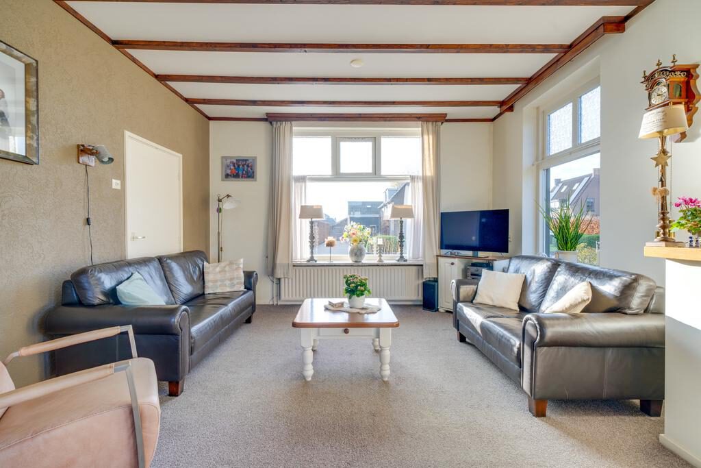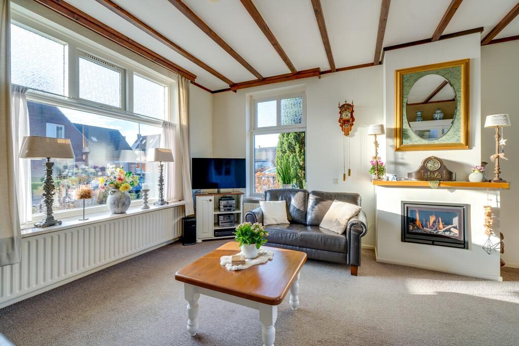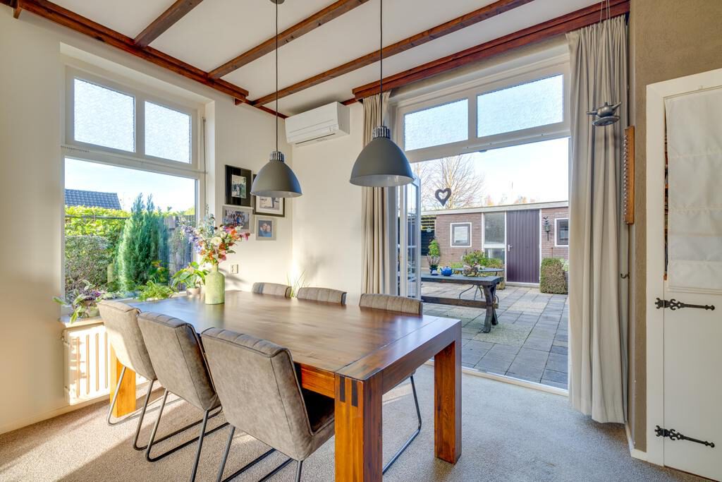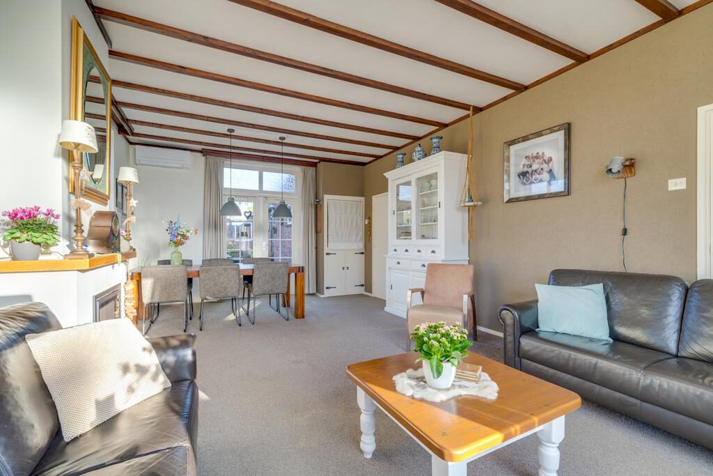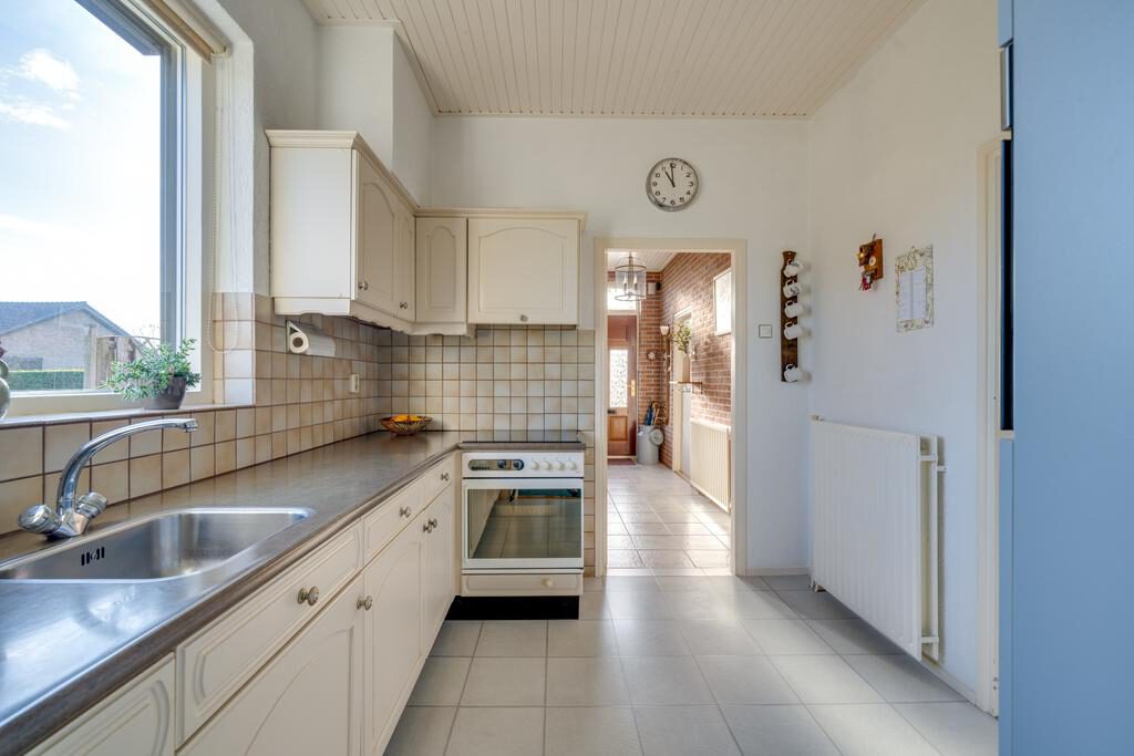 Bij binnenkomst in de hal word je verwelkomd met directe toegang tot de keuken, de kelder en een volledig betegelde toiletruimte. De keuken, die vanuit de hal bereikbaar is, leidt je verder naar de ruime woonkamer van ongeveer 31m². Deze woonkamer is bijzonder licht dankzij de vele raampartijen, die zorgen voor een aangenaam daglicht. Er is voldoende ruimte om zowel een gezellige zithoek als een ruime eettafel te plaatsen. De gashaard in de woonkamer voegt extra warmte en gezelligheid toe. Via de openslaande deuren is er een fijne verbinding met het binnen- en buitenleven. De deels zichtbare balken in het plafond geven de woning extra sfeer en karakter. De keuken is eenvoudig maar degelijk en goed onderhouden. En beschikt daarnaast over de nodige inbouwapparatuur. Hoewel het wat gedateerd overkomt, biedt het alle noodzakelijke functionaliteiten. Een zijraam zorgt voor uitzicht op de oprit, wat extra licht en een blik naar buiten biedt. De kelder van ongeveer 8m² dient als een handige opslagruimte voor extra voorraad.