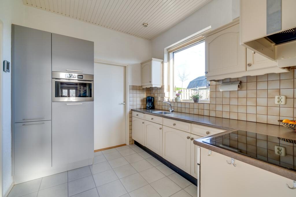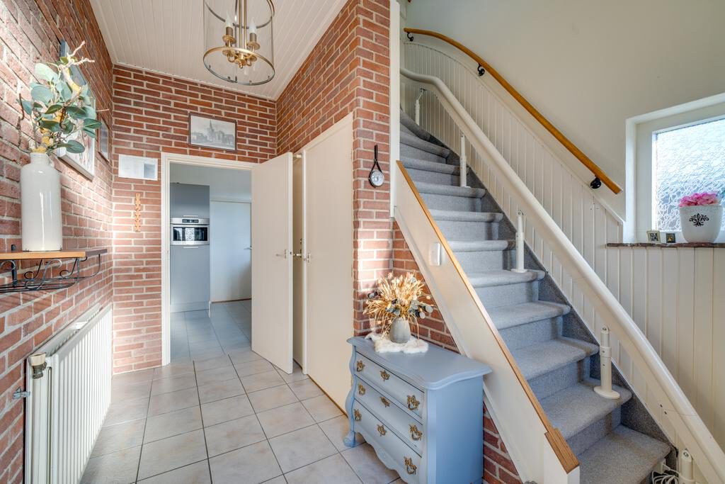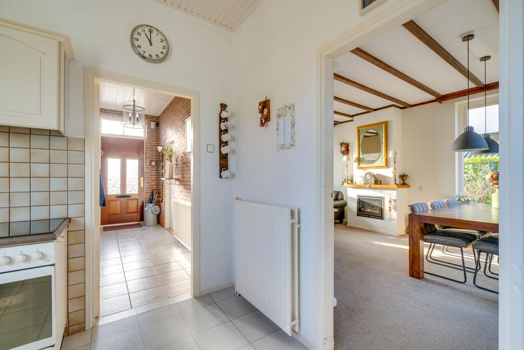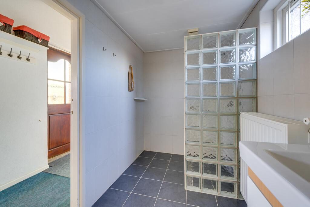 Vanuit de keuken heb je directe toegang tot zowel de ruime woonkamer als de tussenhal. Vanuit de tussenhal kun je de badkamer, de aangebouwde schuur en de oprit bereiken. De badkamer is volledig betegeld en uitgerust met een inloopdouche en een dubbel wastafelmeubel. Een raam in de badkamer zorgt voor natuurlijk daglicht en biedt de mogelijkheid voor natuurlijke ventilatie, naast de aanwezige mechanische ventilatie.