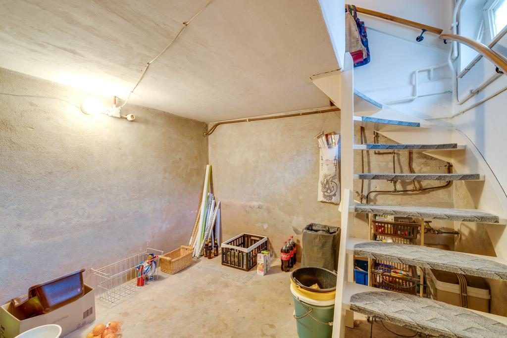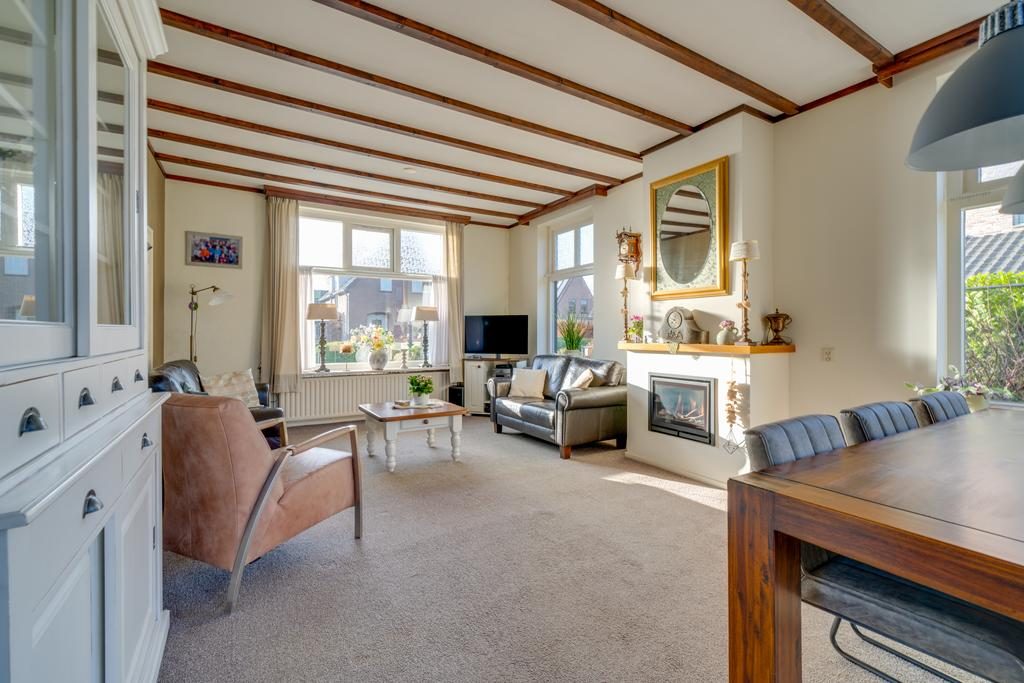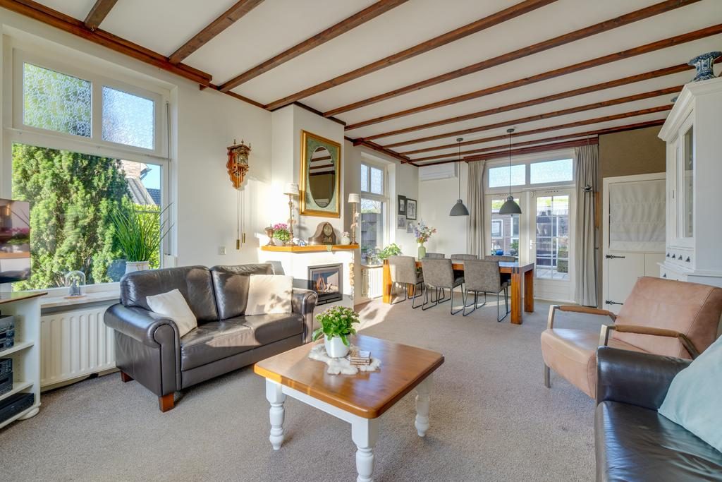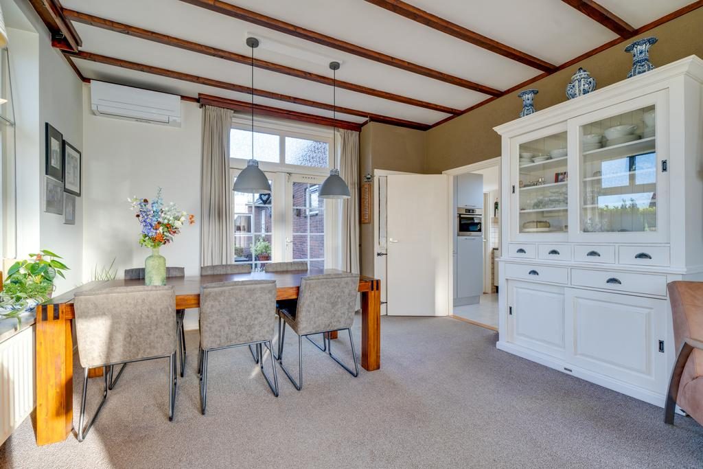 Bij binnenkomst in de hal word je verwelkomd met directe toegang tot de keuken, de kelder en een volledig betegelde toiletruimte. De keuken, die vanuit de hal bereikbaar is, leidt je verder naar de ruime woonkamer van ongeveer 31m². Deze woonkamer is bijzonder licht dankzij de vele raampartijen, die zorgen voor een aangenaam daglicht. Er is voldoende ruimte om zowel een gezellige zithoek als een ruime eettafel te plaatsen. De gashaard in de woonkamer voegt extra warmte en gezelligheid toe. Via de openslaande deuren is er een fijne verbinding met het binnen- en buitenleven. De deels zichtbare balken in het plafond geven de woning extra sfeer en karakter. De keuken is eenvoudig maar degelijk en goed onderhouden. En beschikt daarnaast over de nodige inbouwapparatuur. Hoewel het wat gedateerd overkomt, biedt het alle noodzakelijke functionaliteiten. Een zijraam zorgt voor uitzicht op de oprit, wat extra licht en een blik naar buiten biedt. De kelder van ongeveer 8m² dient als een handige opslagruimte voor extra voorraad.