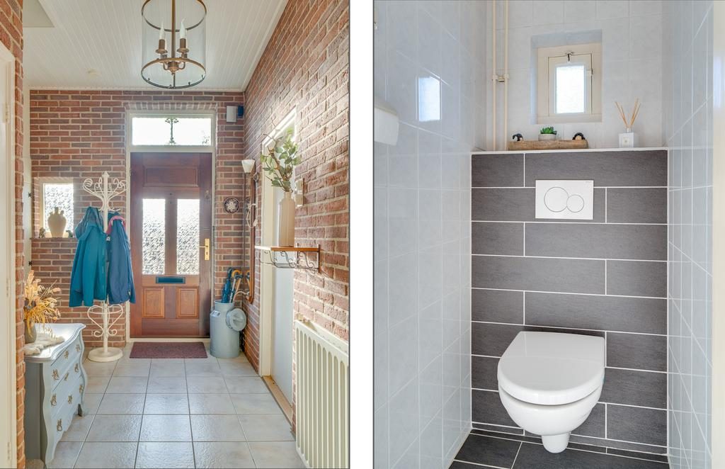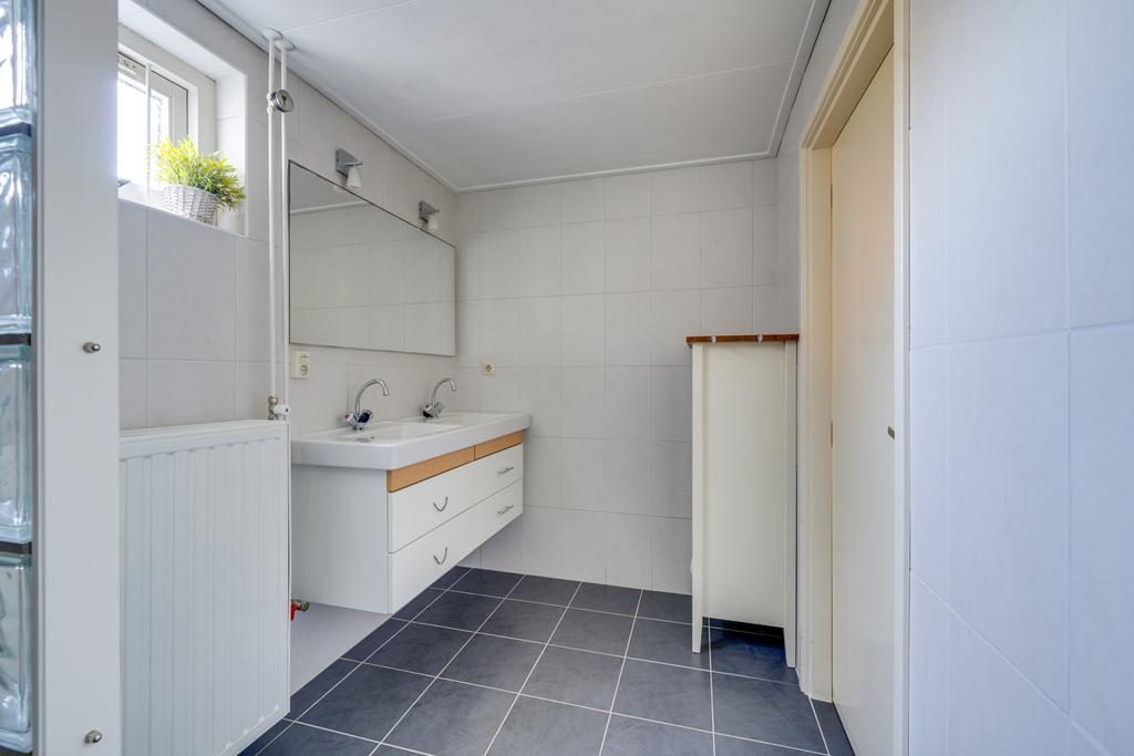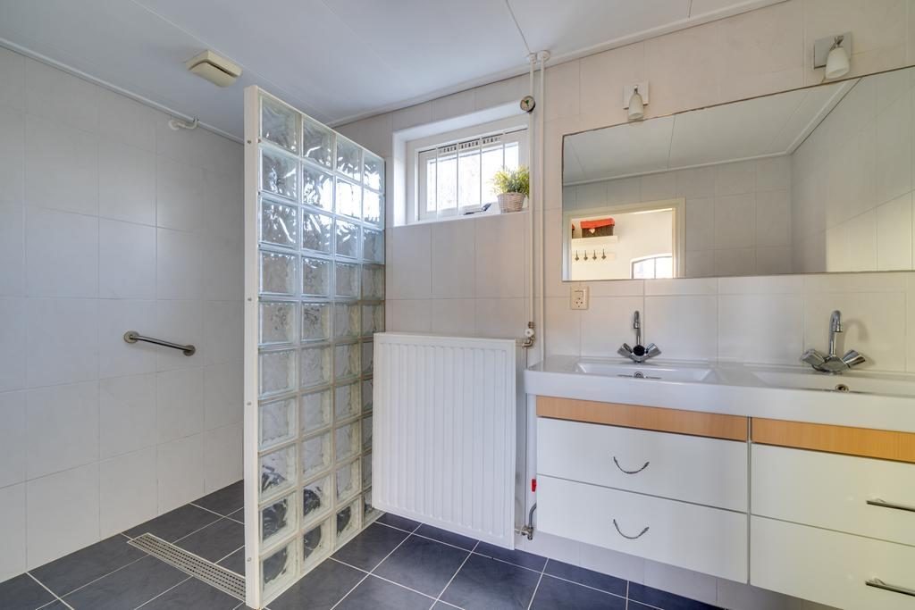Vanuit de keuken heb je directe toegang tot zowel de ruime woonkamer als de tussenhal. Vanuit de tussenhal kun je de badkamer, de aangebouwde schuur en de oprit bereiken. De badkamer is volledig betegeld en uitgerust met een inloopdouche en een dubbel wastafelmeubel. Een raam in de badkamer zorgt voor natuurlijk daglicht en biedt de mogelijkheid voor natuurlijke ventilatie, naast de aanwezige mechanische ventilatie.
