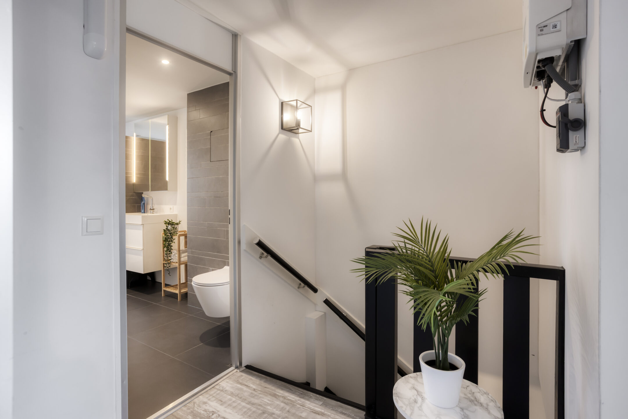 Vanuit de hal is ook een praktische berging bereikbaar, met aansluitingen voor de wasmachine en droger en een deel van de warmtepomp, waaronder het 270L boilervat. De buitenunit van de warmtepomp staat op het dak. Vanuit de hal leidt de trap naar de eerste verdieping.