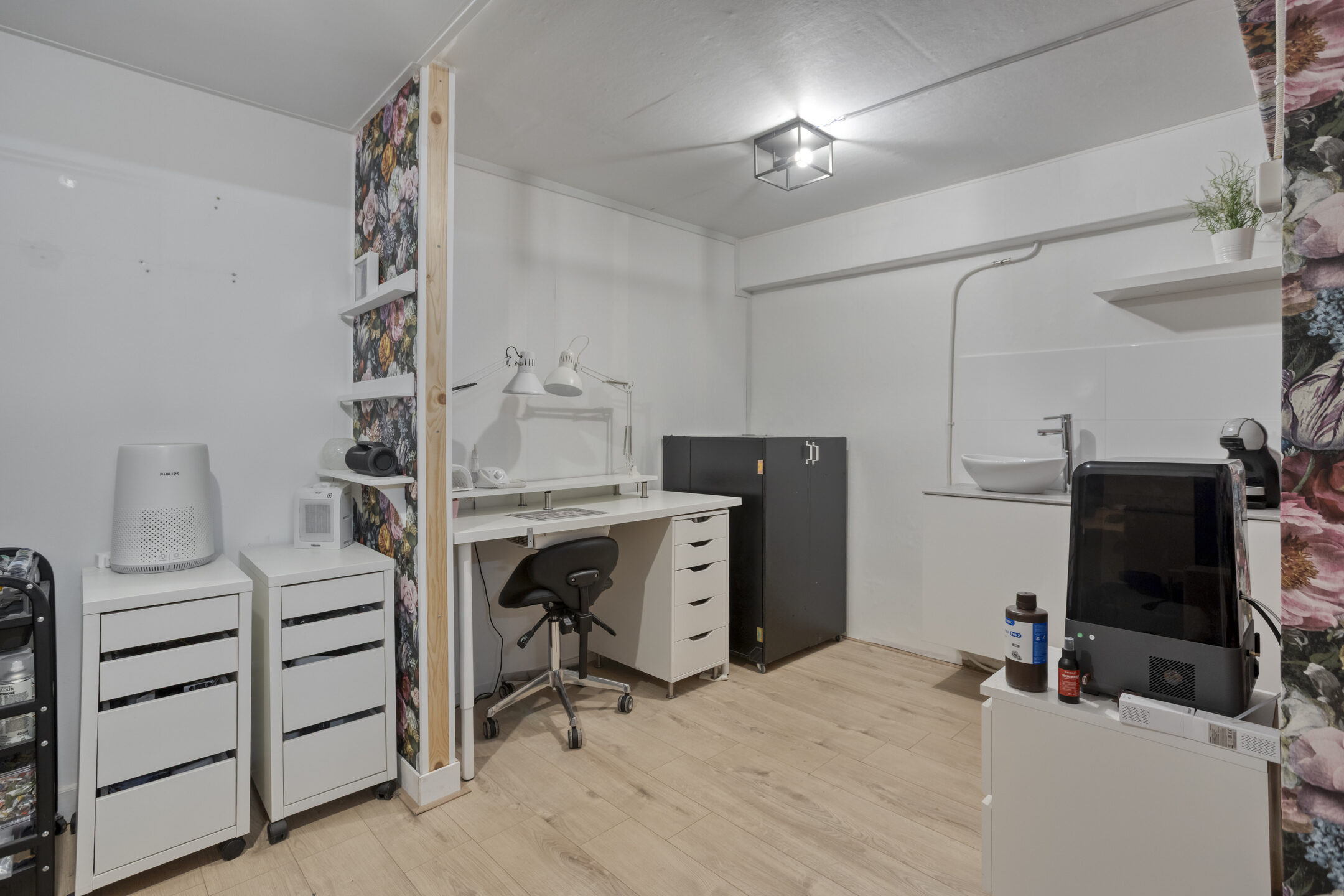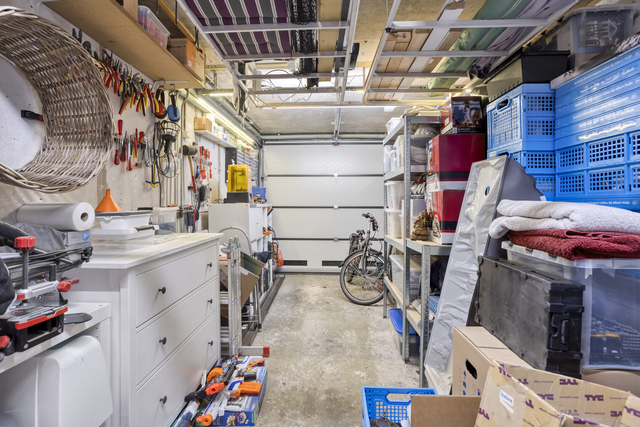 Via de overdekte entree kom je de woning binnen. Naast de voordeur bevindt zich de meterkast, volledig vernieuwd en voorzien van 2 moderne groepenkasten en krachtstroomaansluiting. Links in de hal leidt een deur naar de garage, die is voorzien van een elektrische garagedeur met ventilatieroosters en afstandsbediening. Achterin de garage ligt een verrassend ruime kamer, perfect als werkkamer, hobbyruimte of berging, compleet met een modern aanrecht en waskom.