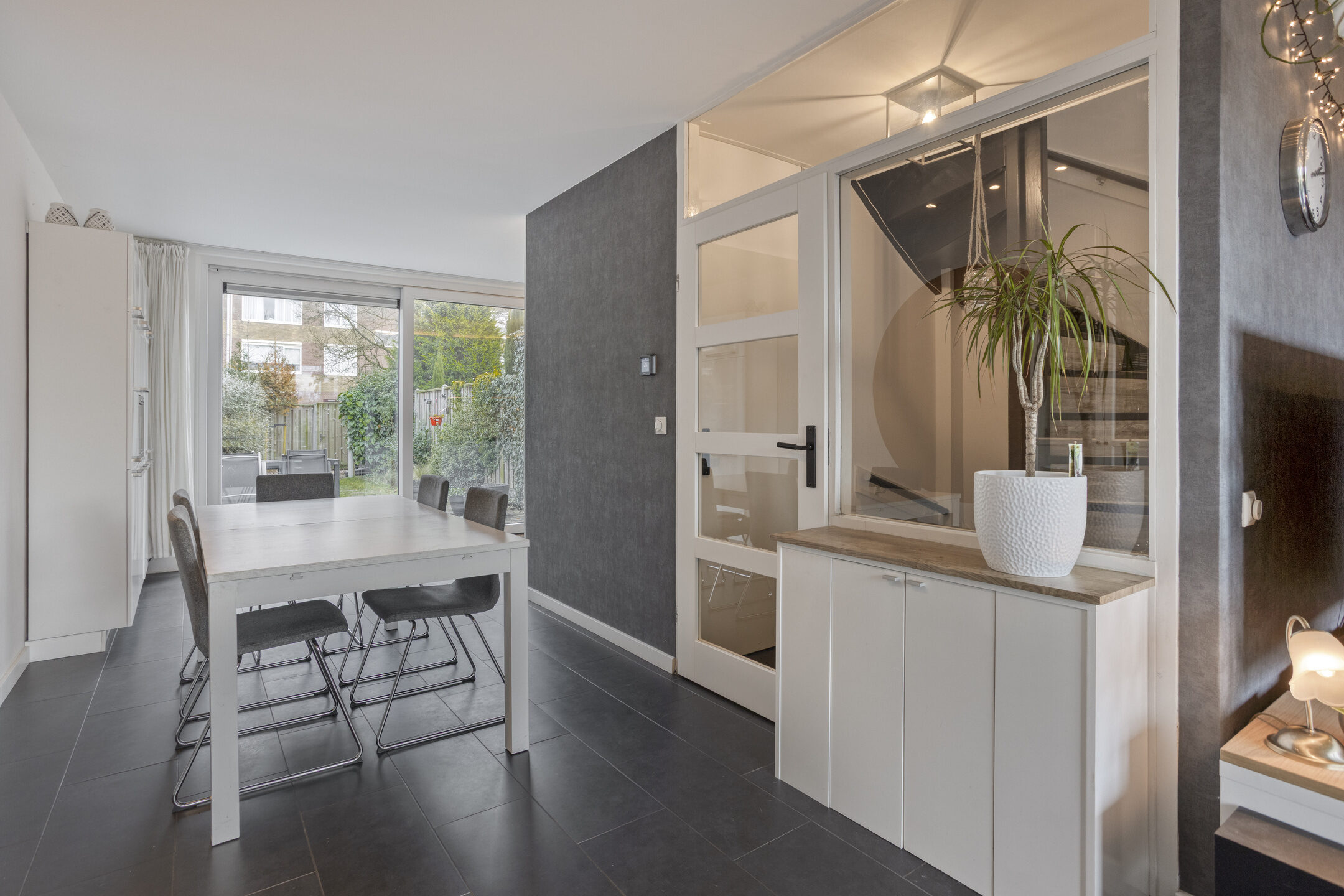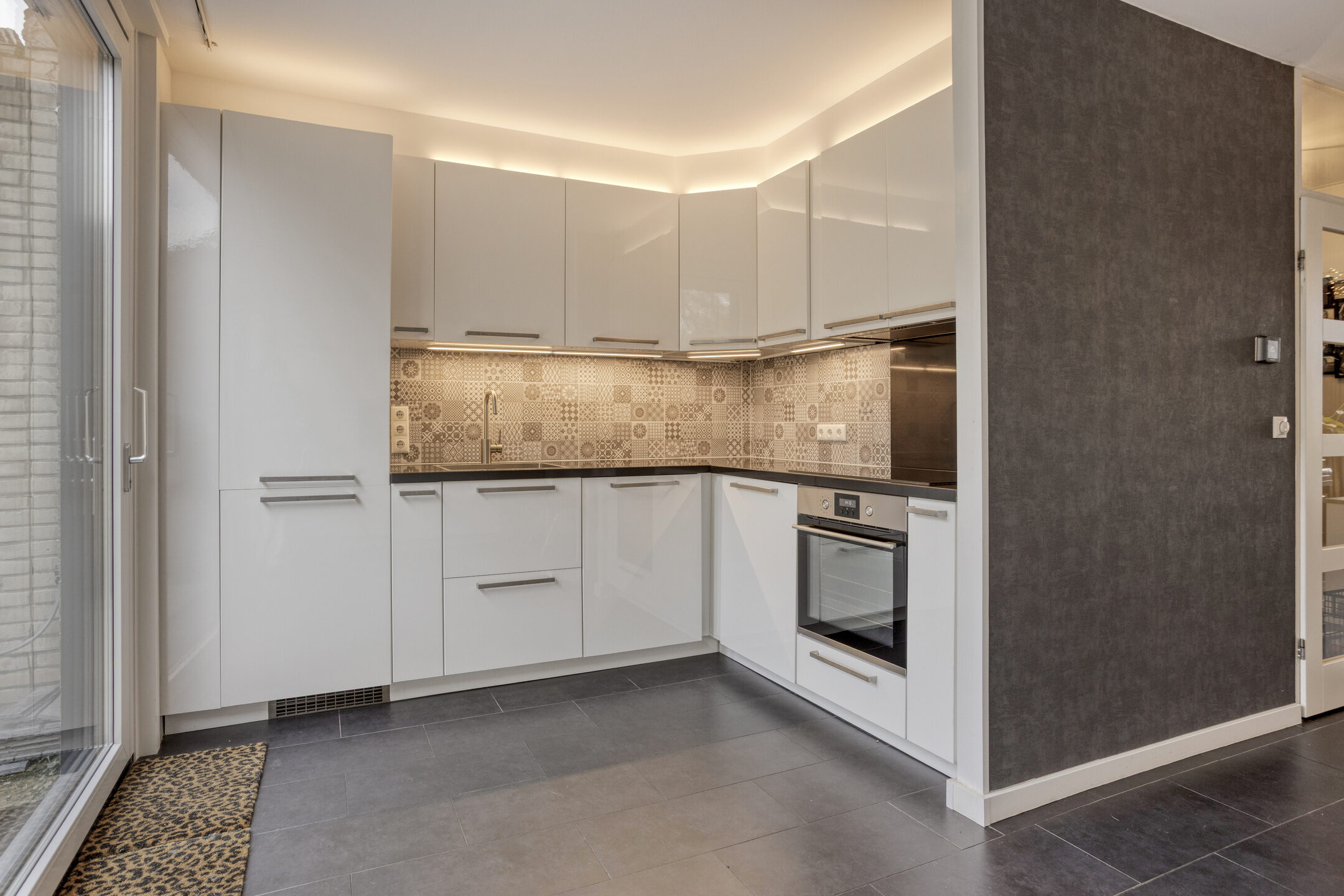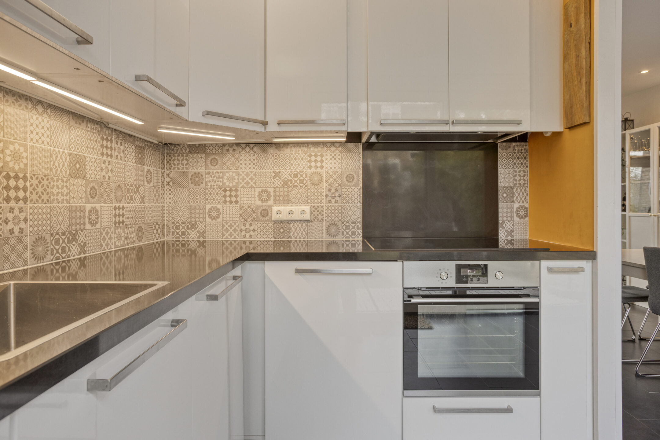 Op de eerste verdieping vind je de lichte en ruime woonetage. Via de hef-schuifpui stap je direct de zonnige achtertuin in. In de zomer vormt deze tuin een prachtige verlenging van de woonruimte en is het dé ideale plek voor een gezellige barbecue met het gezin, vrienden of familie. Aan de achterzijde bevindt zich de moderne open keuken (2017), compleet uitgerust met een inductiekookplaat, afzuigsysteem, vaatwasser (2025), oven, magnetron, inbouwkoel-/ vriescombinatie.