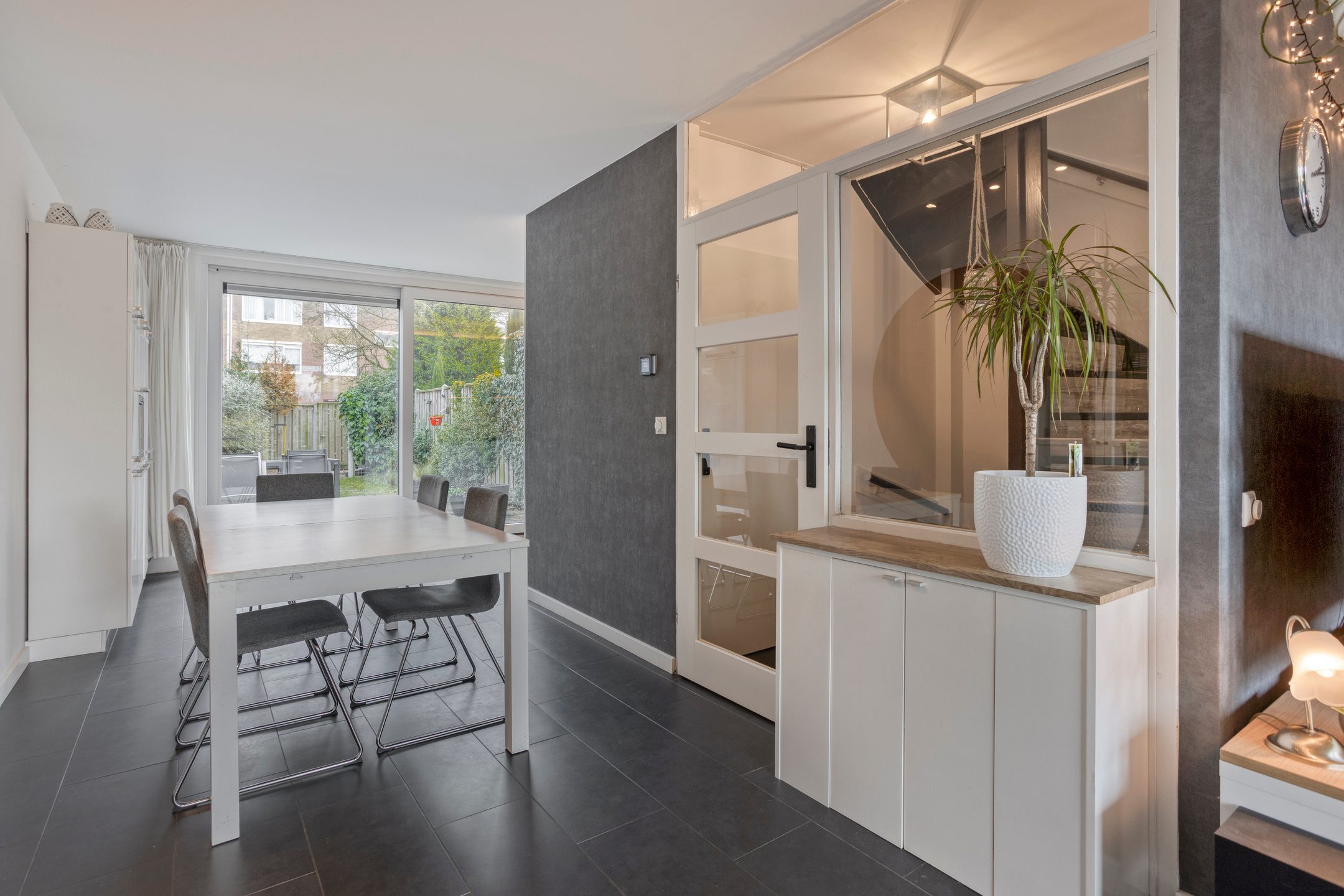 Op de eerste verdieping vind je de lichte en ruime woonetage. Via de hef-schuifpui stap je direct de zonnige achtertuin in. In de zomer vormt deze tuin een prachtige verlenging van de woonruimte en is het dé ideale plek voor een gezellige barbecue met het gezin, vrienden of familie. Aan de achterzijde bevindt zich de moderne open keuken (2017), compleet uitgerust met een inductiekookplaat, afzuigsysteem, vaatwasser (2025), oven, magnetron, inbouwkoel-/ vriescombinatie.