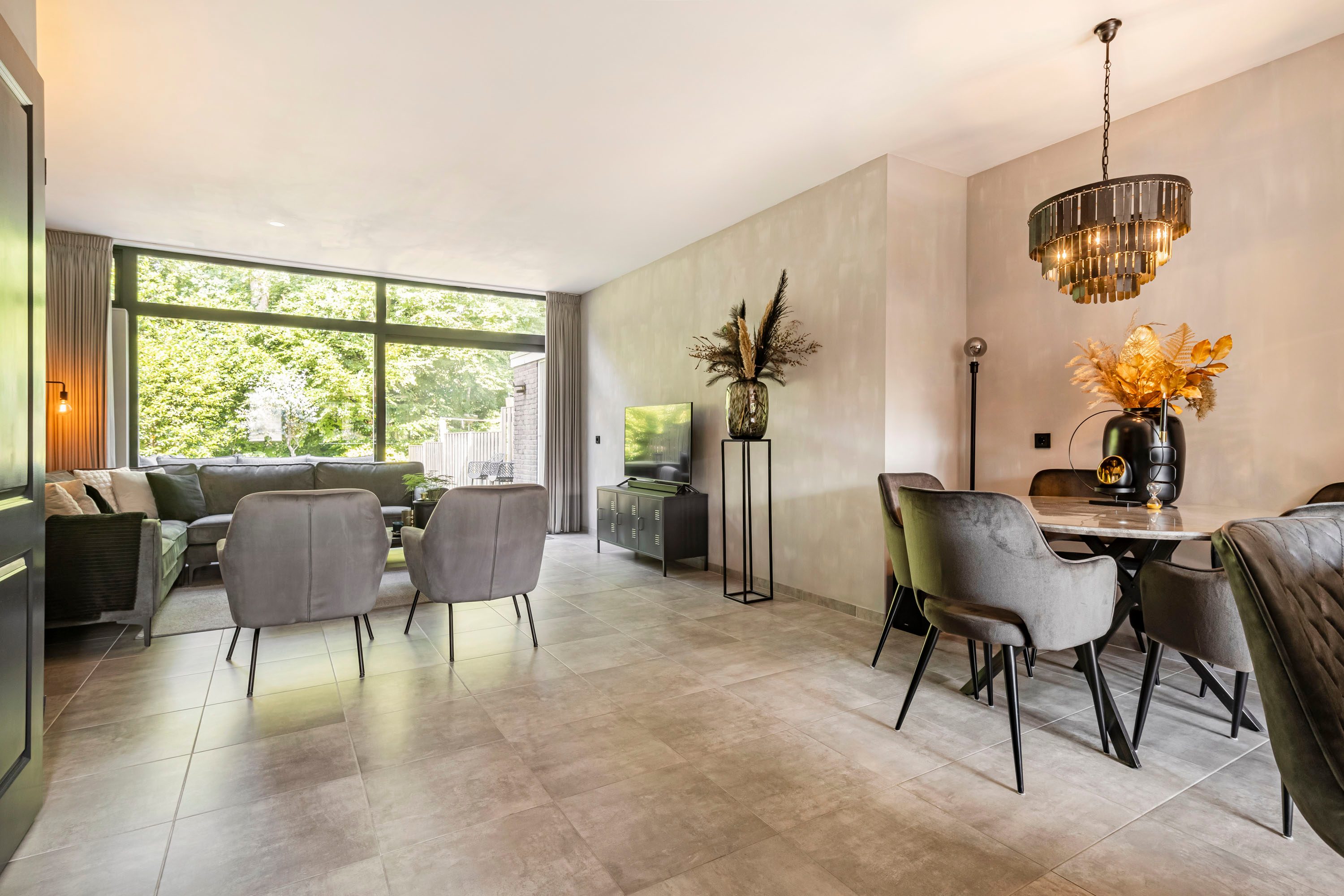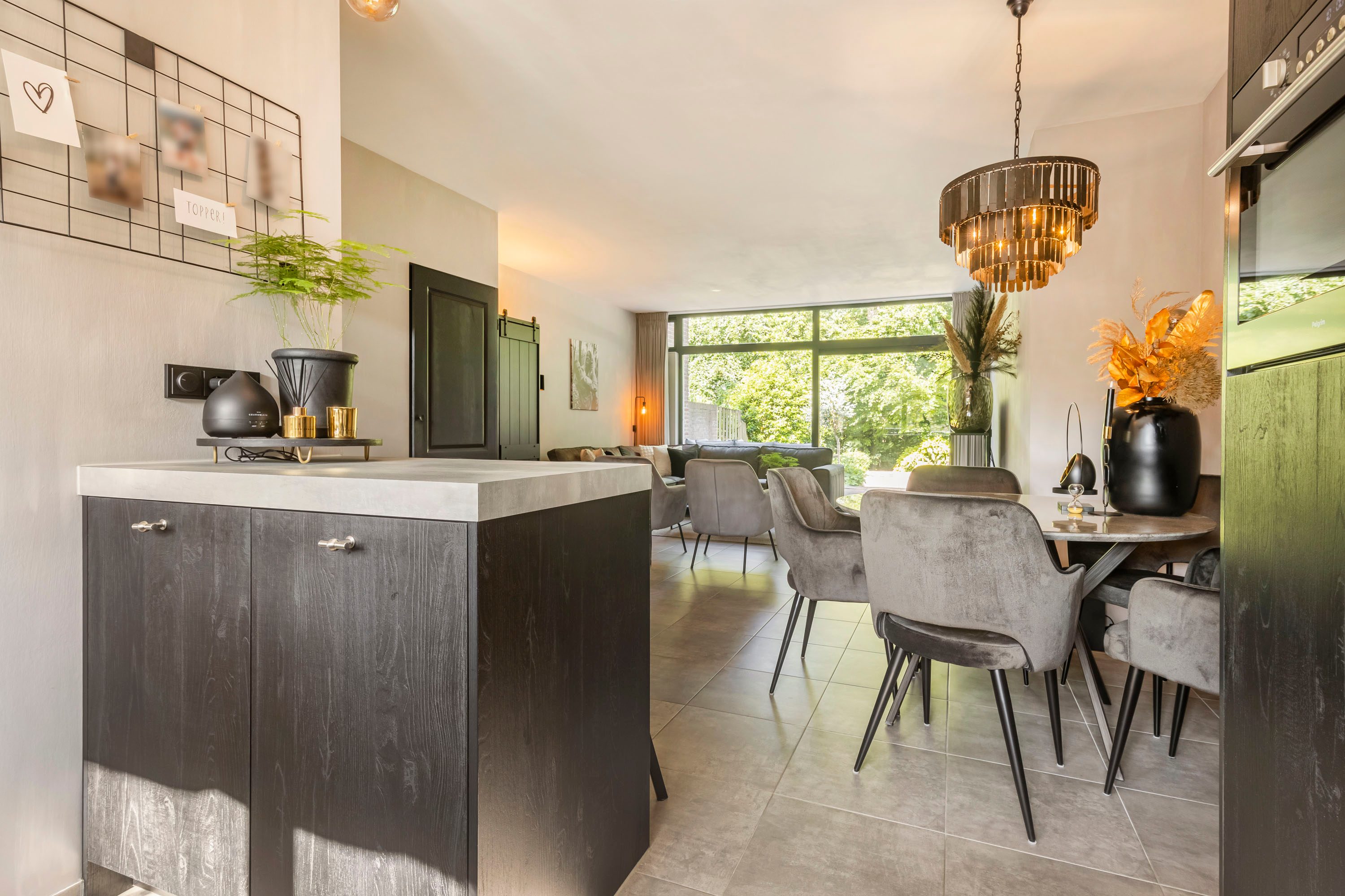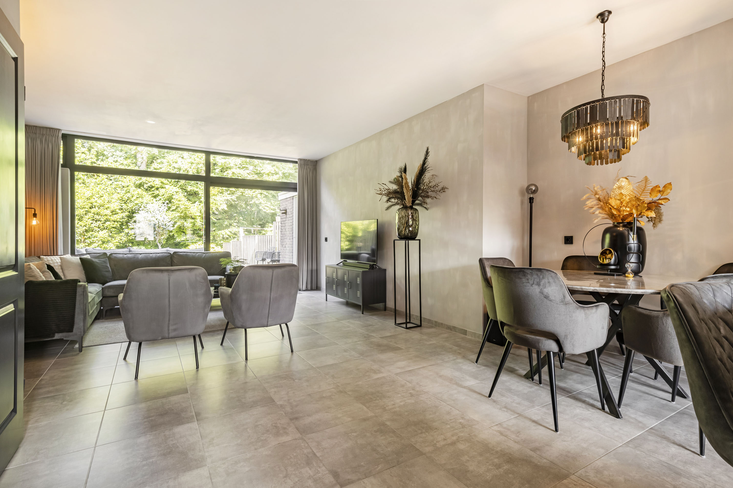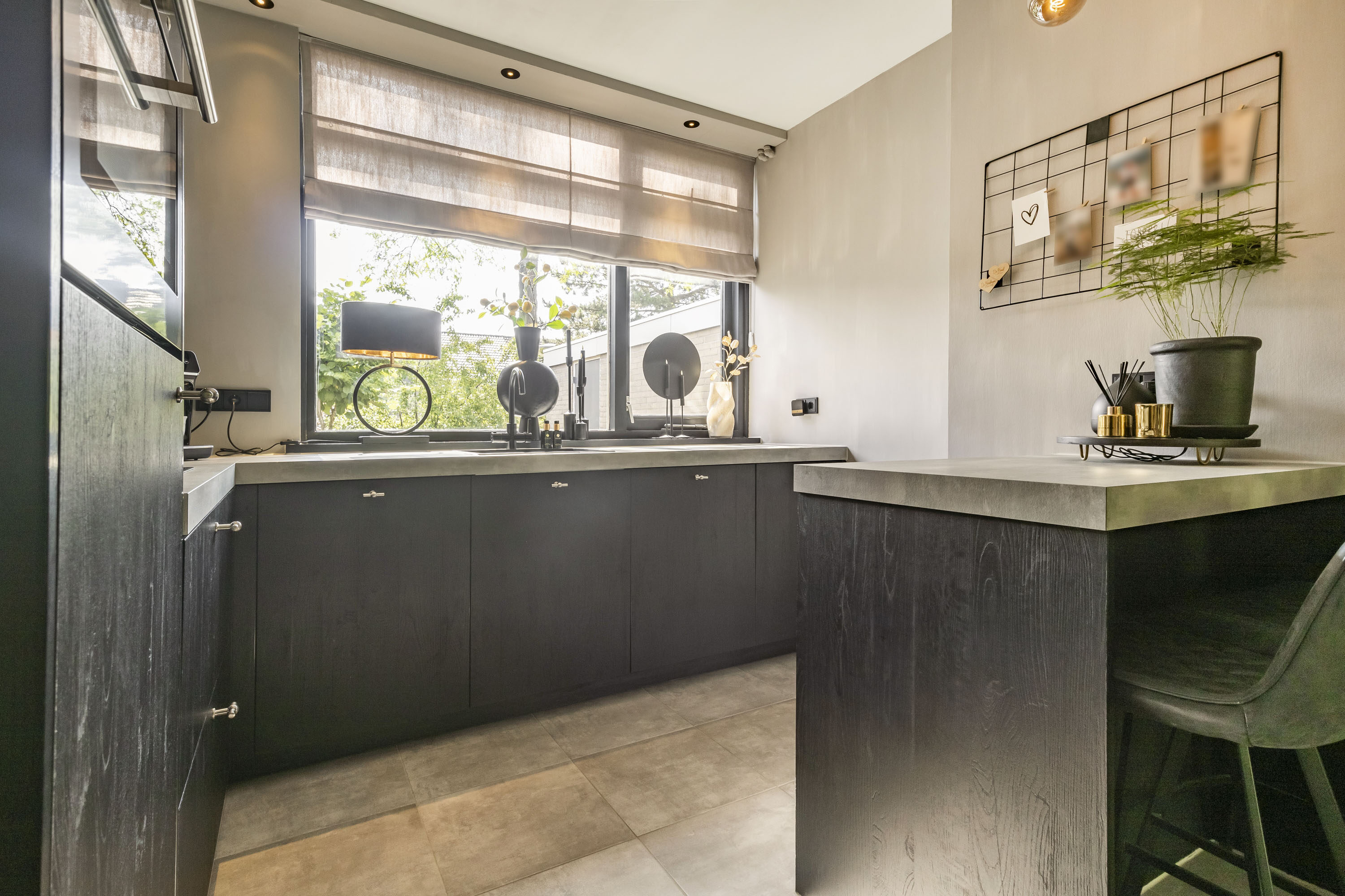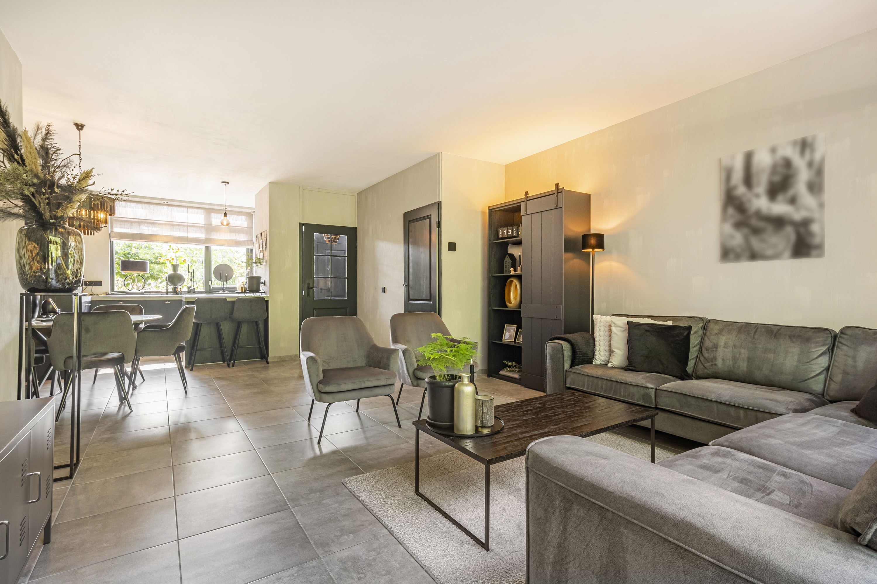 Bij binnenkomst via de ruime entree tref je een modern toilet, de meterkast en een trapopgang naar boven. Vanuit hier loop je de woonkamer binnen, waar de grote raampartijen direct in het oog springen en zorgen voor een overvloed aan natuurlijk licht. De woonkamer is ruim opgezet en heeft een strakke vloer van antracietkleurige tegels, die naadloos doorloopt over de gehele begane grond. Centraal tussen de woonkamer en keuken bevindt zich het eetgedeelte. Hier is meer dan voldoende ruimte voor een grote eettafel met stoelen. Een fijne plek om met familie en/of vrienden te genieten van een hapje, drankje en spelletje!