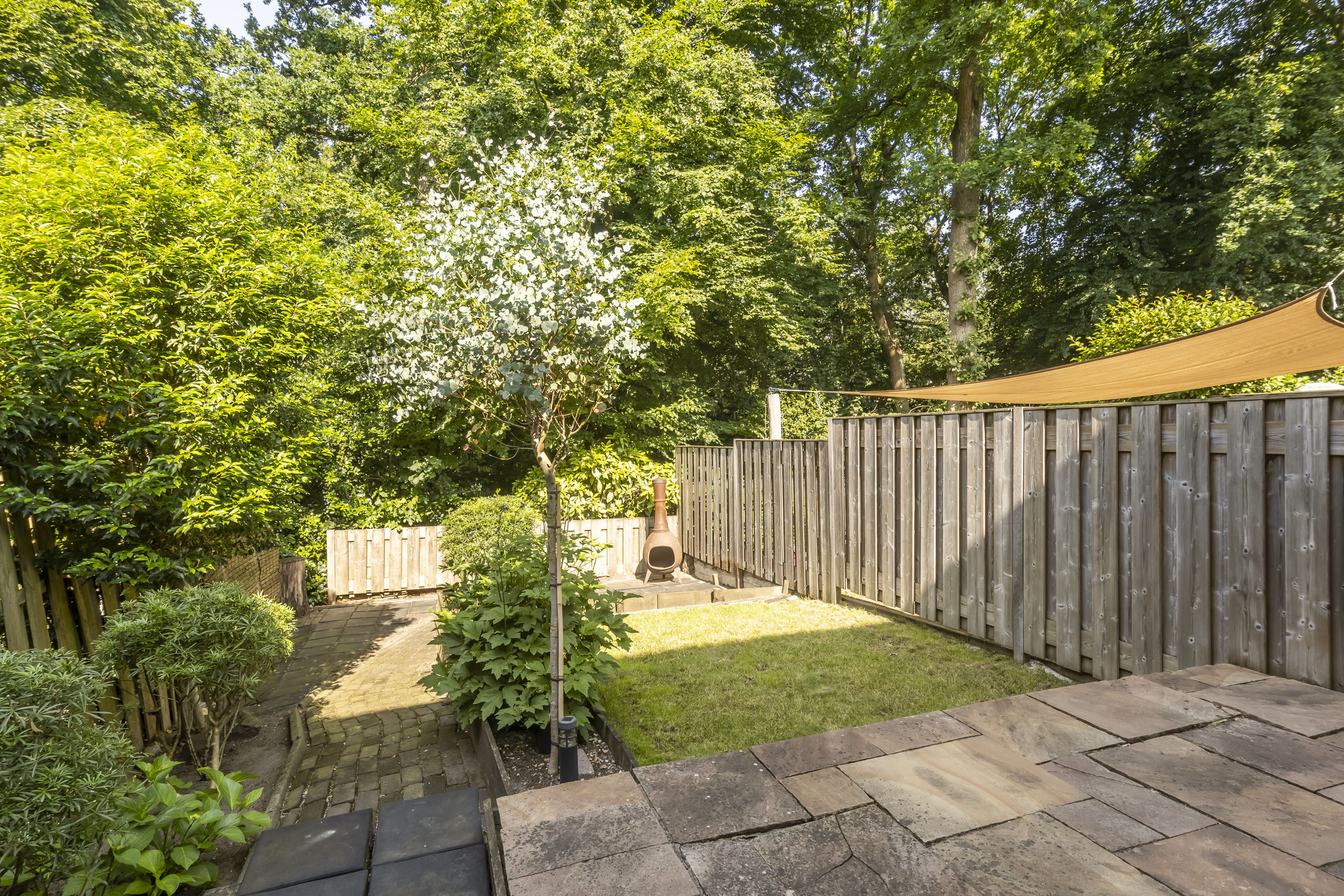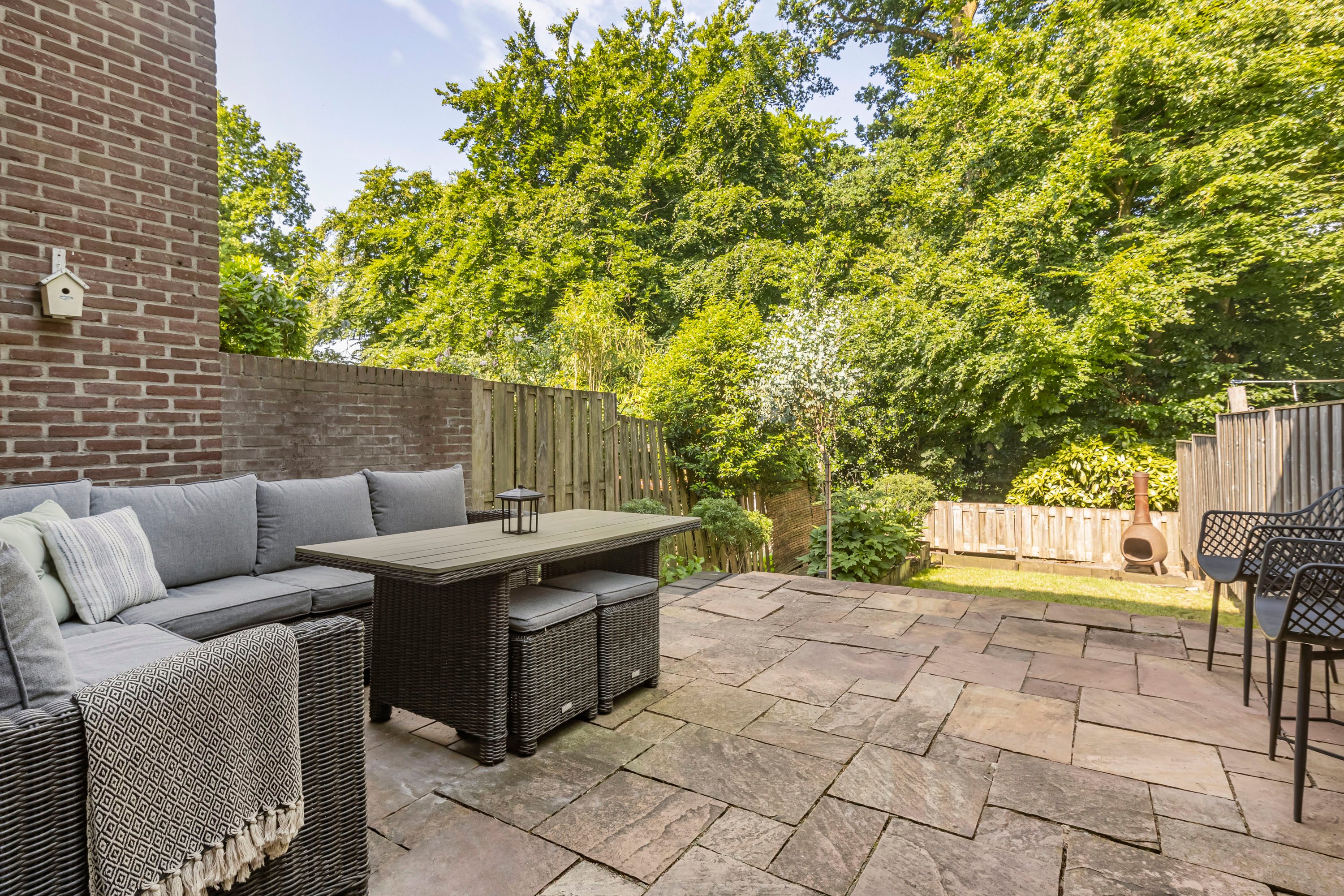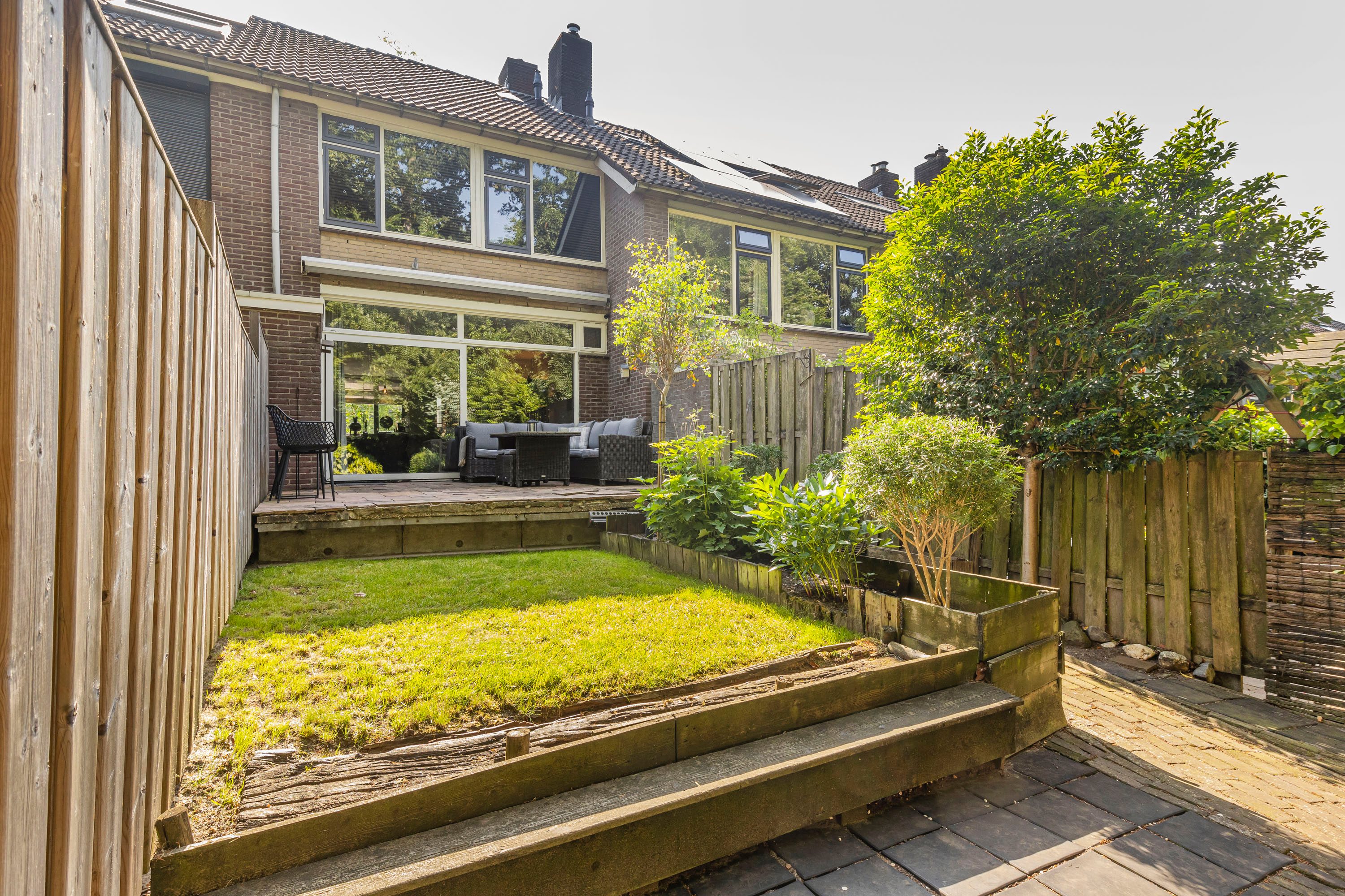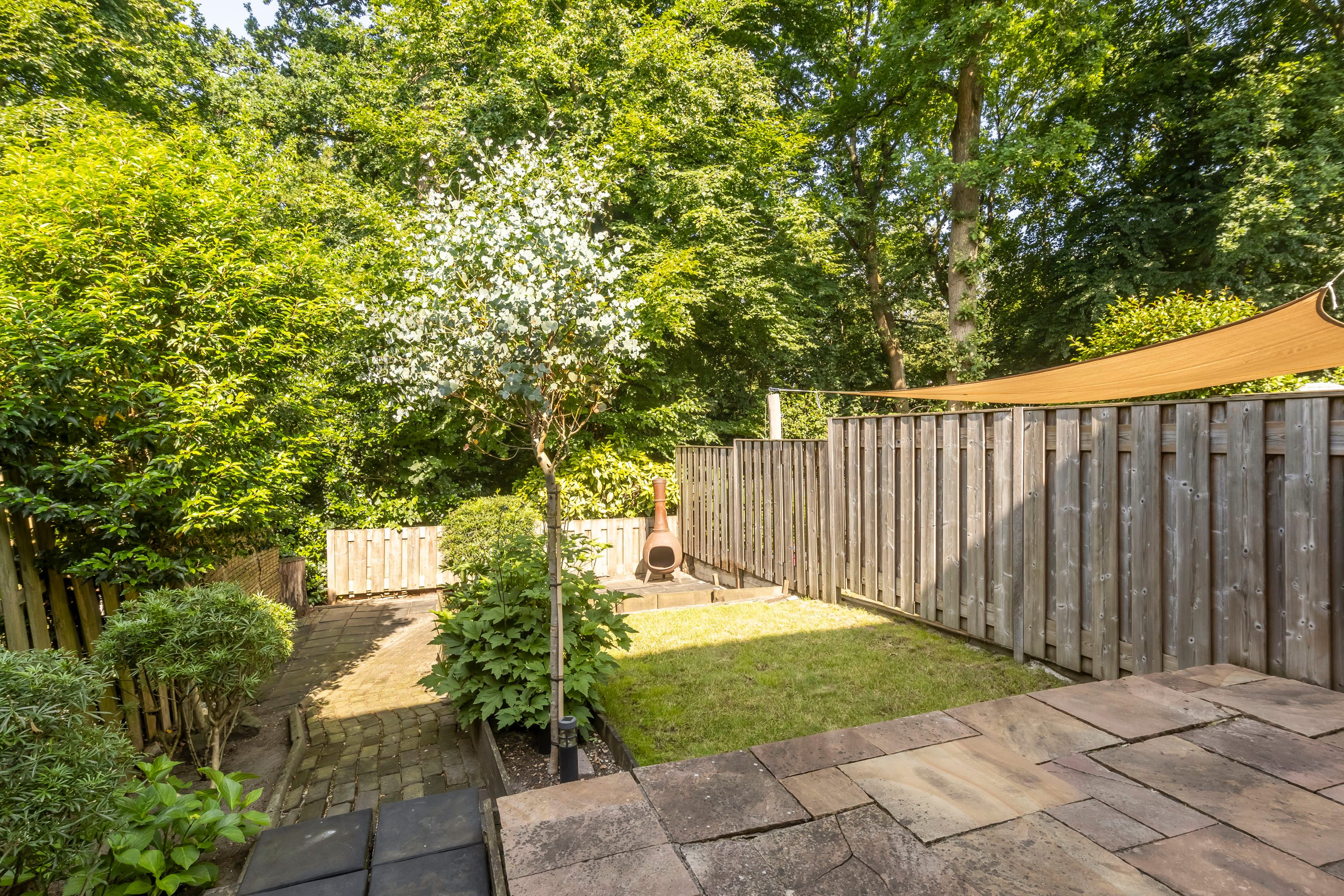 De zonnige, op het westen gelegen tuin biedt volop ruimte voor een stijlvolle zithoek, perfect om te ontspannen of gasten te ontvangen.