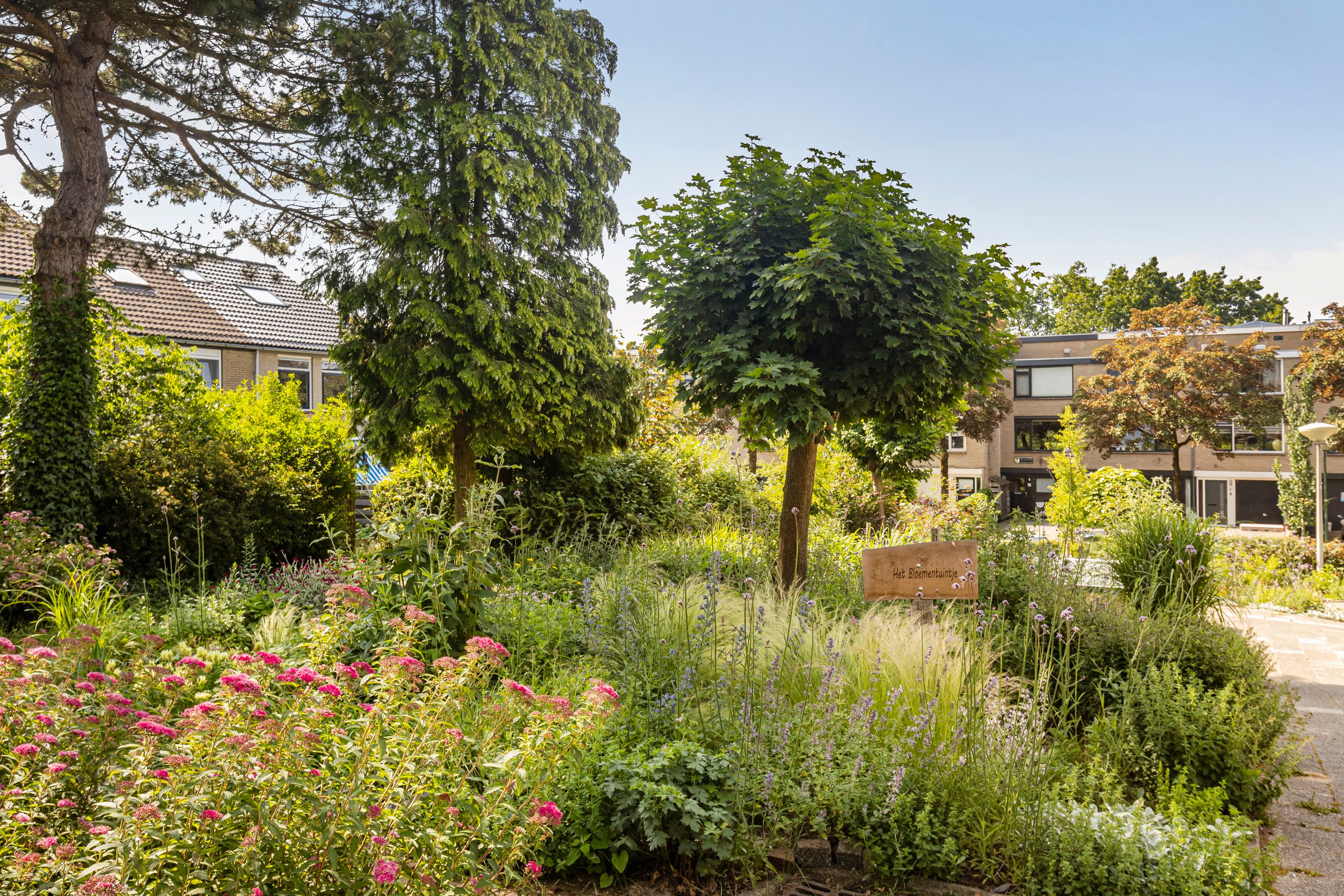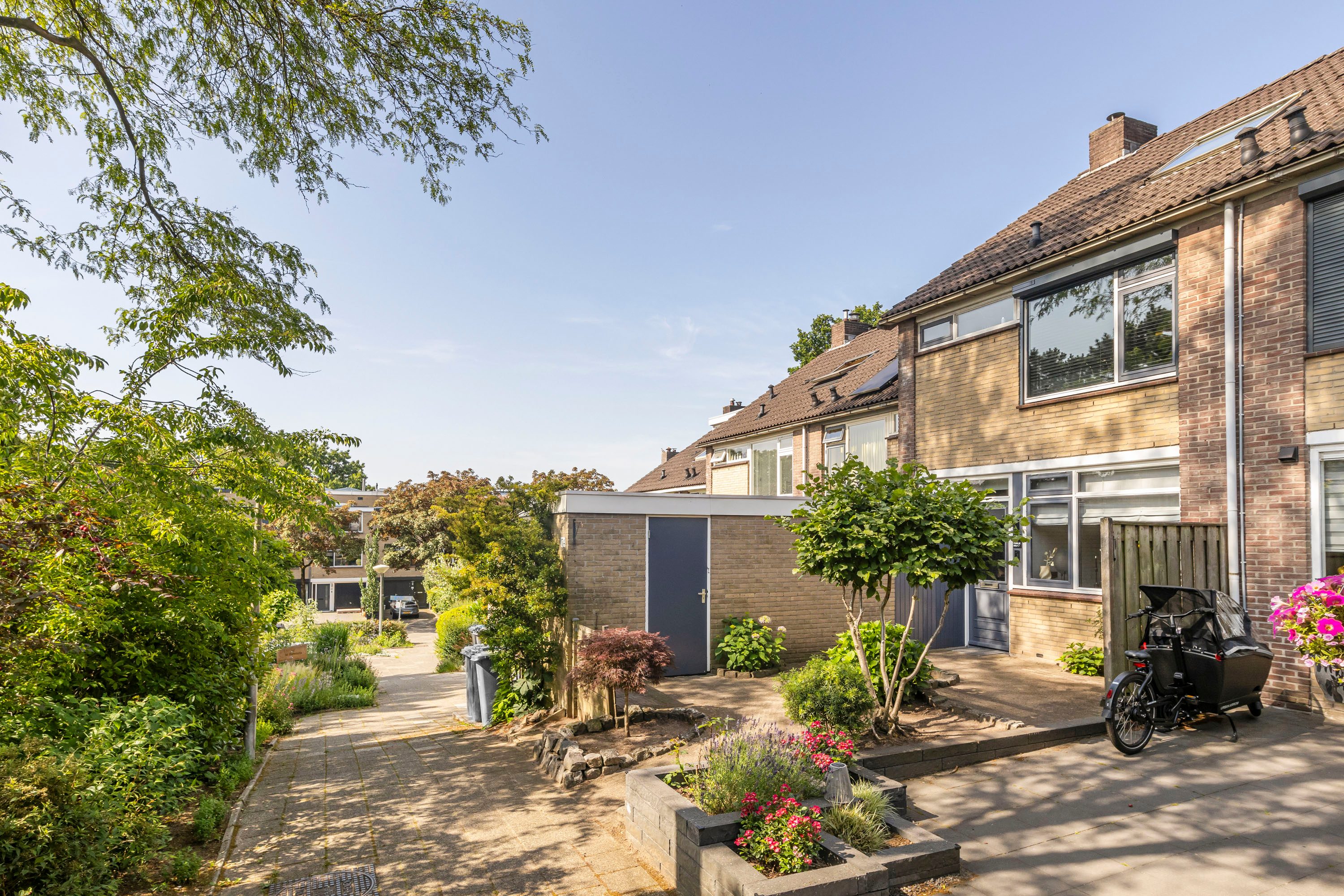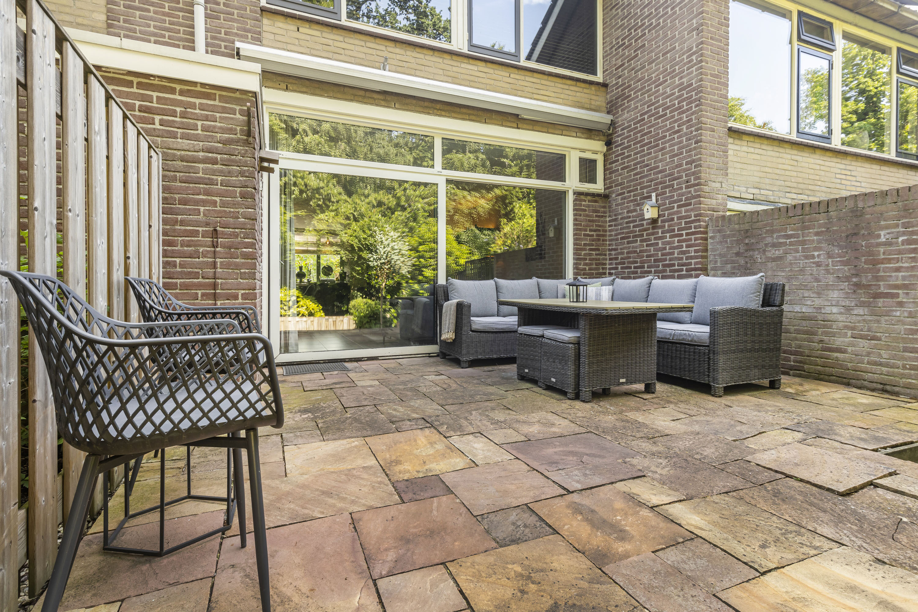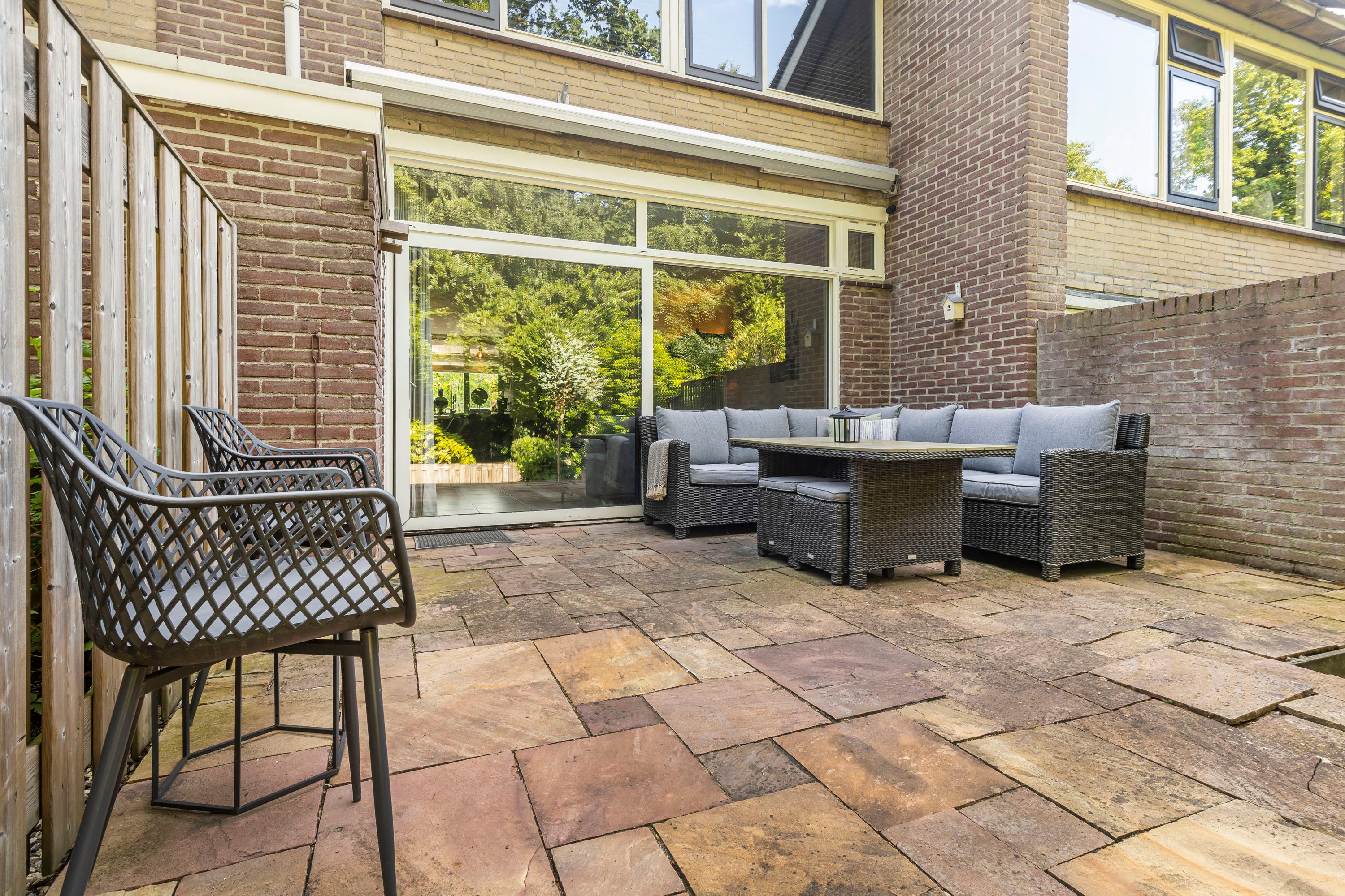 De zonnige, op het westen gelegen tuin biedt volop ruimte voor een stijlvolle zithoek, perfect om te ontspannen of gasten te ontvangen.