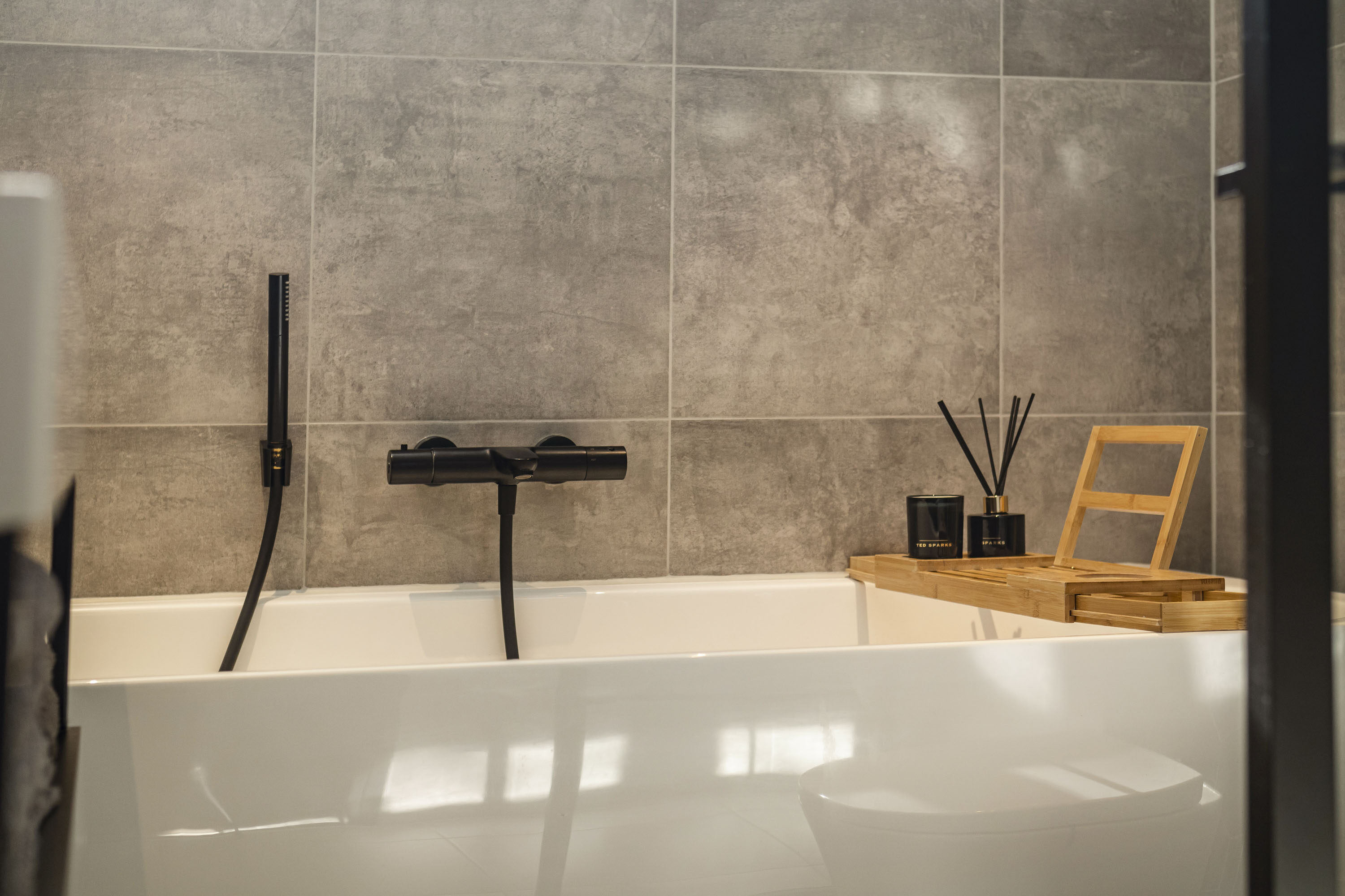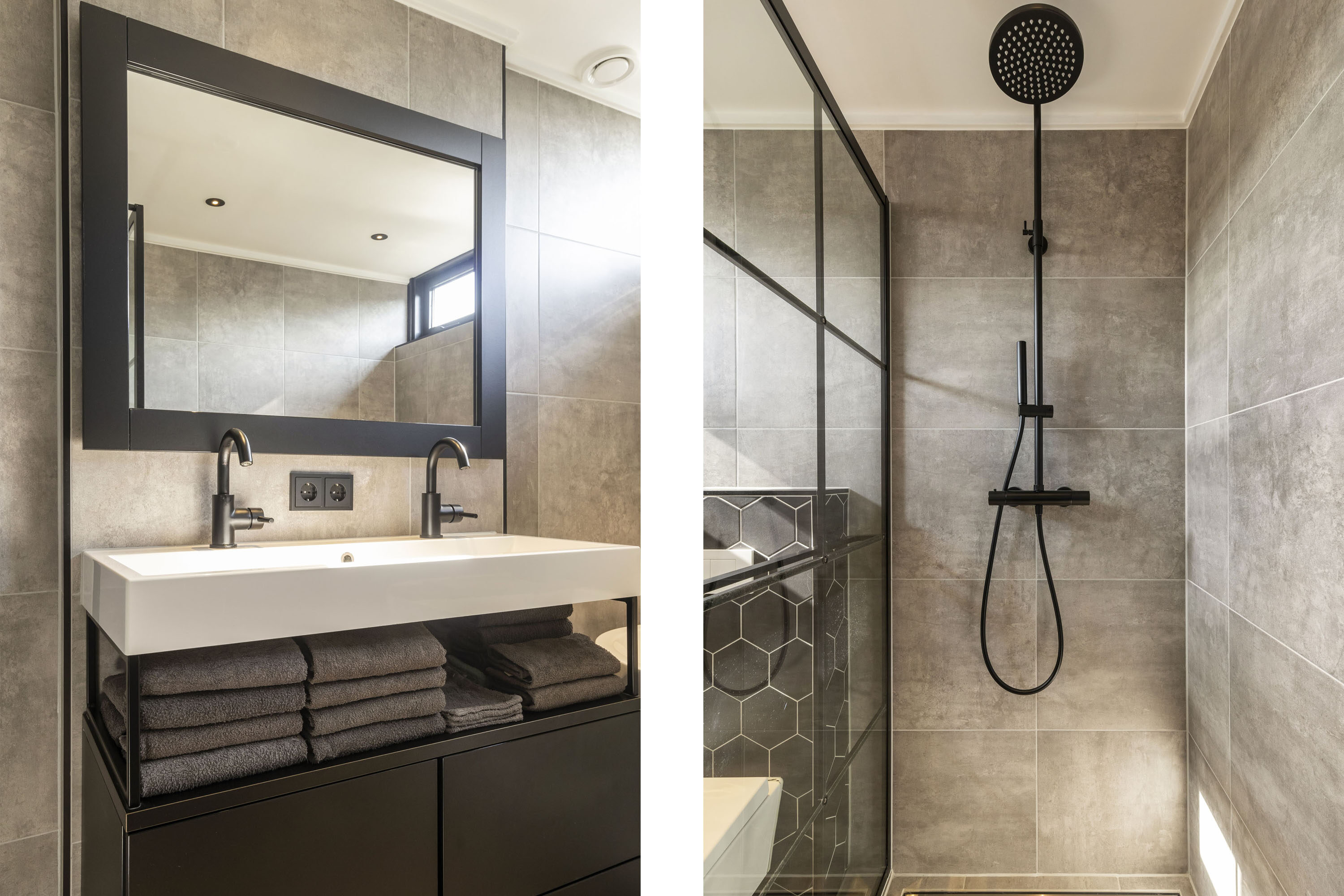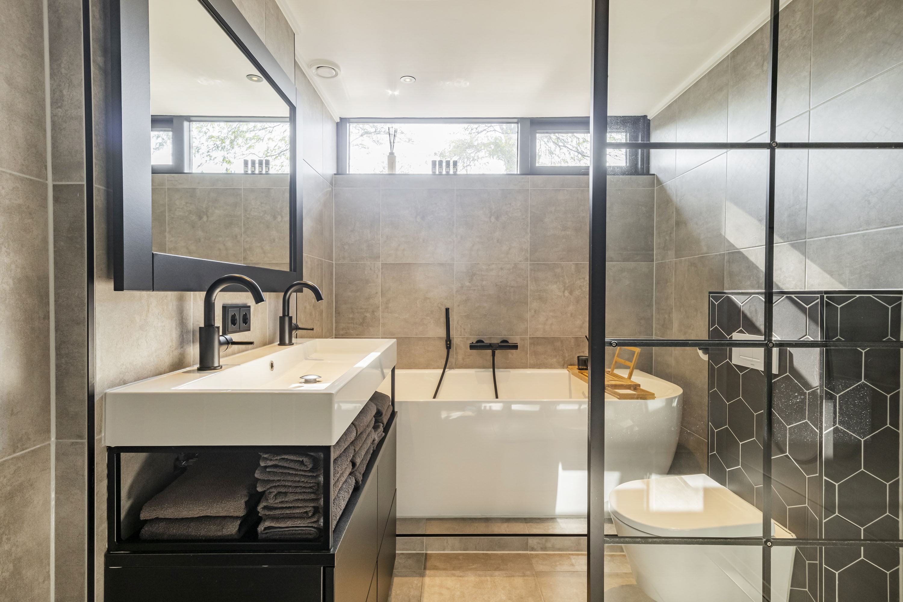 Op de eerste verdieping leidt de ruime overloop naar alle vertrekken. Hier bevinden zich drie slaapkamers met een oppervlakte van respectievelijk 11,6 m², 9,7 m² en 8,8 m². Alle kamers beschikken over grote ramen die veel lichtinval genereren, en één van de slaapkamers is voorzien van een praktische inbouwkast. De badkamer is modern ingericht en uitgerust met een ruim wastafelmeubel, een inloopdouche, een bad, een toilet en vloerverwarming. De antracietgrijze tegels zorgen voor een elegante uitstraling.