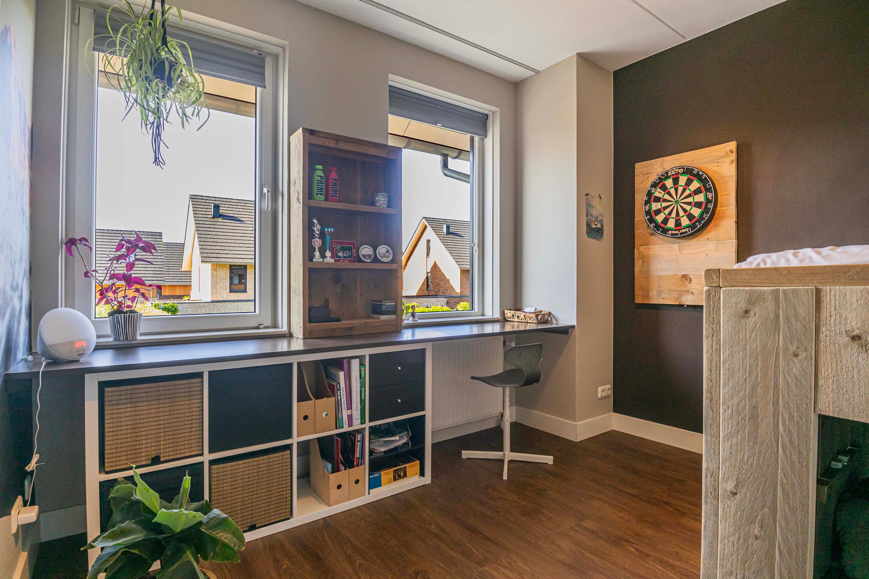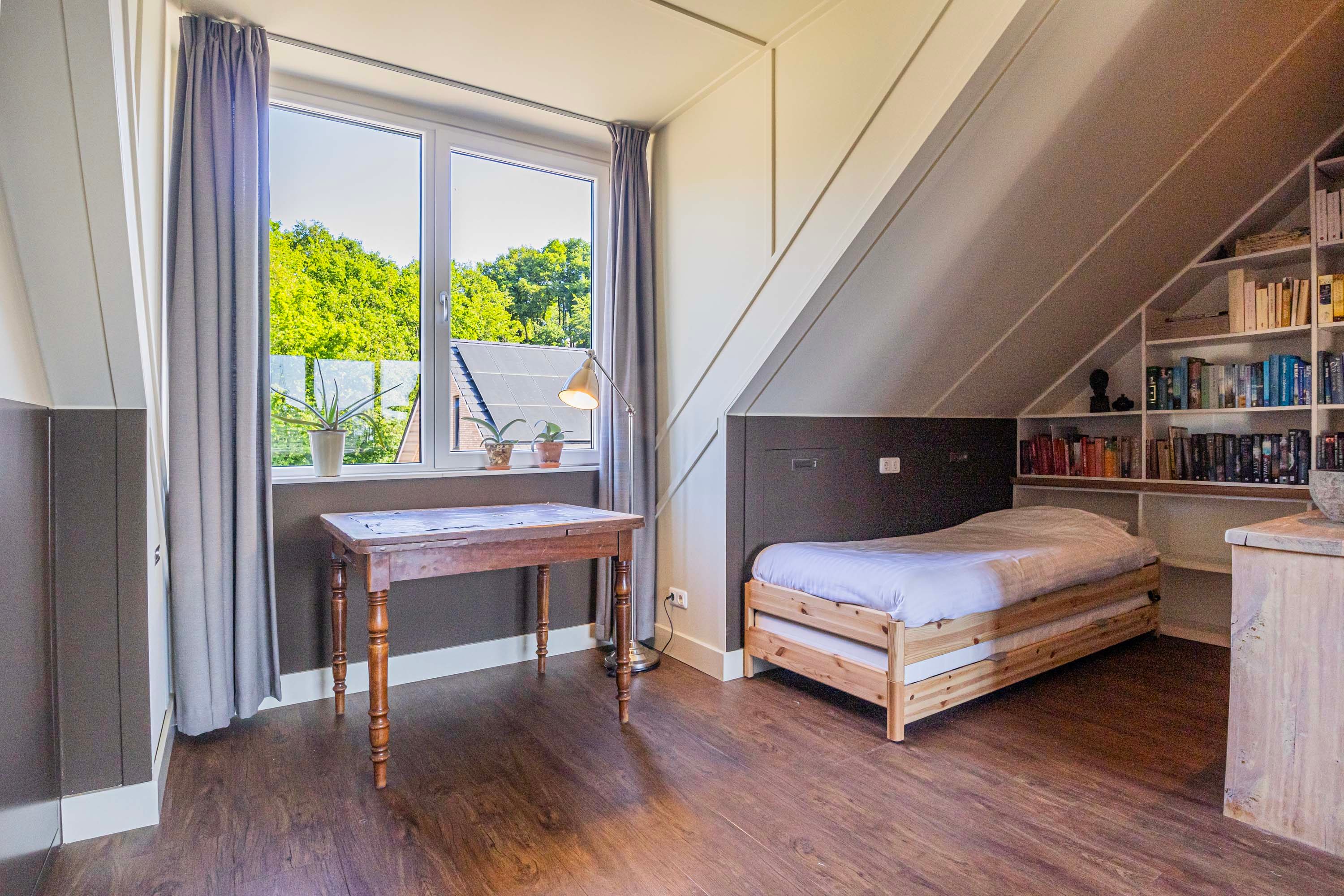 Twee dakkapellen zorgen voor extra ruimte, lichtinval en een aangename, open sfeer, waardoor deze verdieping zich uitstekend leent voor meerdere doeleinden