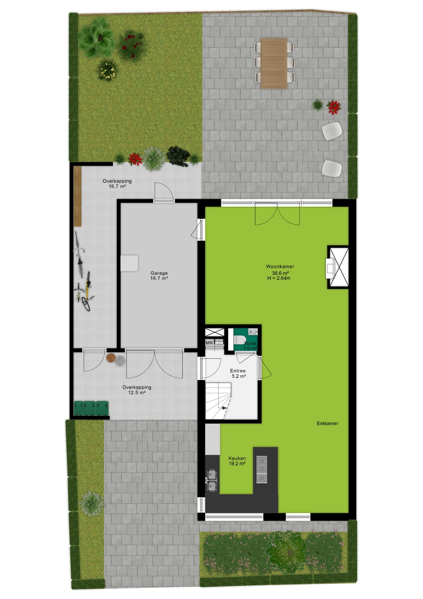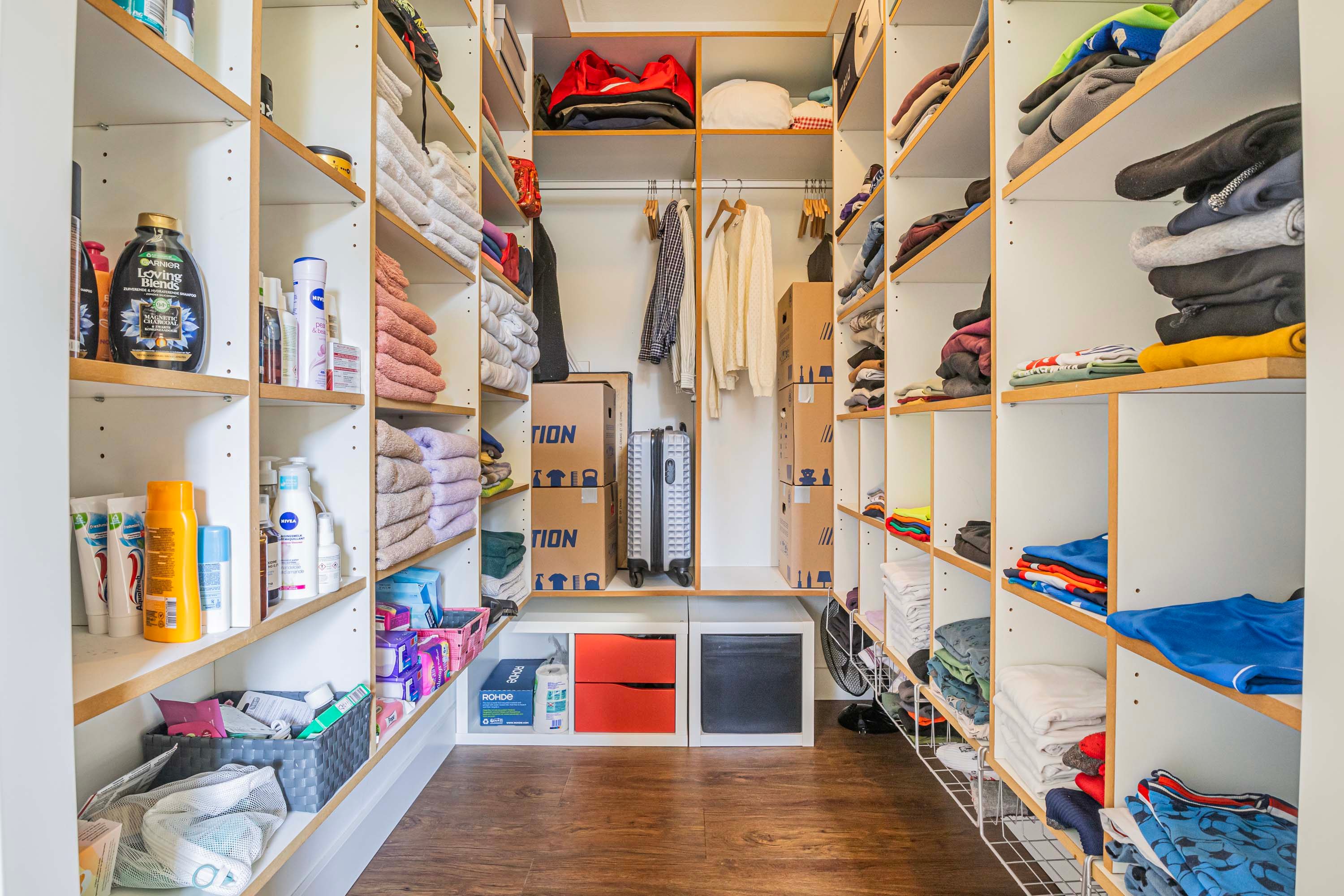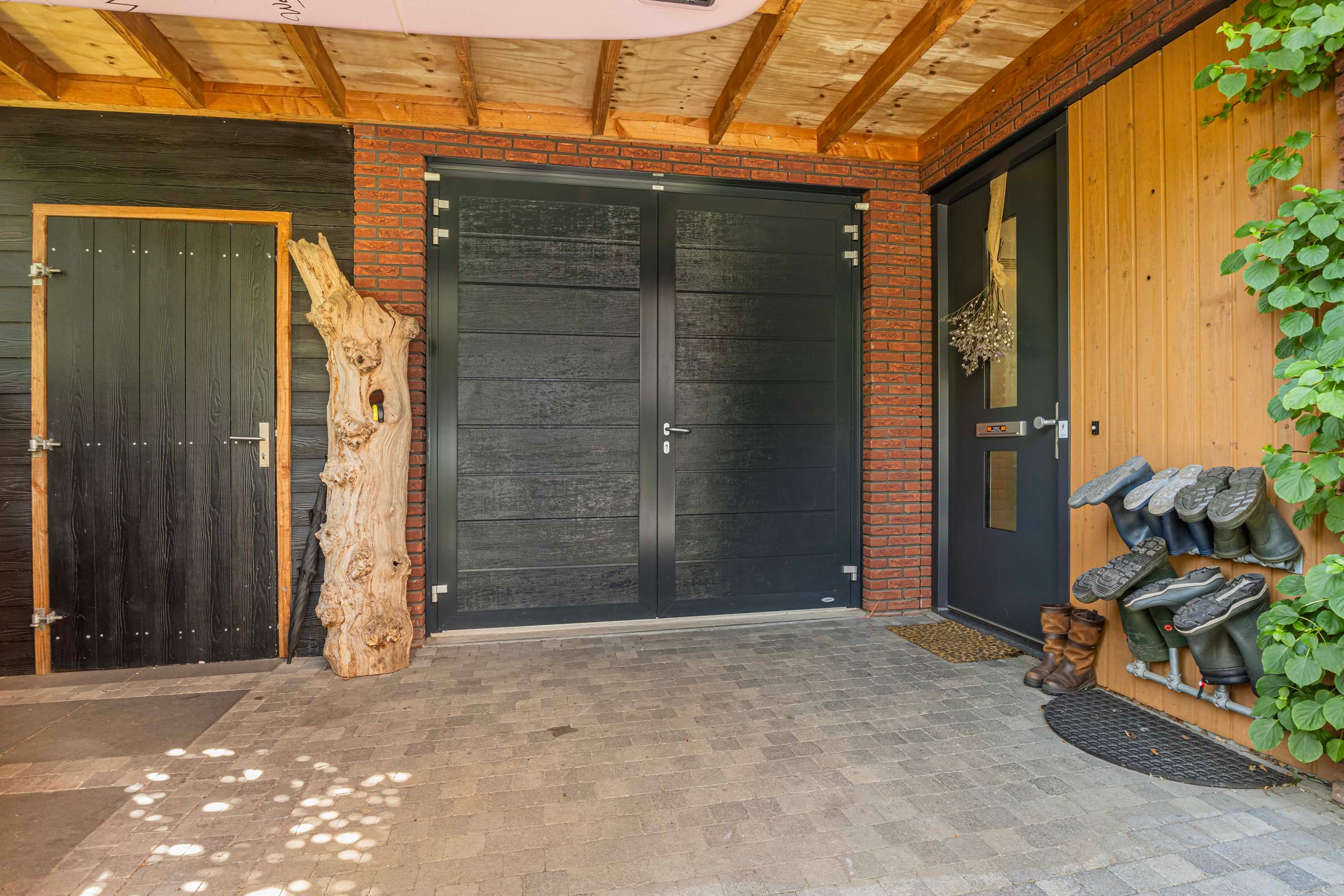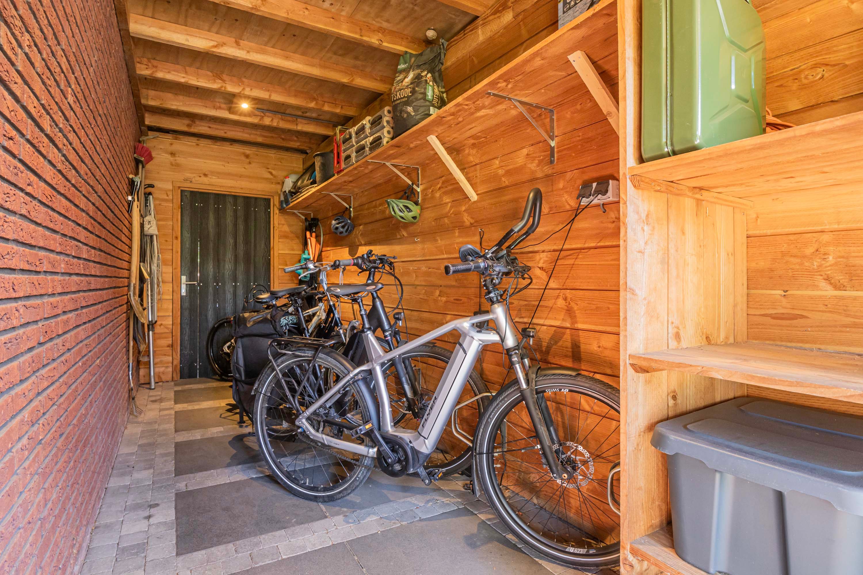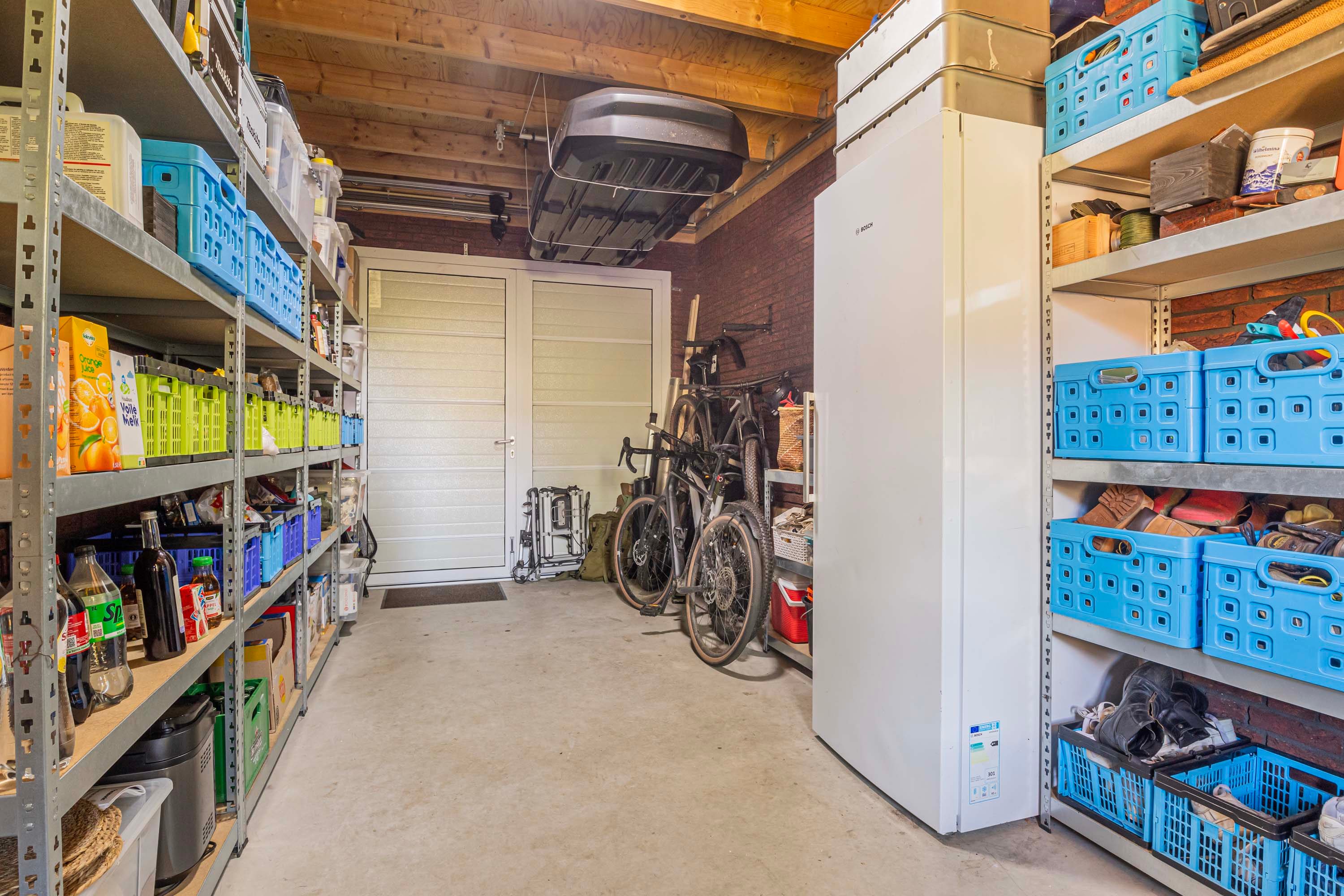 Ook aan praktische zaken is gedacht. De woning beschikt over een ruime garage van ca. 17 m², met een achterdeur naar de tuin én directe toegang tot de woonkamer – ideaal voor dagelijks gebruik. Rondom de garage bevindt zich bovendien een extra overdekte opslagruimte, perfect voor het stallen van fietsen, tuinmeubilair of gereedschap. Deze ruimte is toegankelijk via een deur aan de voorzijde en loopt door naar de achterkant van de tuin.