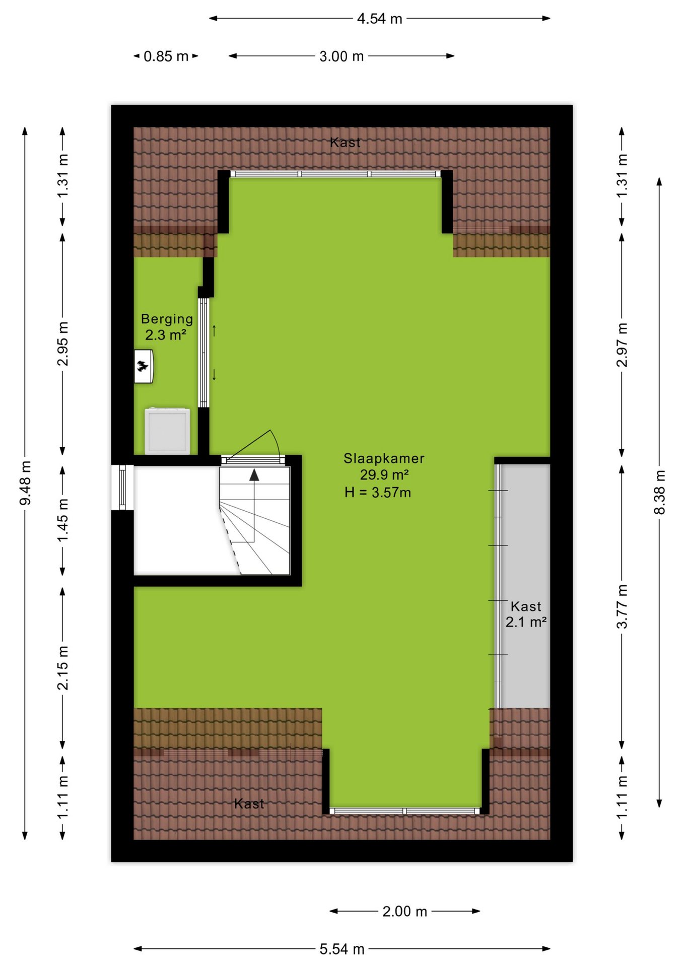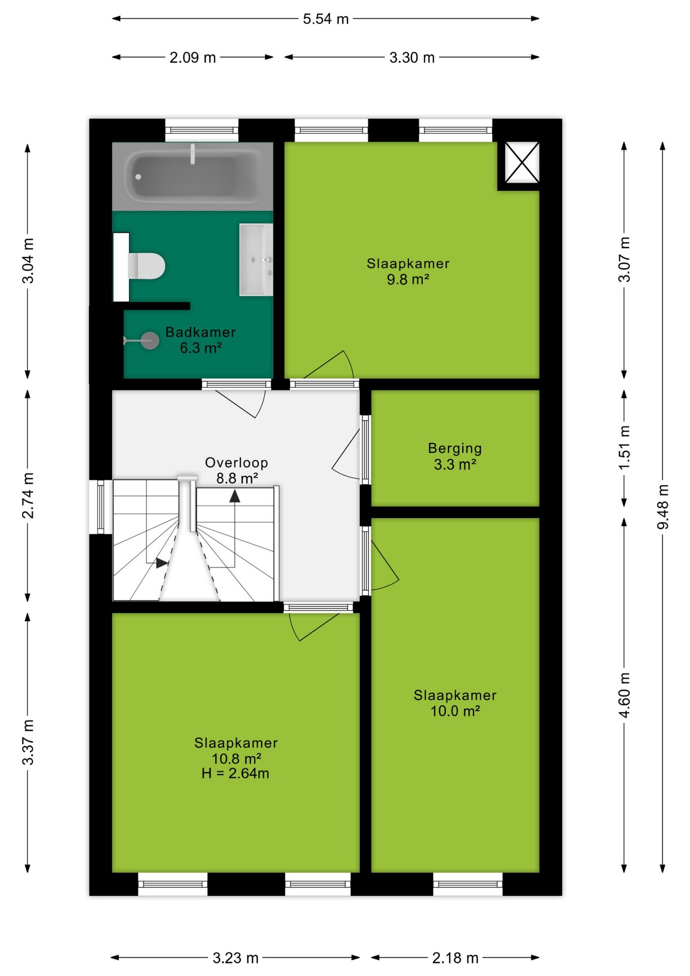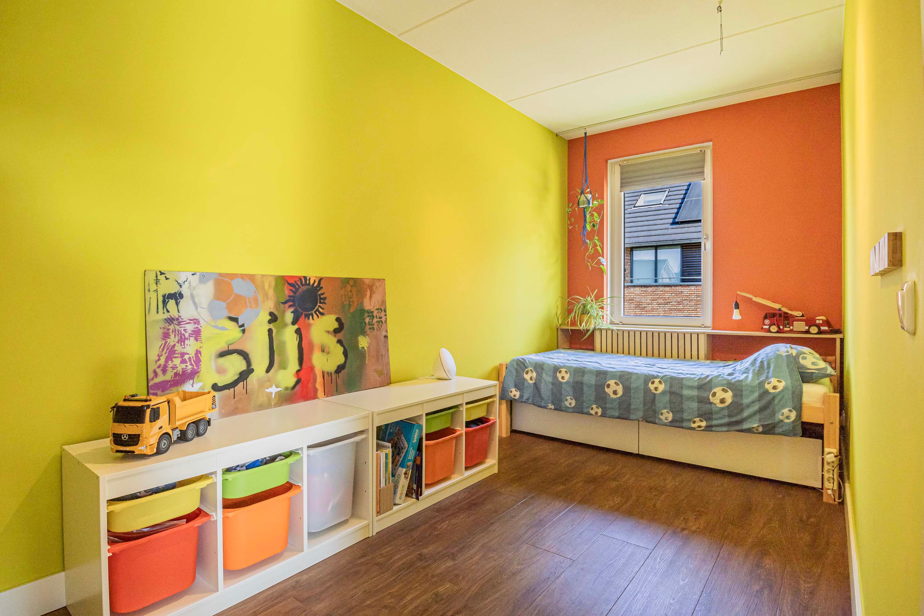 Er zijn op deze verdieping drie slaapkamers. De grootste slaapkamer (ca. 11 m²) ligt aan de voorzijde van de woning. Ook de tweede slaapkamer (ca. 10 m²) bevindt zich aan de voorzijde, terwijl de derde slaapkamer (ca. 10 m²) aan de achterzijde ligt. Daarnaast is er nog een extra kamer (ca. 3 m²) die is ingericht als inloopkast – ideaal voor het netjes opbergen van al je kleding.
