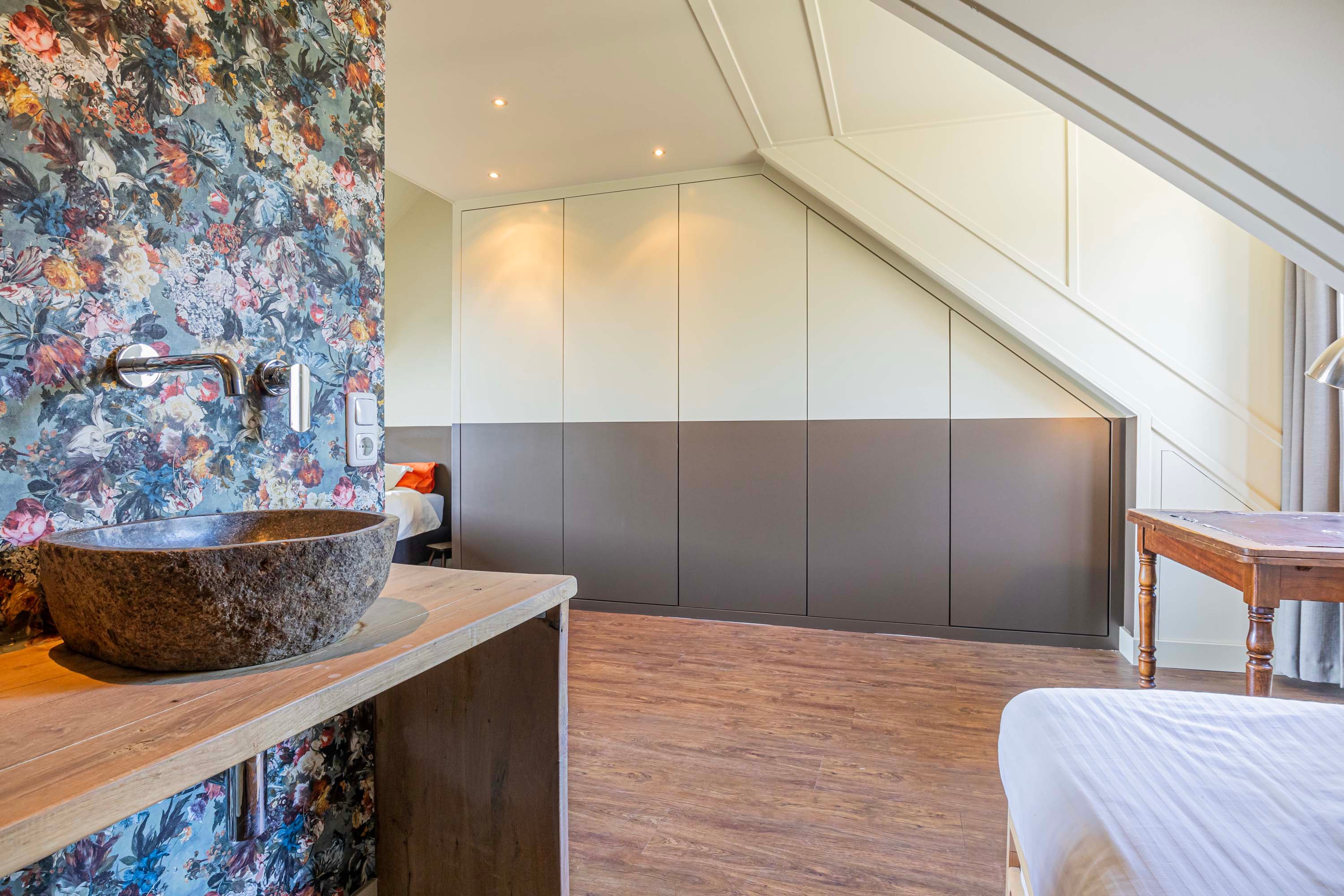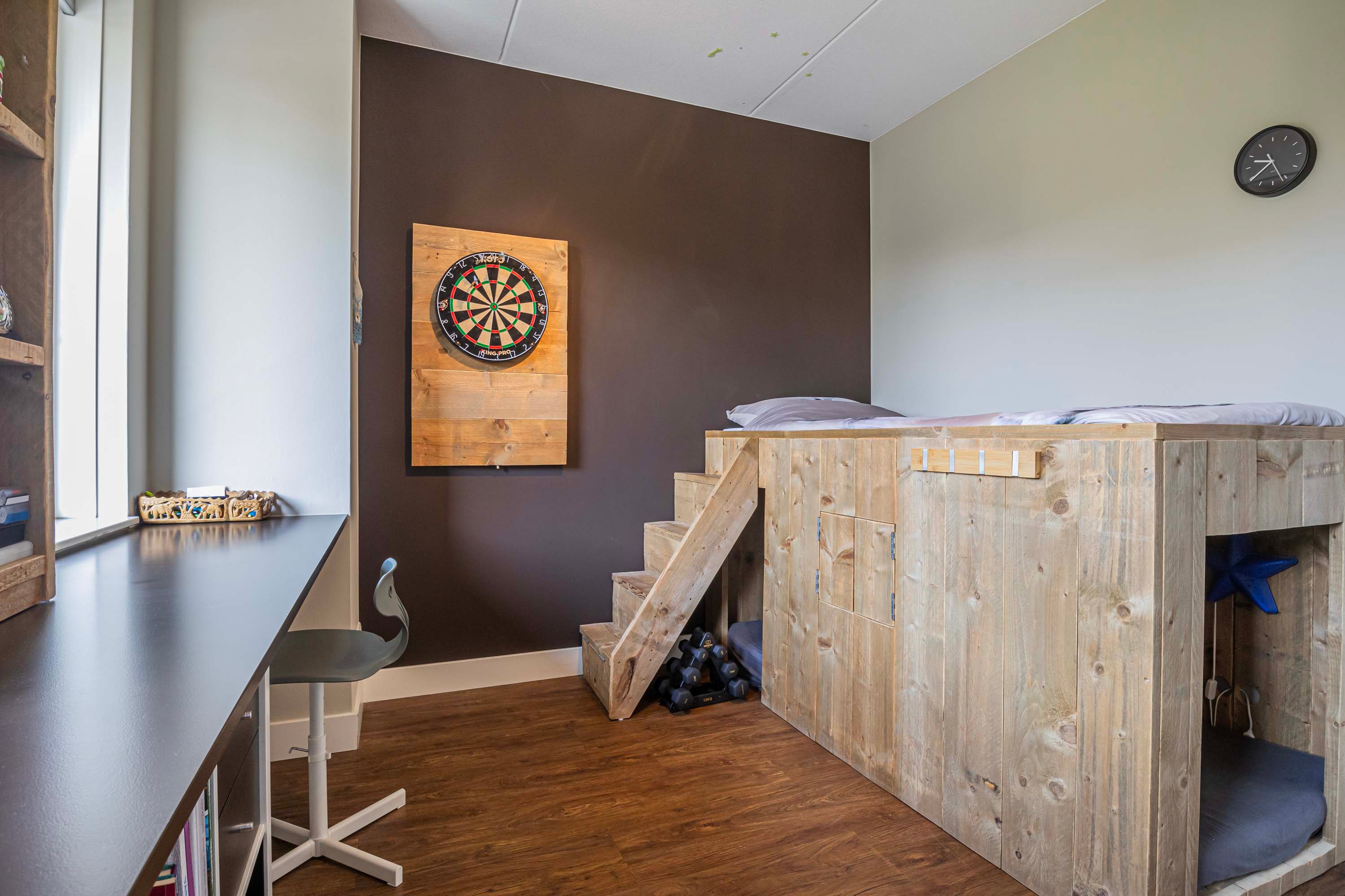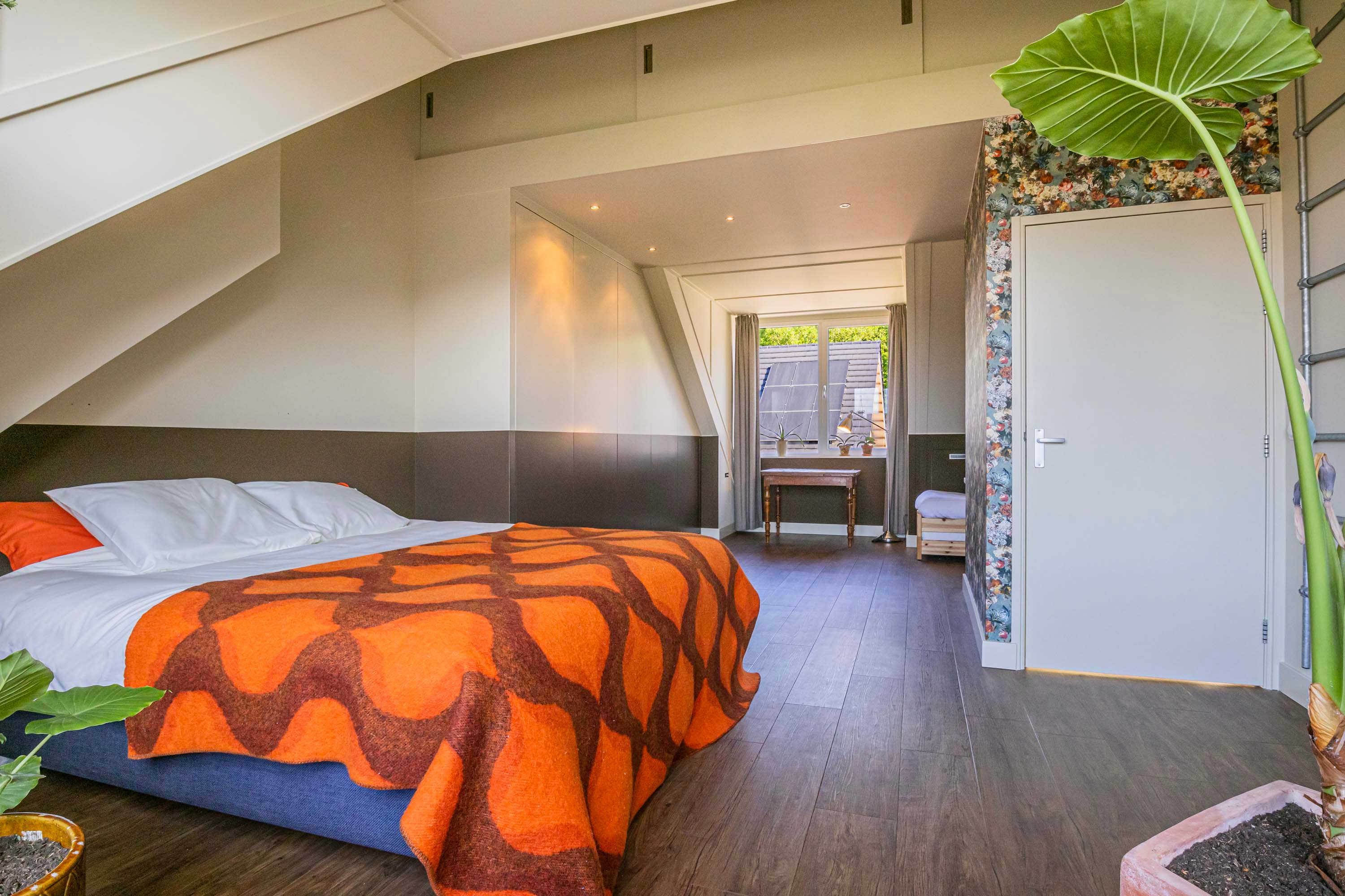 De zolderverdieping is verrassend ruim en biedt een vierde slaapkamer van maar liefst ca. 30 m². Deze kamer is voorzien van een nette inbouwkast, een logeergedeelte en een eigen wastafel – perfect als ouderslaapkamer, studio of werkruimte.